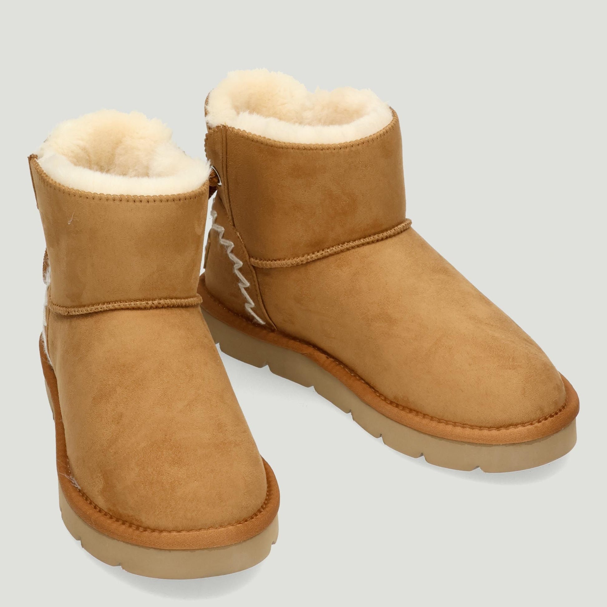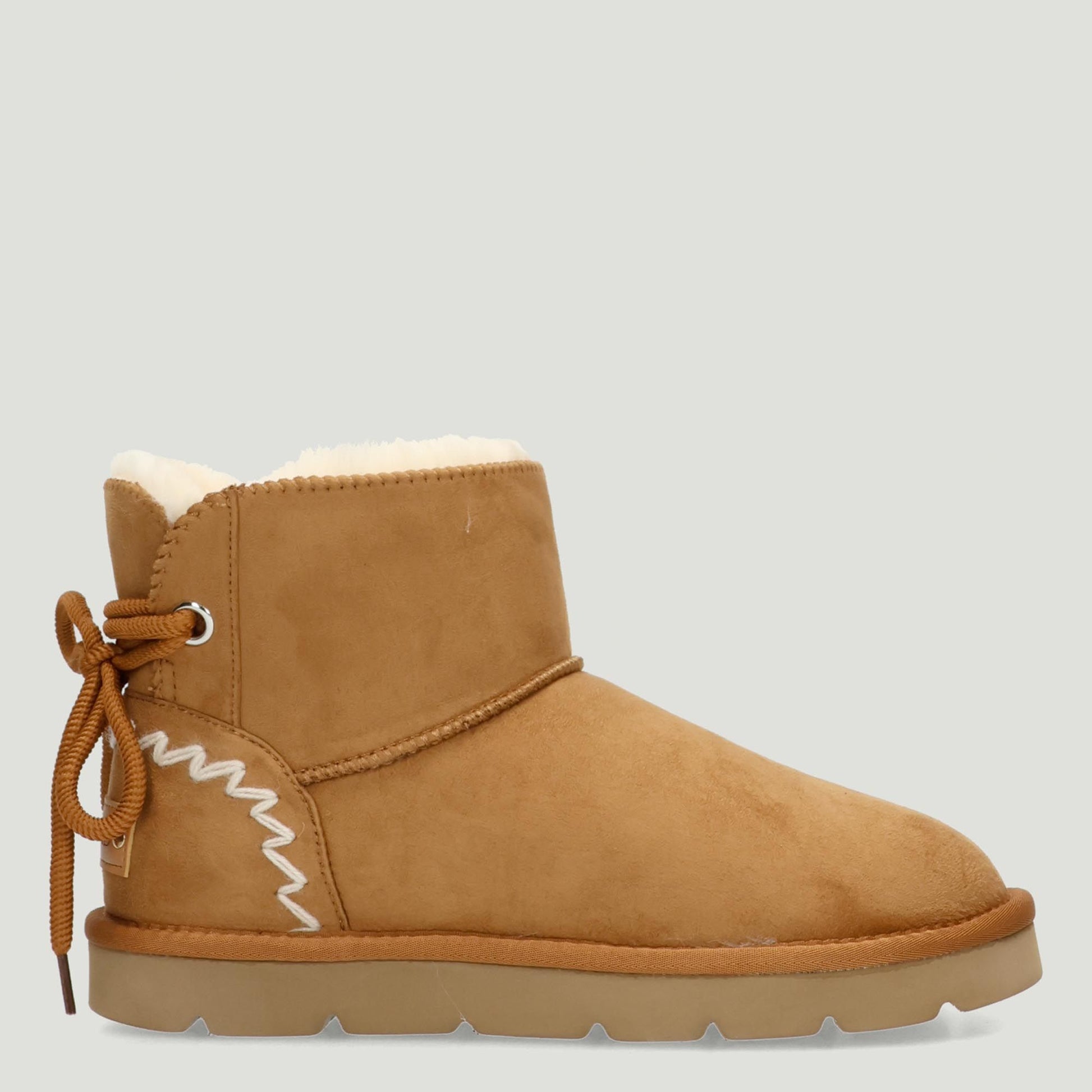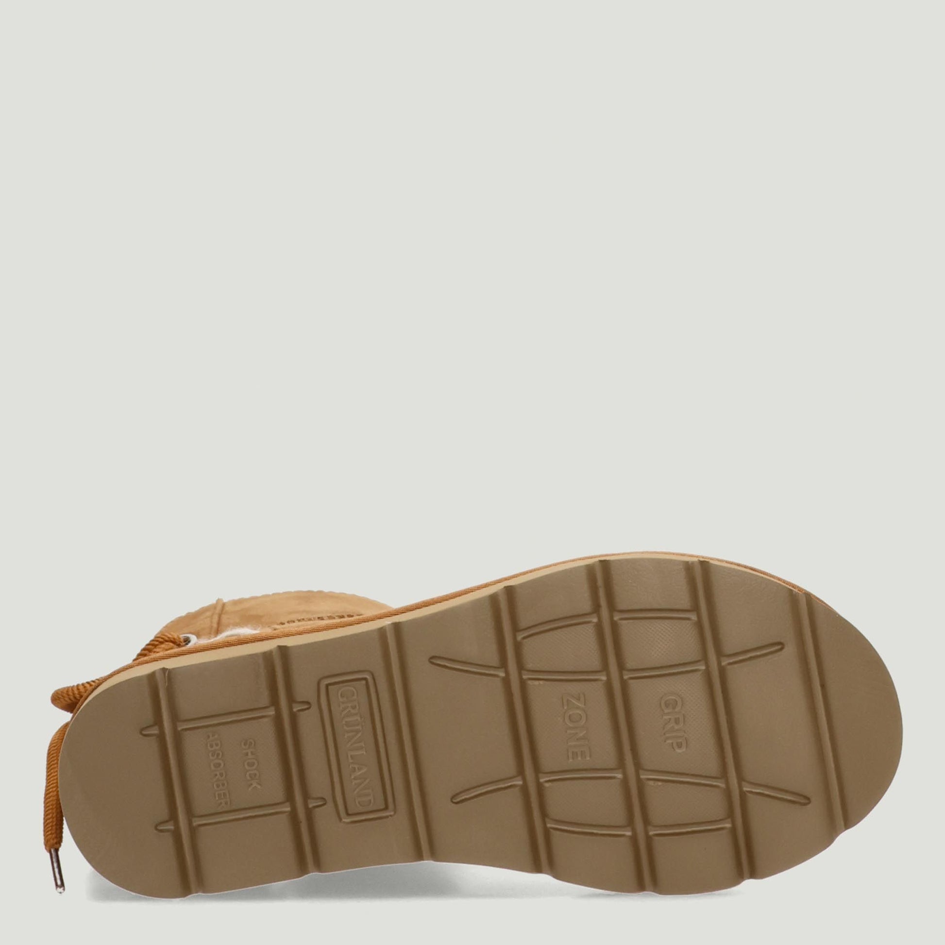 Stivaletto con tomaia in alcantara in colore cuoio. Regolazione posteriore sul gambale con laccio in cotone. Interno in ecopelo avorio. Logo sul tallone. Suola in gomma di 3 cm. Collezione Griunland donna Autunno/Inverno.