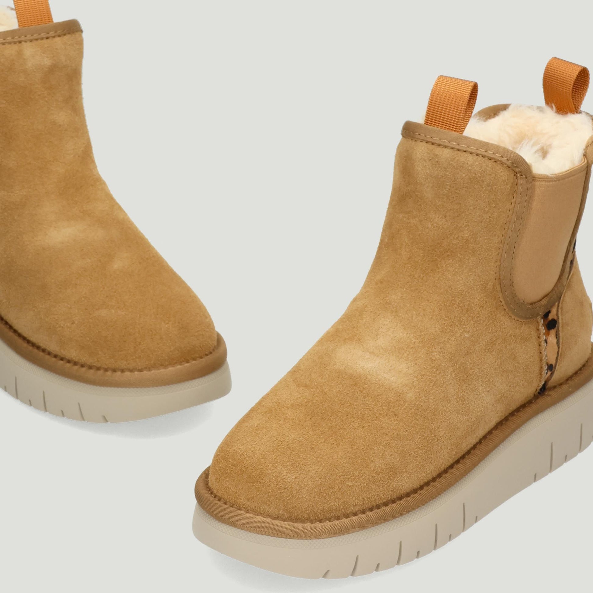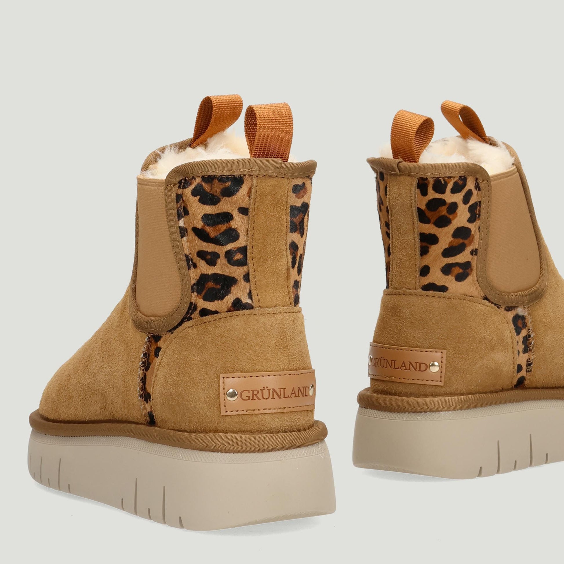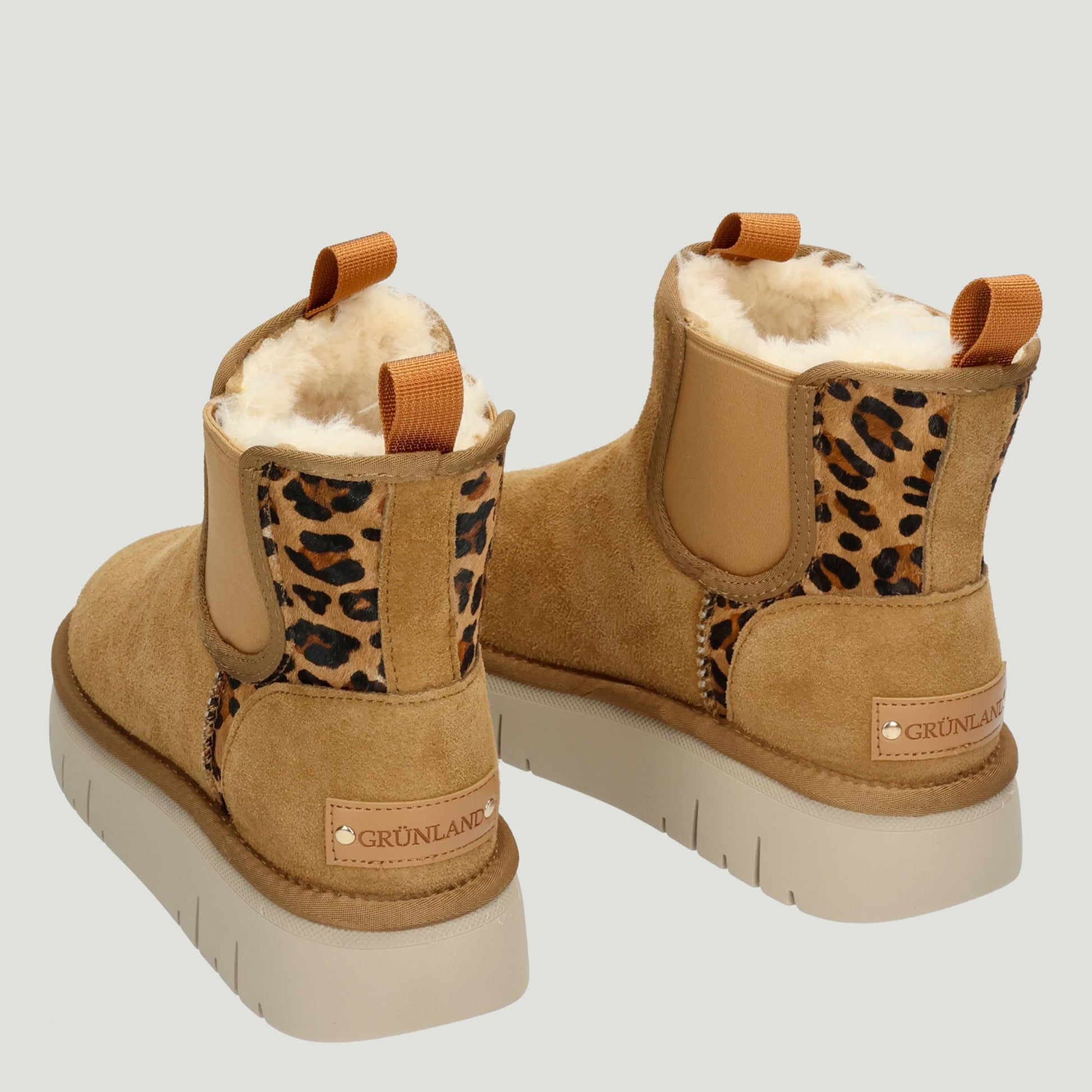 Stivaletto in pelle scamosciata cuoio con tallone in cavallino maculato. Elastici laterali con profilo in tinta. Logo in pelle nel tallone. Interno in ecopelo. Suola in gomma platform di 4 cm. Collezione Grunland donna Autunno/Inverno.