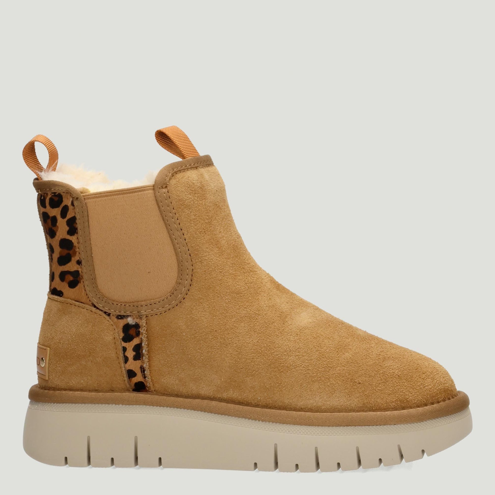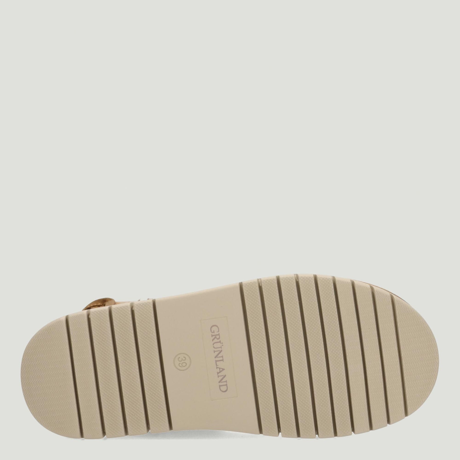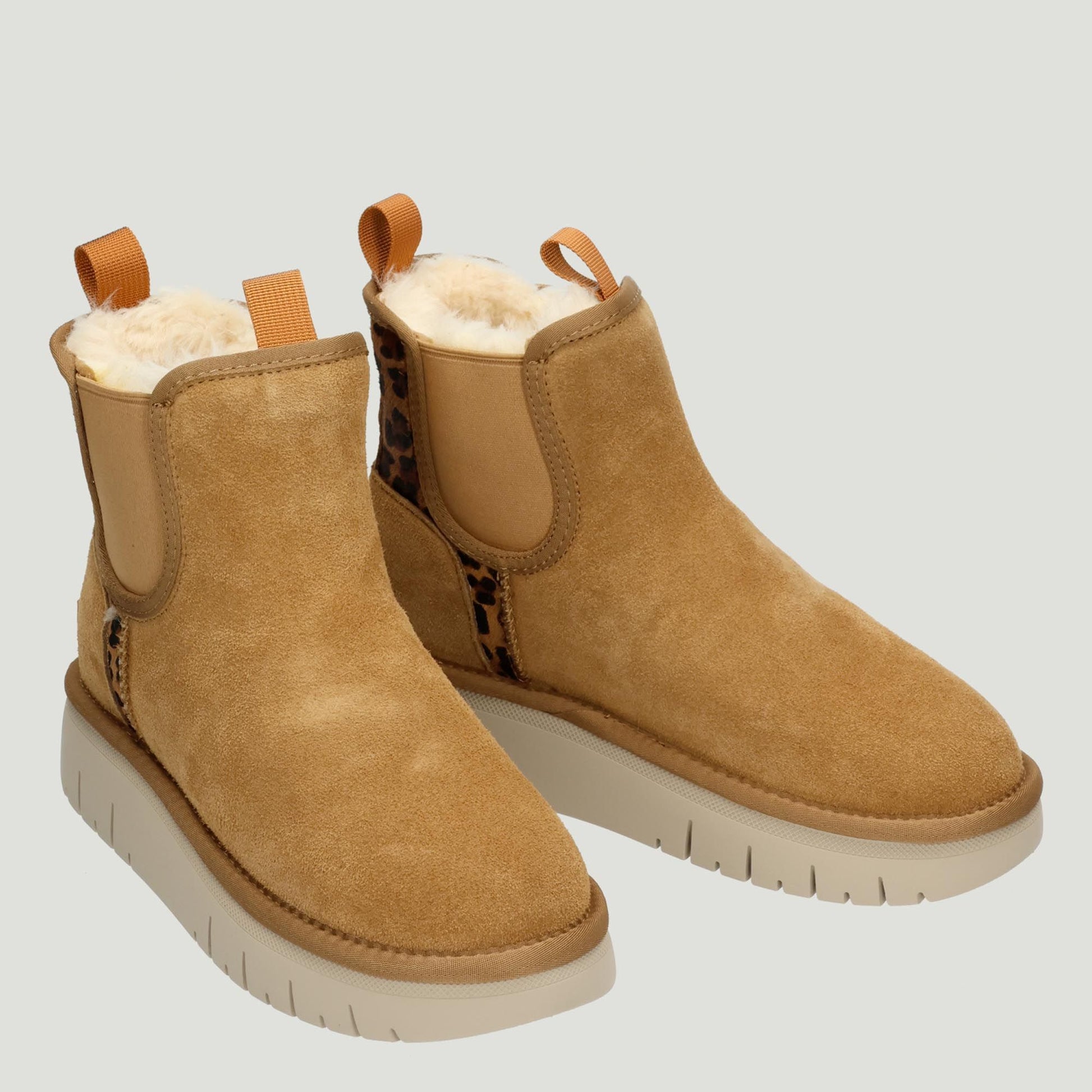 Stivaletto in pelle scamosciata cuoio con tallone in cavallino maculato. Elastici laterali con profilo in tinta. Logo in pelle nel tallone. Interno in ecopelo. Suola in gomma platform di 4 cm. Collezione Grunland donna Autunno/Inverno.