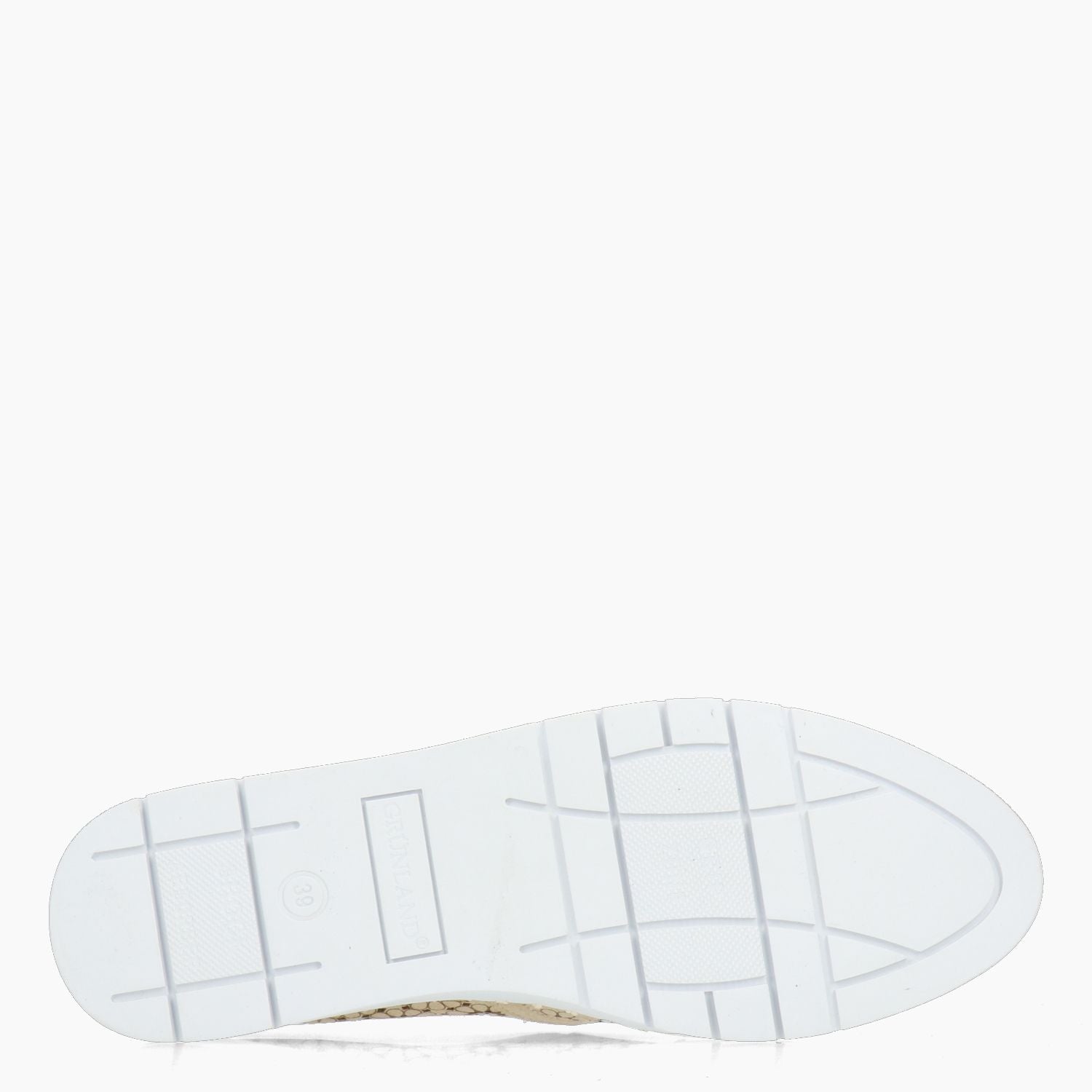 Sneakers slip-on Grunland in tessuto laminato oro traforato. Interno in ecopelle con sottopiede re-soft estraibile in pelle. Suola in gomma di 3 cm. Collezione Grunland donna Primavera/Estate.