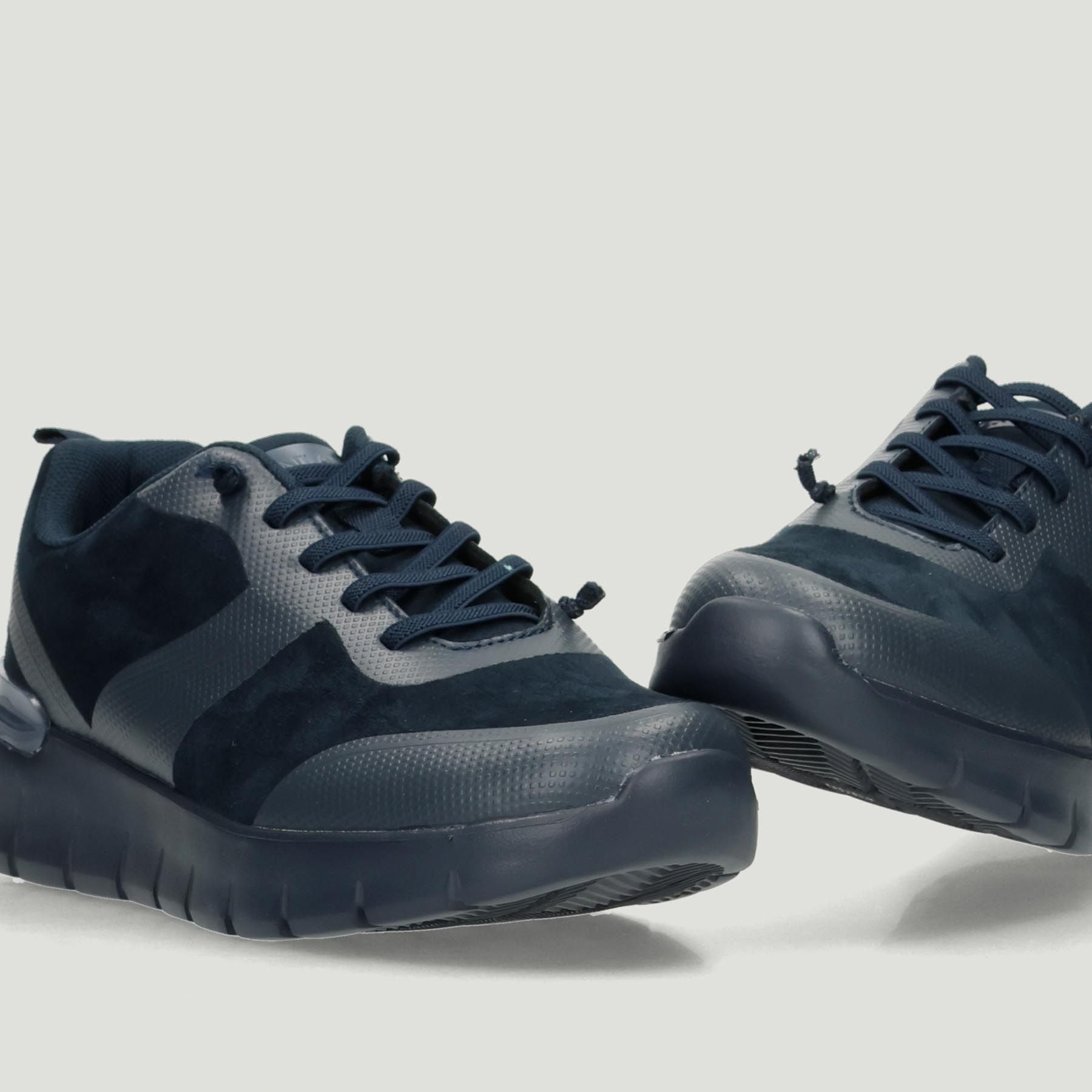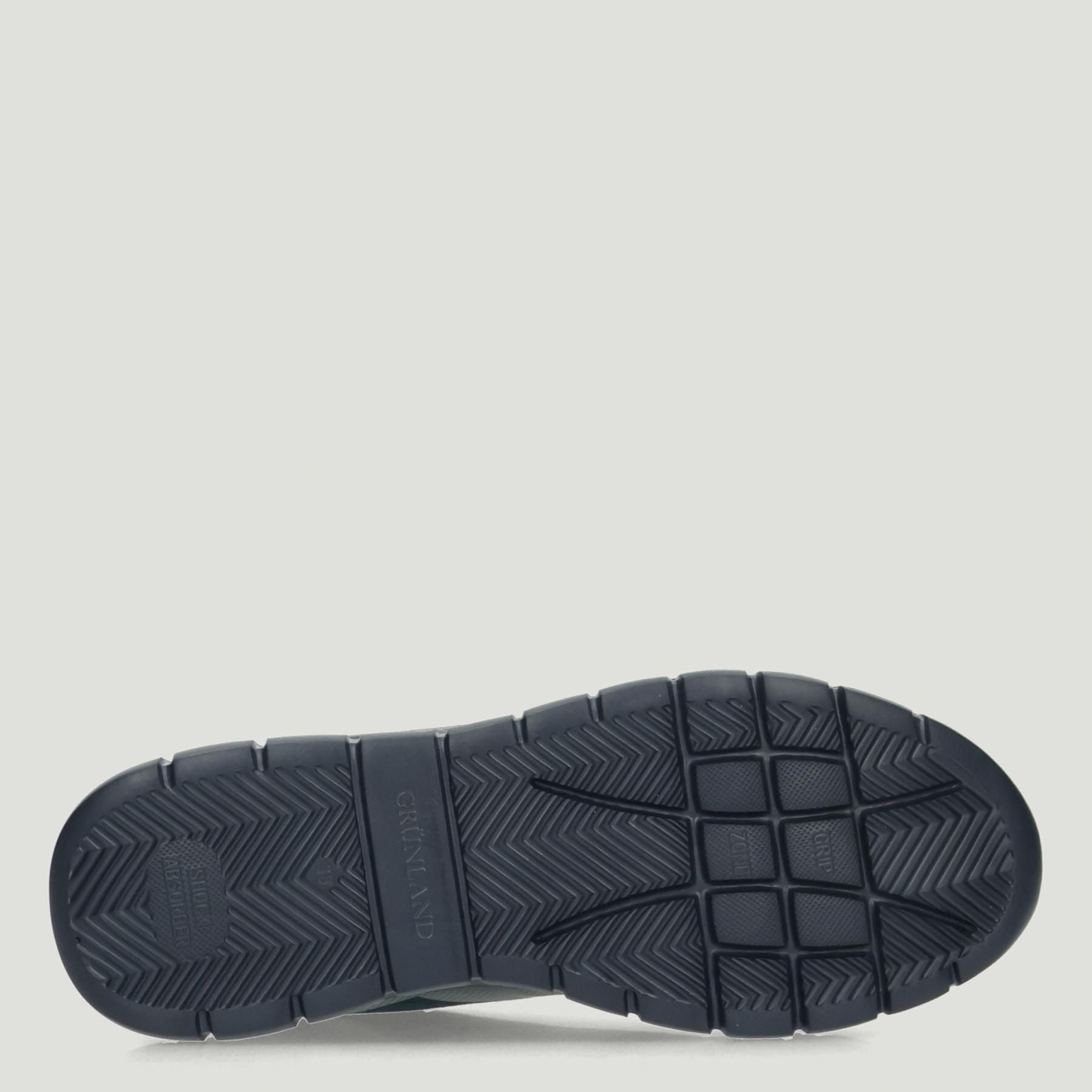 Sneaker Grunland in ecosuede blu con riporti gommati. Chiusura con lacci in elastico. Interno in tessuto con sottopiede Re-Soft in pelle. Suola in gomma. Collezione Grunland donna Autunno/Inverno.