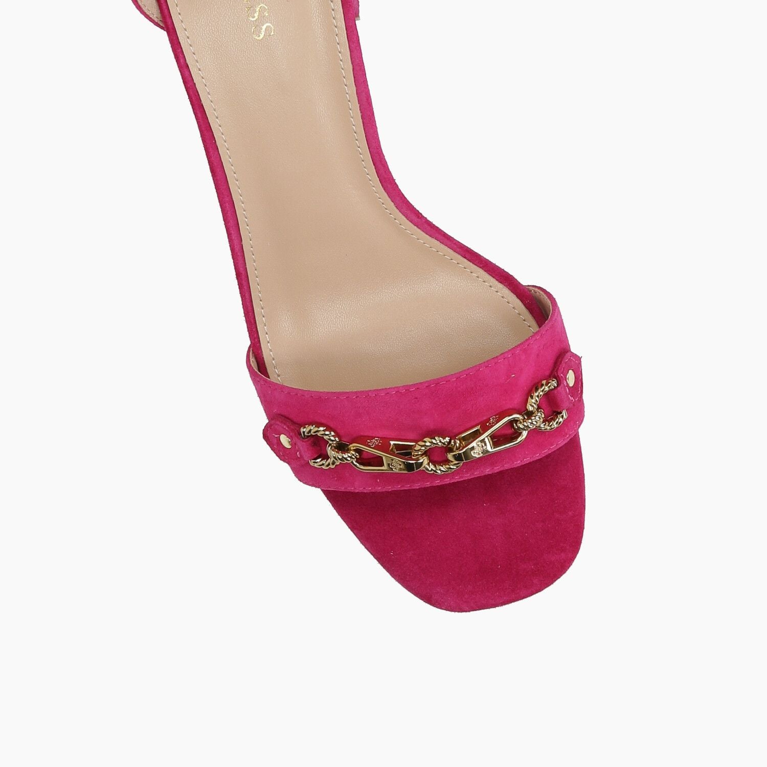 Sandali in camoscio fuxia con catena dorata e cinturino alla caviglia, fondo gomma.