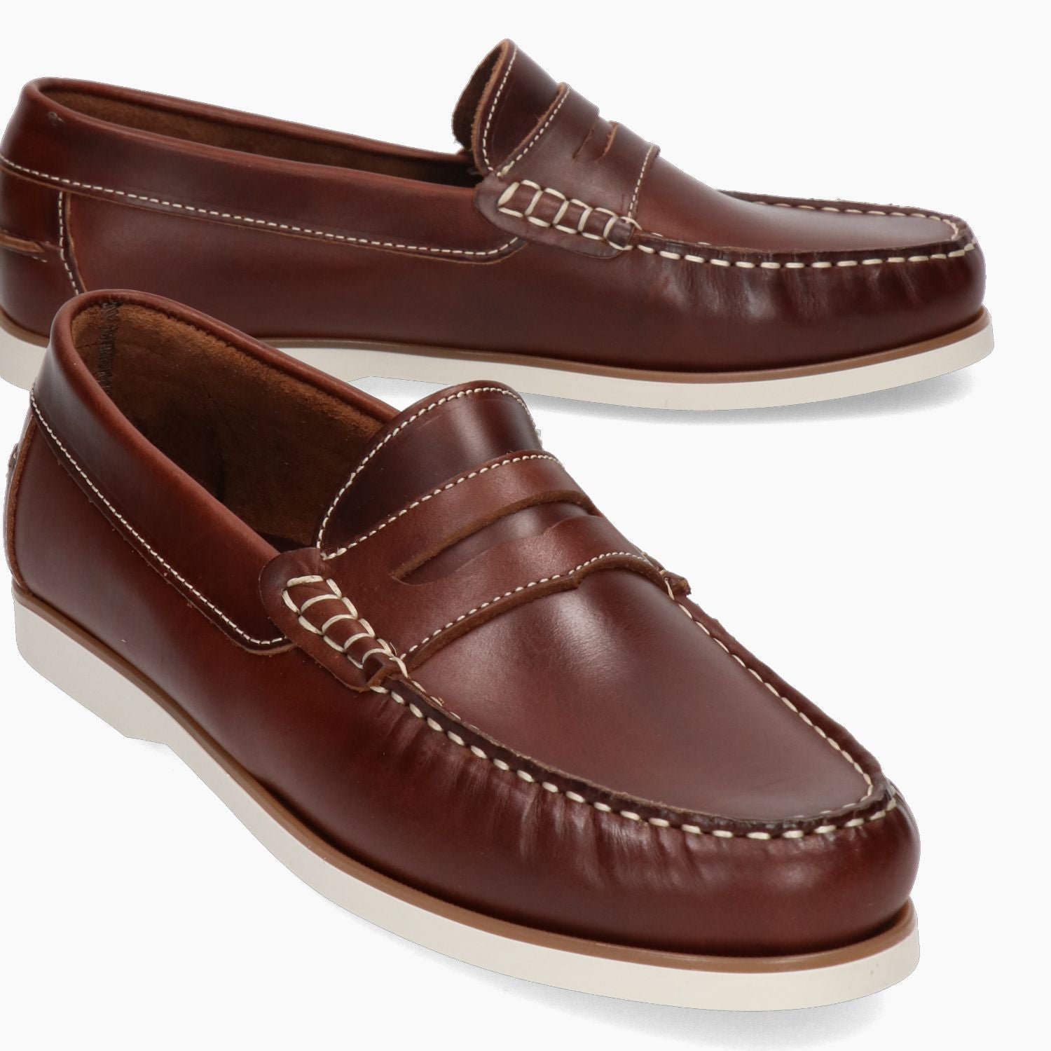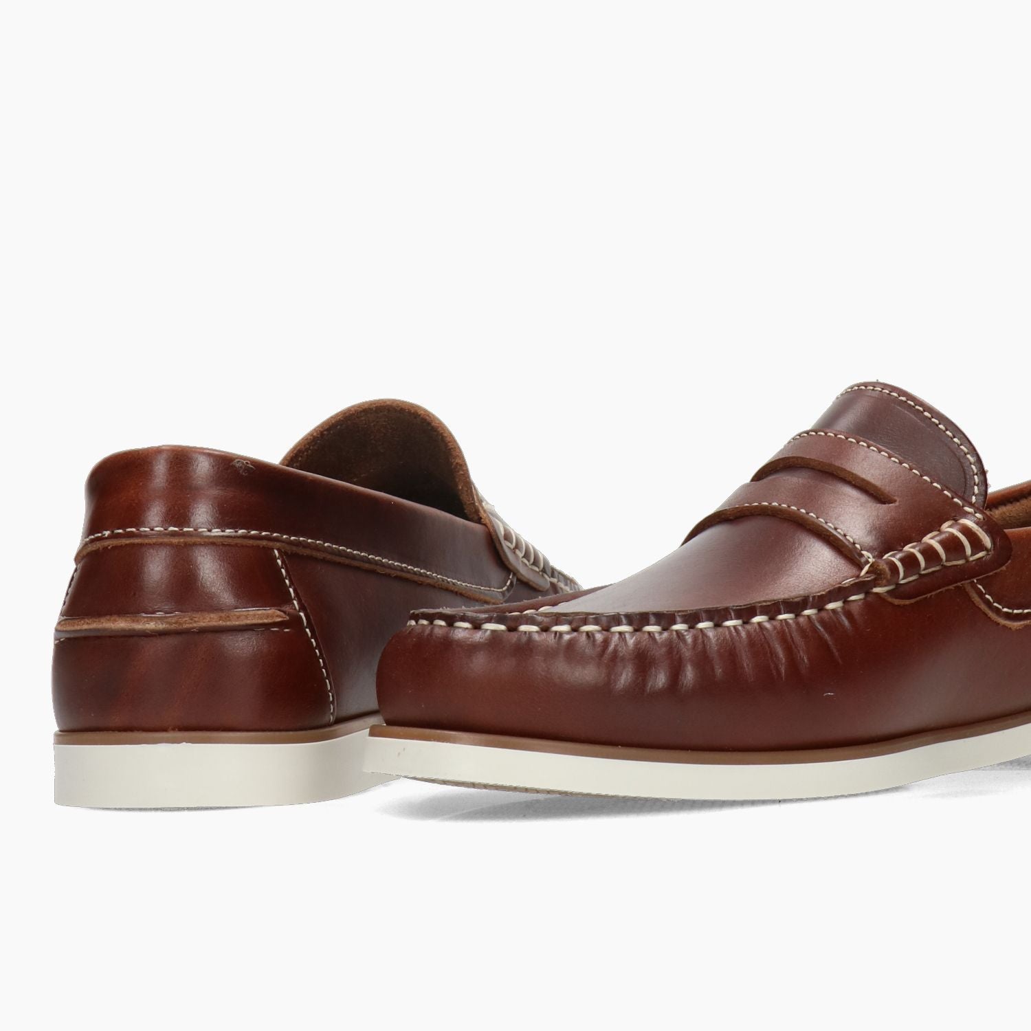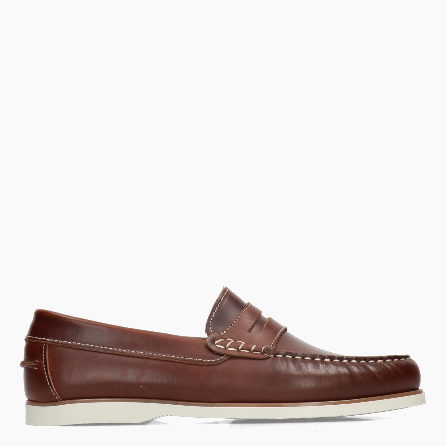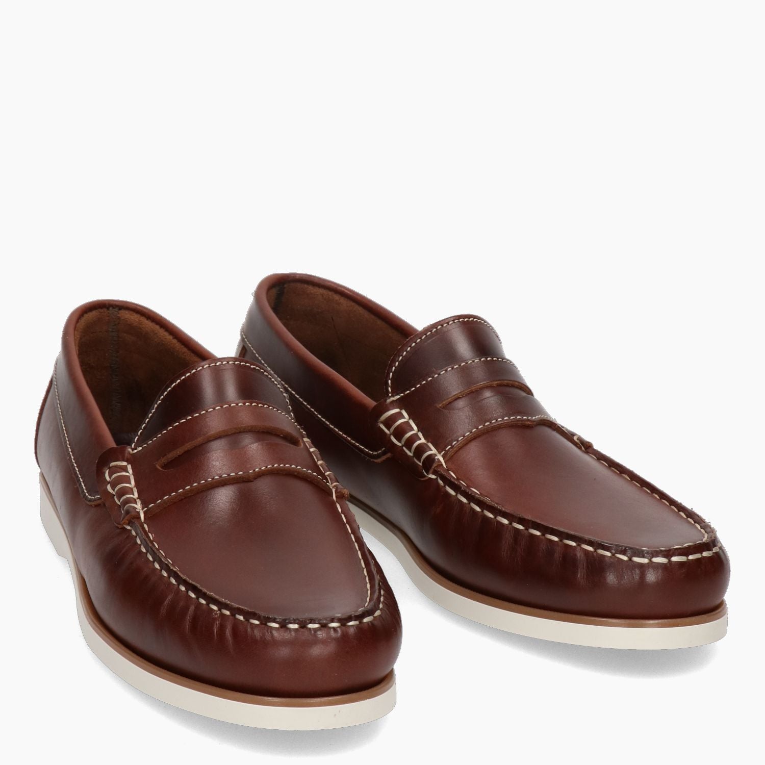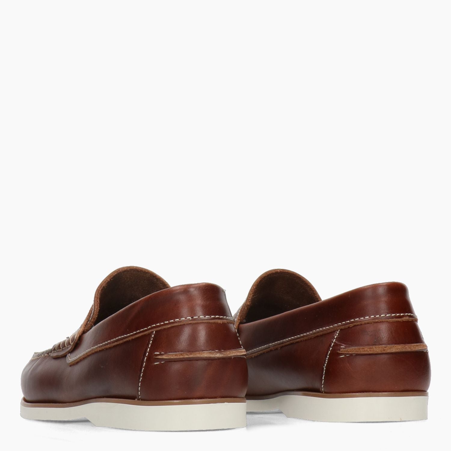 Mocassini in pelle marrone con cuciture contrastanti chiare. Interno in pelle. Suola in gomma avorio con tacco di 1 cm. Collezione Hold uomo Primavera/Estate.