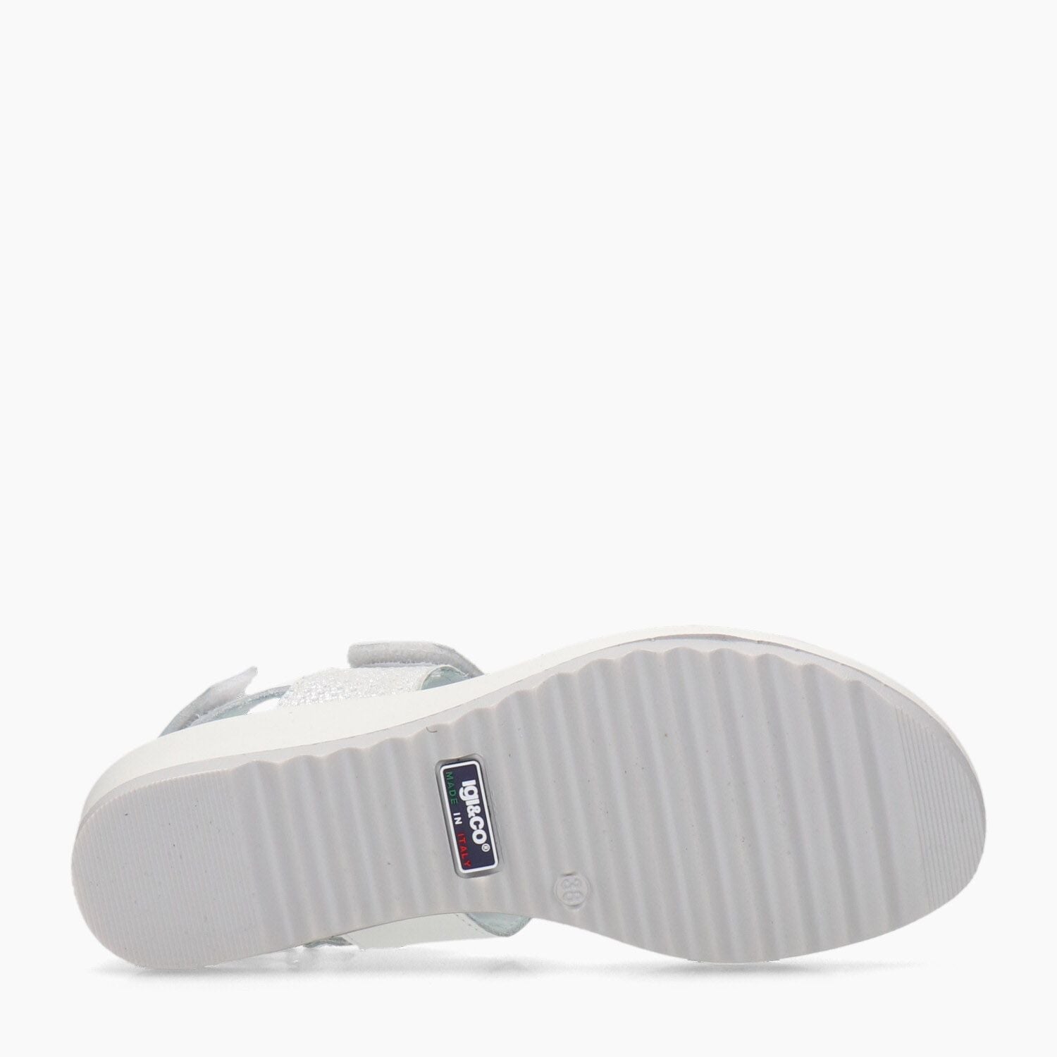Sandali in pelle bianca e argento, chiusura con velcro, fondo gomma.