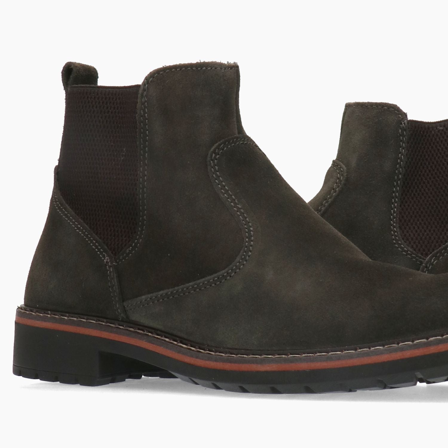 Stivaletti in pelle scamosciata in colore caffe'. Punta tonda. Elastici laterali in tinta. Interno in tessuto. Soletta interna in pelle rimovibile. Suola in gomma con tacco di 3 cm. Collezione Igi &Co uomo Autunno/Inverno.