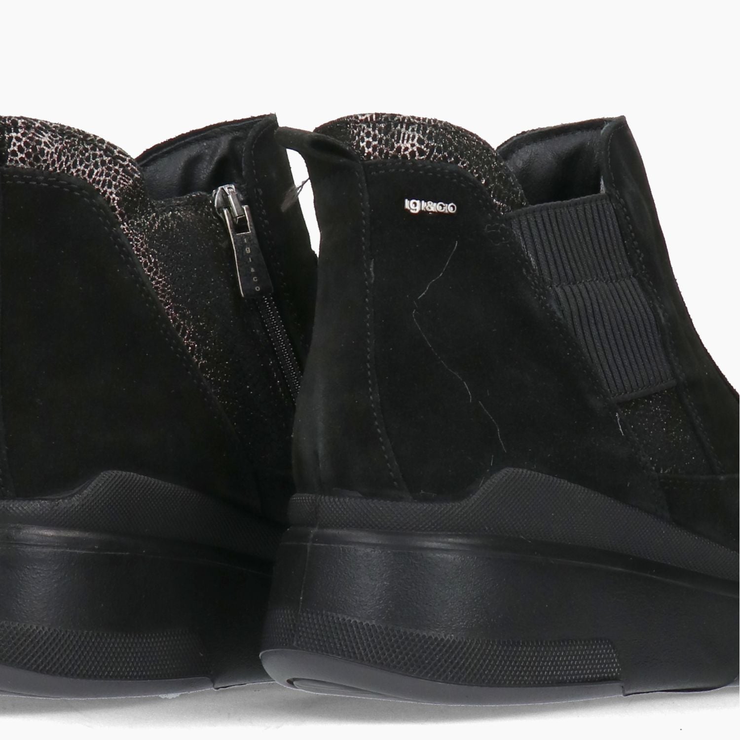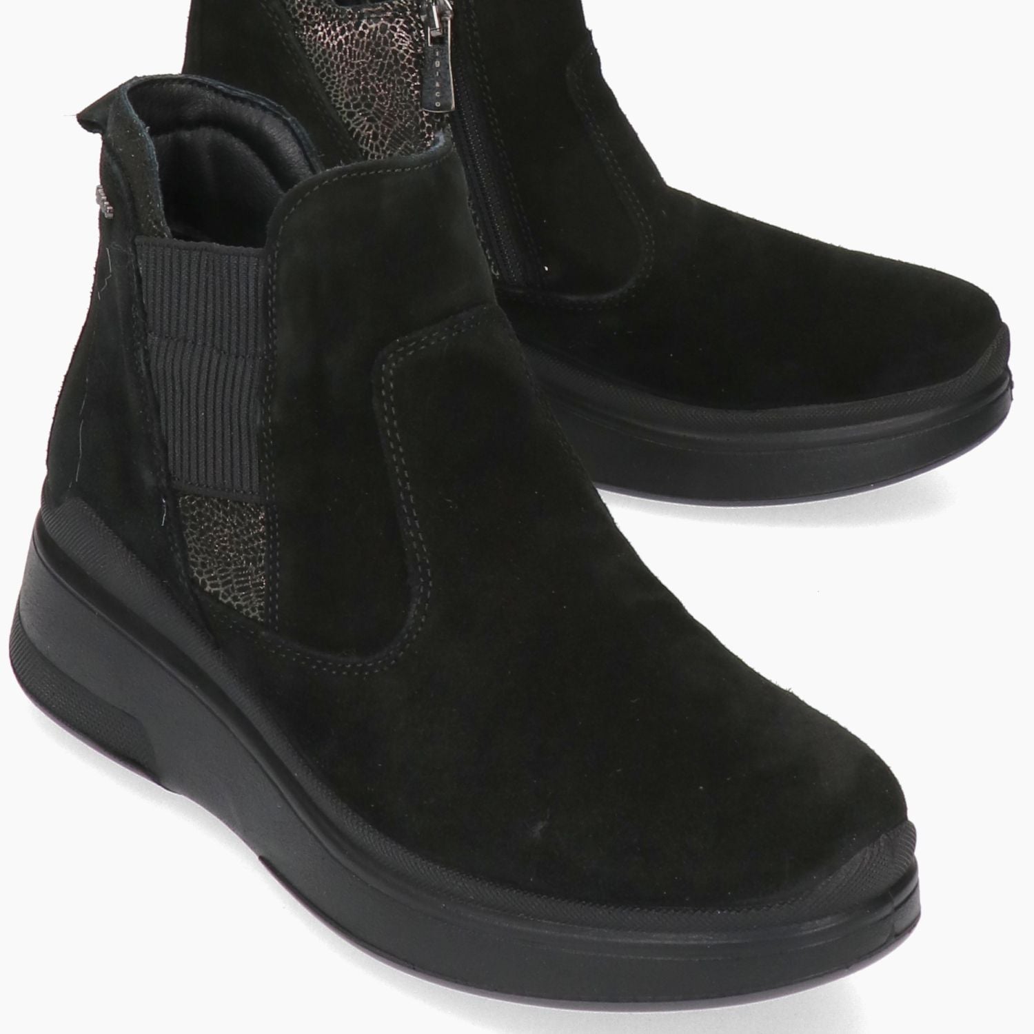 Stivaletto Igi&Co con tomaia in pelle scamosciata nera. Punta tonda. Chiusura con zip laterale. Piccola apertura laterale con elastico. Interno in tessuto con sottopiede rimovibile. Zeppa in gomma di 4,5 cm. Collezione Igi&Co donna Autunno/Inverno.
