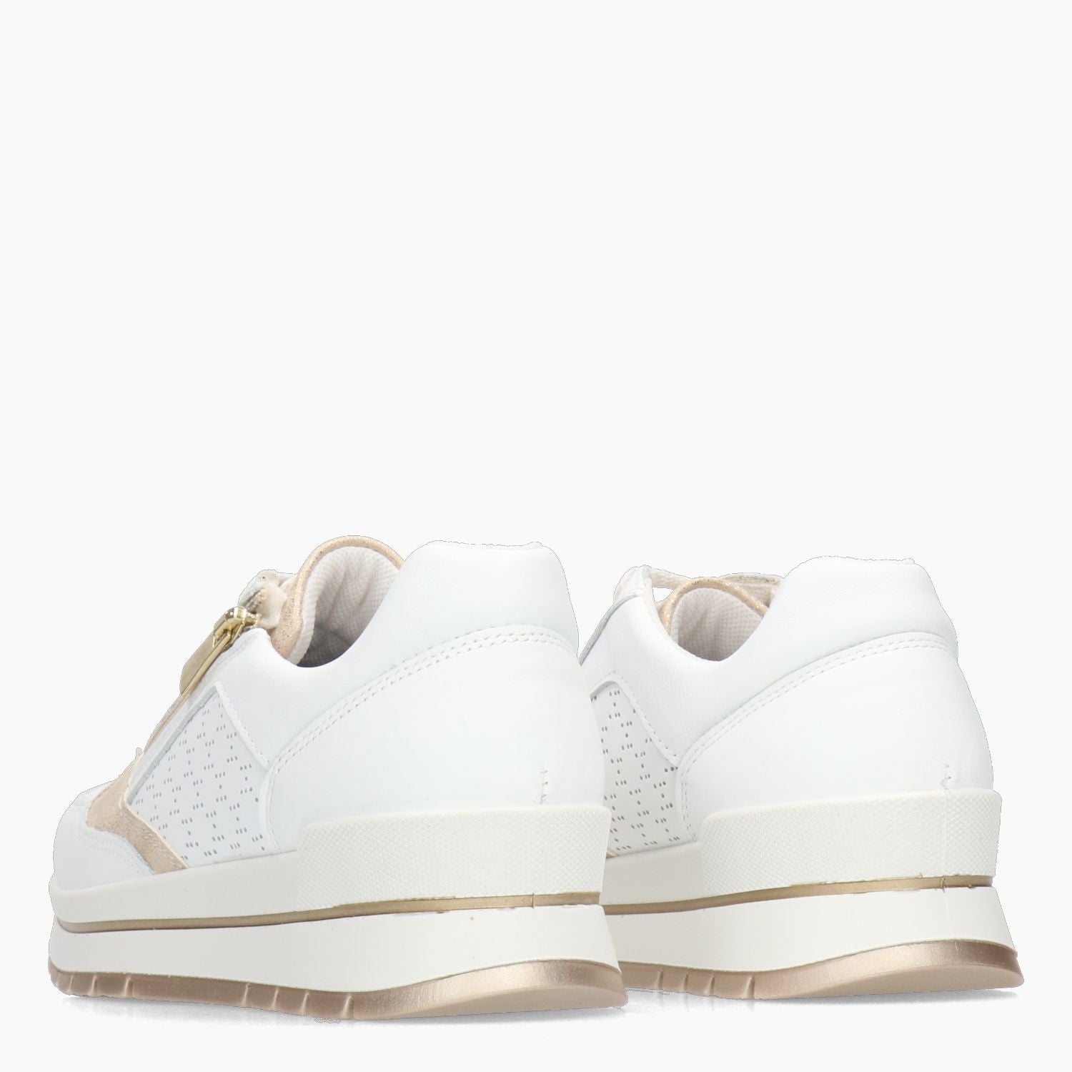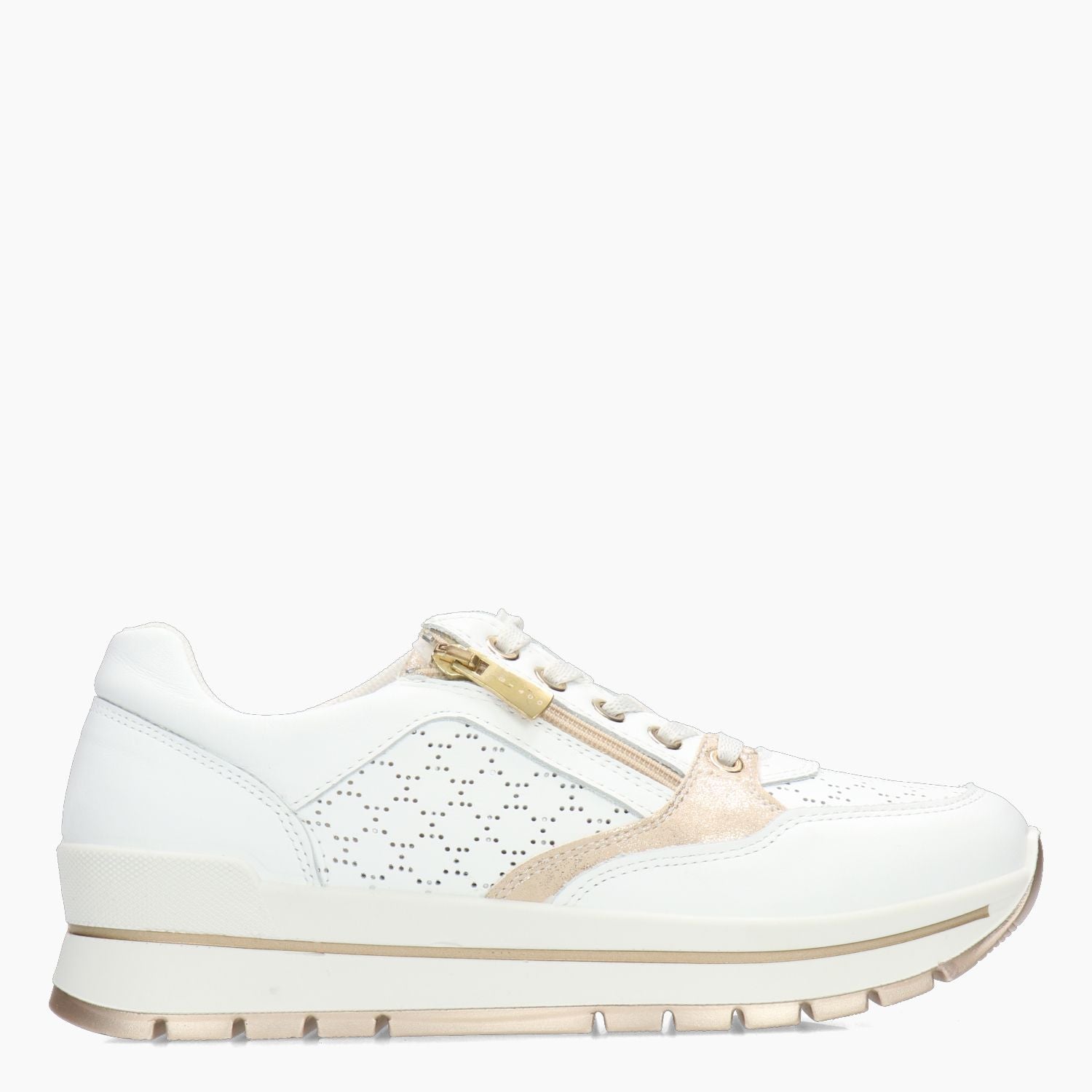 Sneakers Igi&Co con tomaia in pelle bianca traforata con riporti in pelle laminata oro. Chiusura con lacci e zip laterale. Linguetta con logo. Soletta rimovibile in vera pelle con memory foam. Suola in gomma di 5 cm. Collezione Igi&Co donna Primavera/Estate.