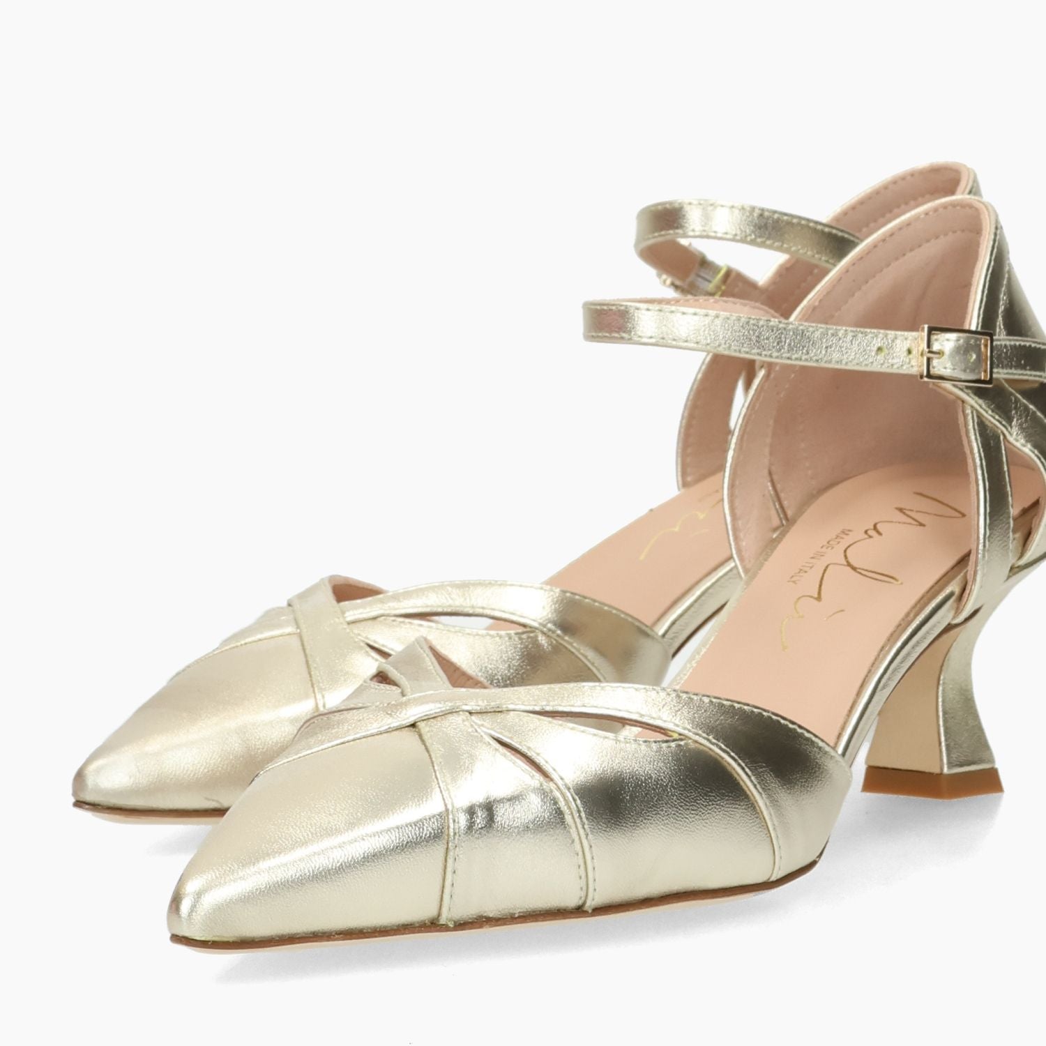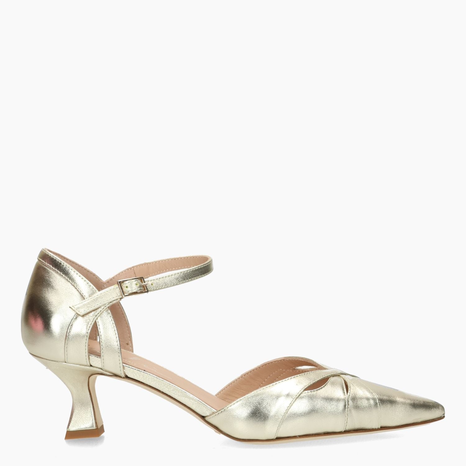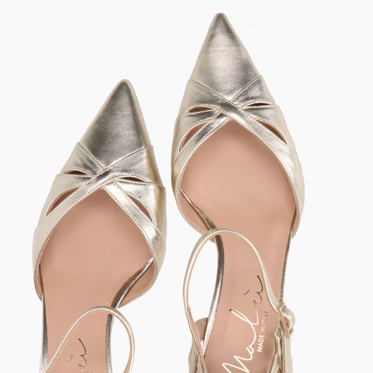Decollete aperto ai lati in pelle laminata oro. Cinturino con fibbia regolabile. Interno in pelle. Suola in cuoio. Tacco di 5 cm. Collezione Malu' donna Primavera/Estate.