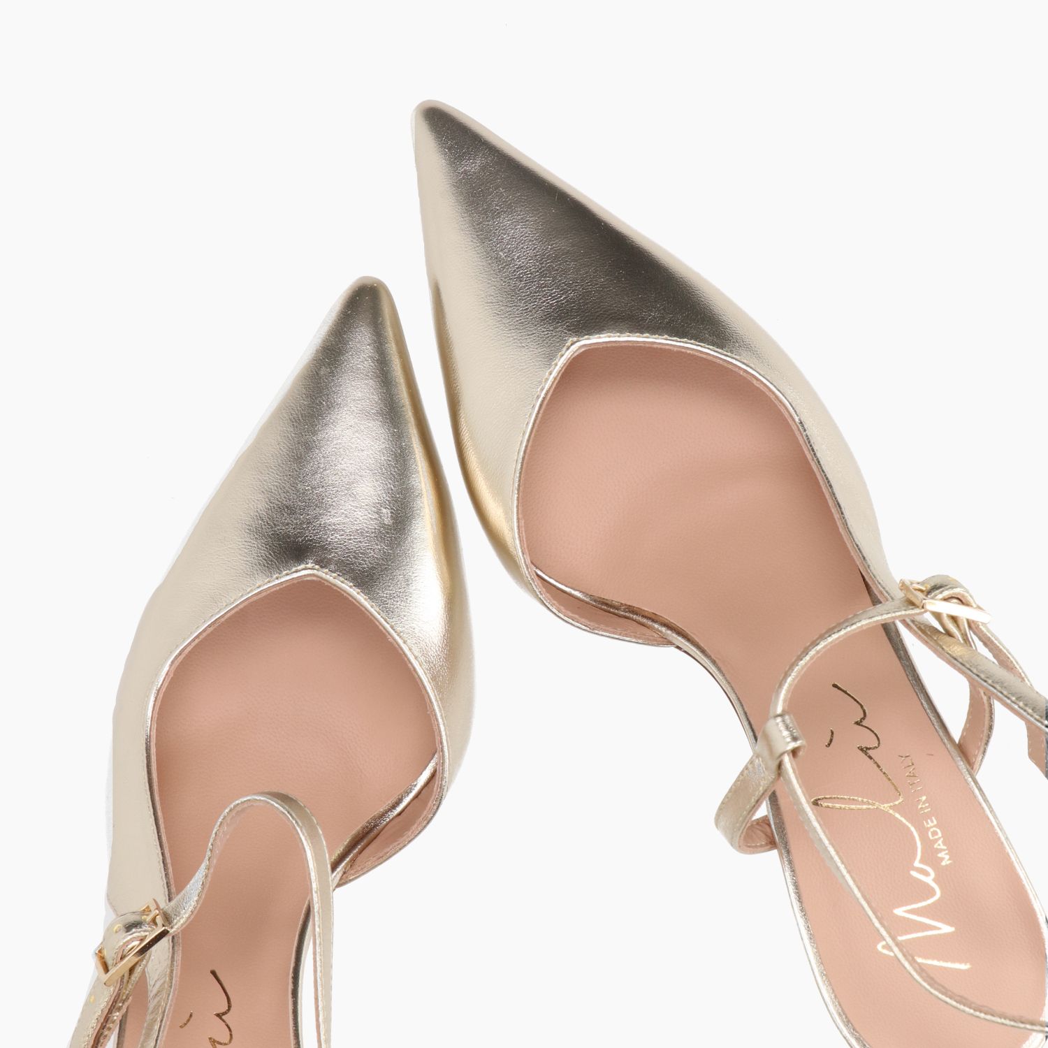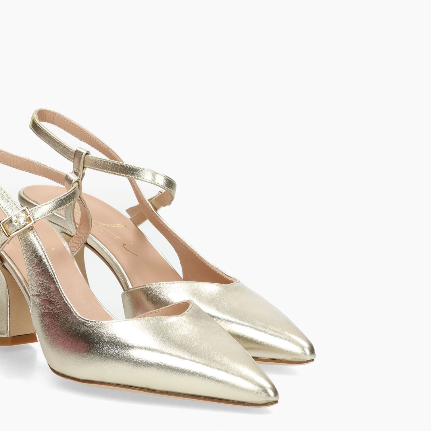 Chanel in pelle laminata oro. Cinturino alla caviglia con fibbia regolabile. Interno in pelle. Suola in cuoio. Tacco di 6,5 cm. Collezione Malu' donna Primavera/Estate.