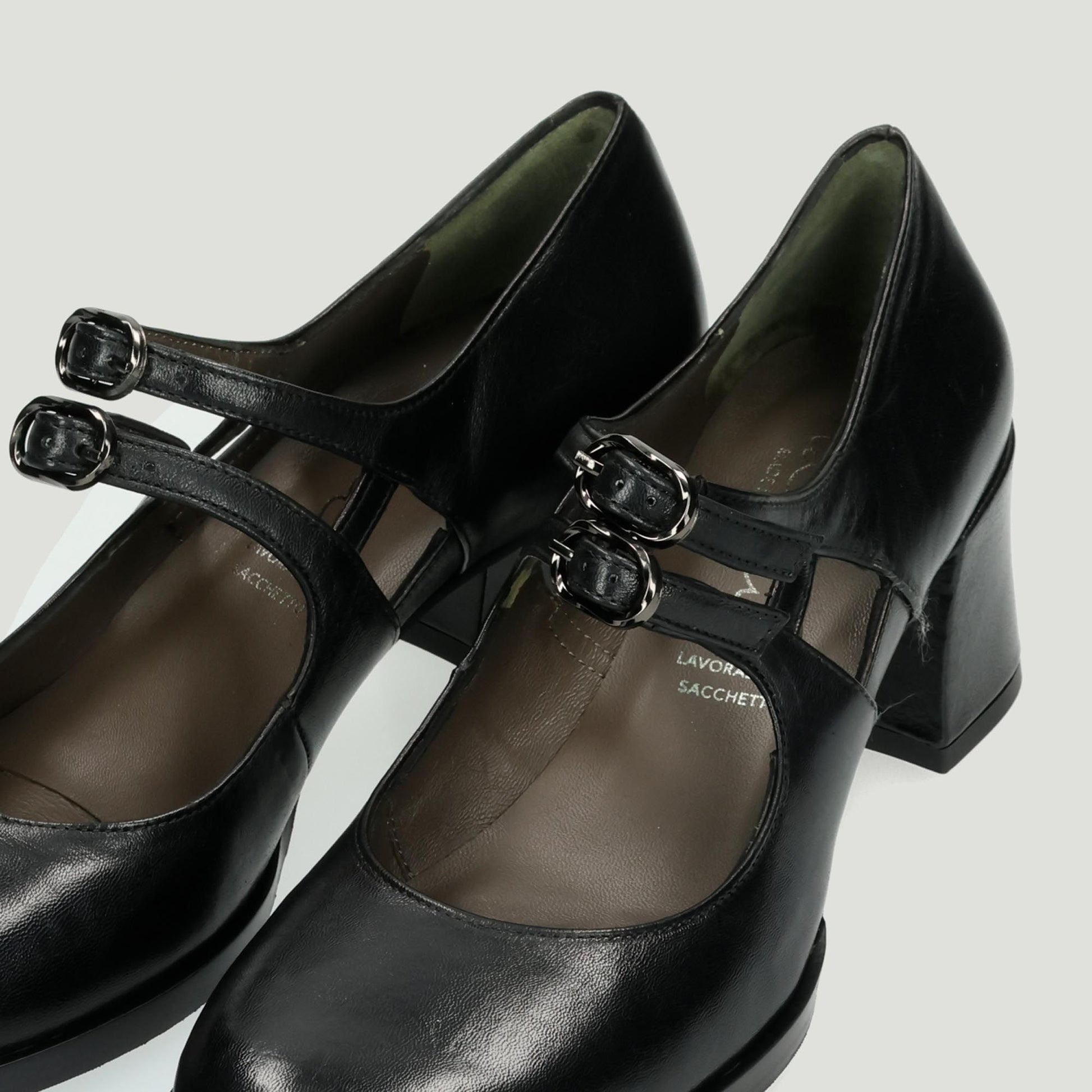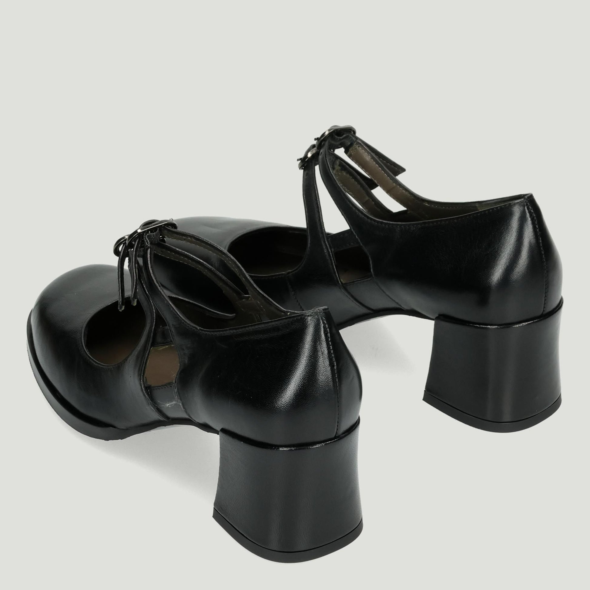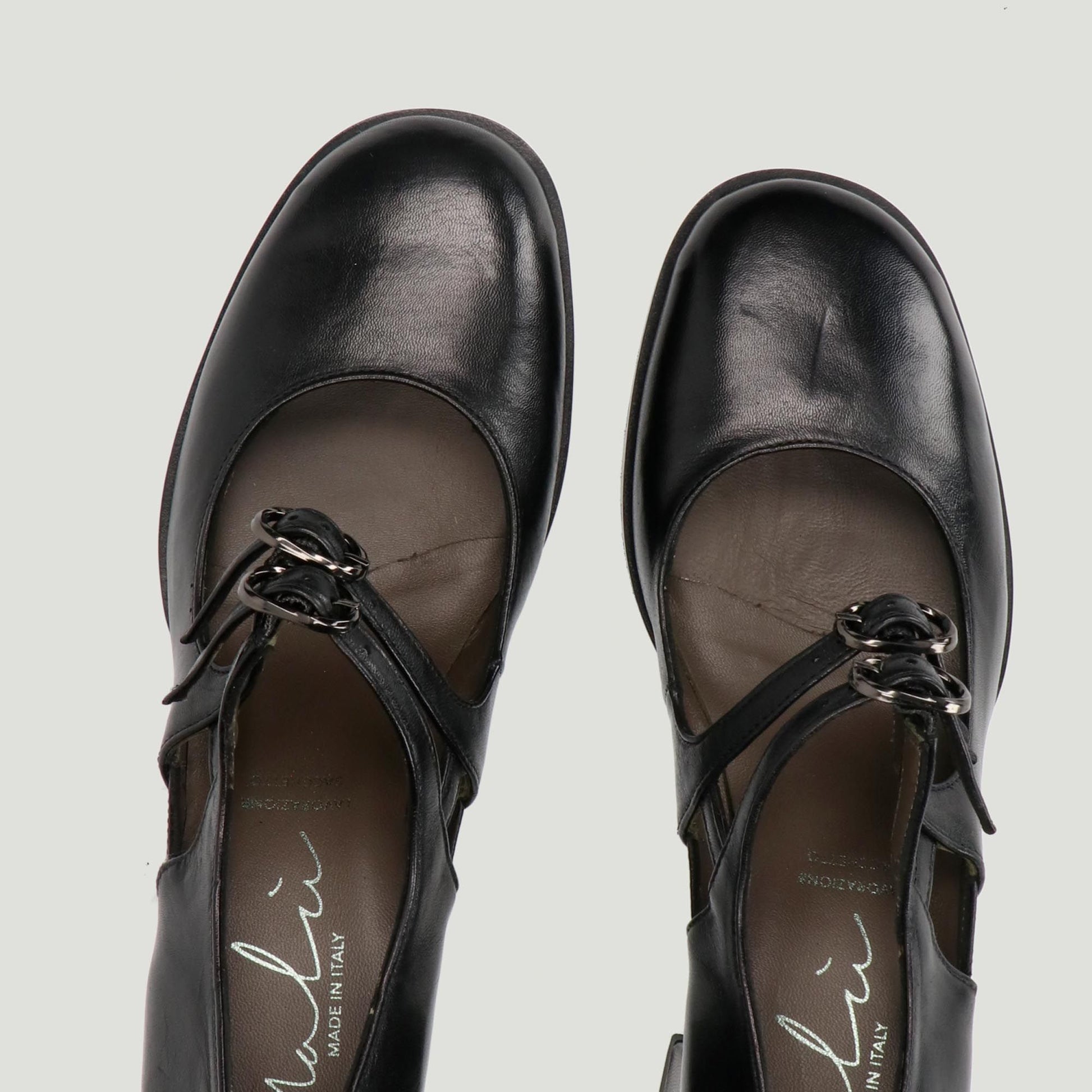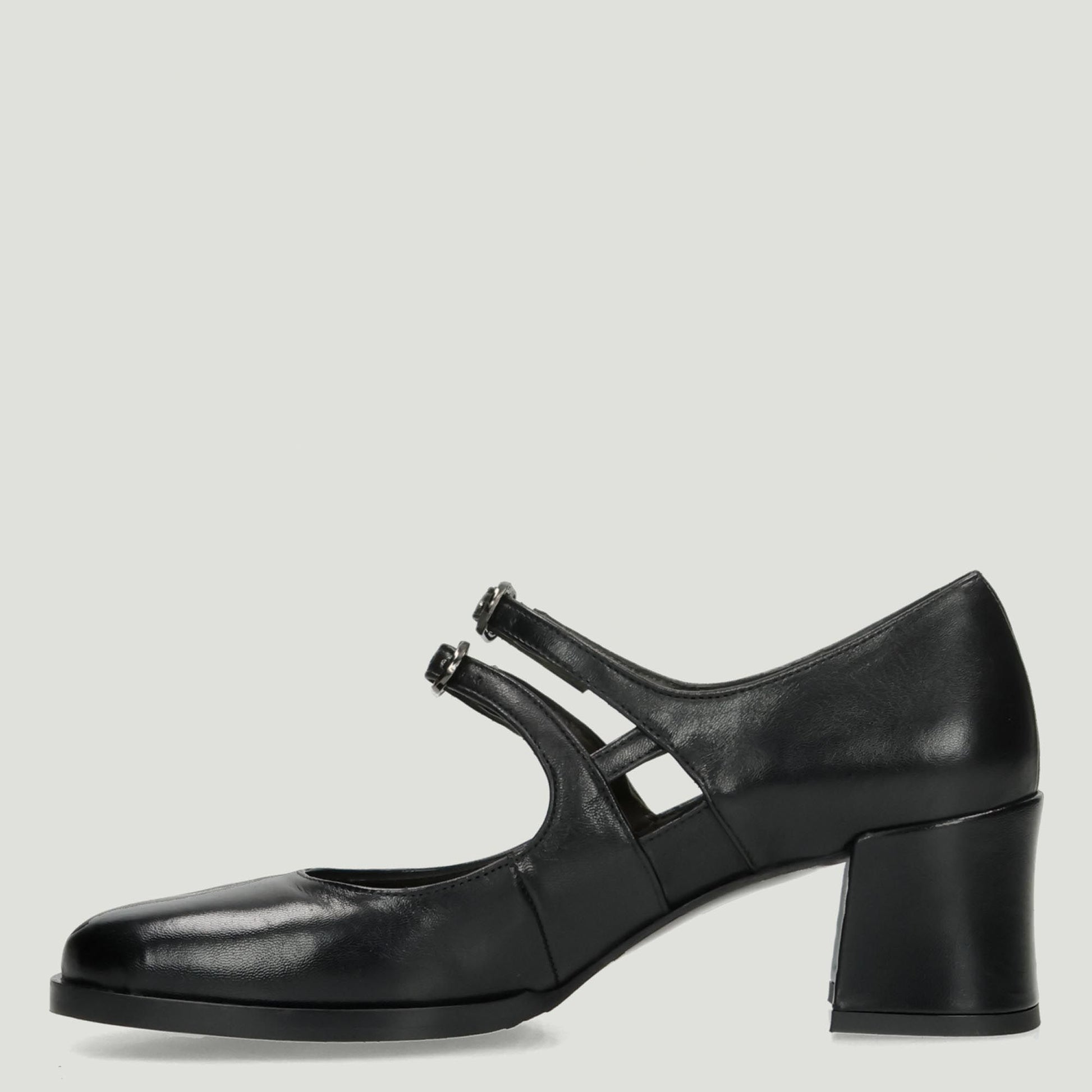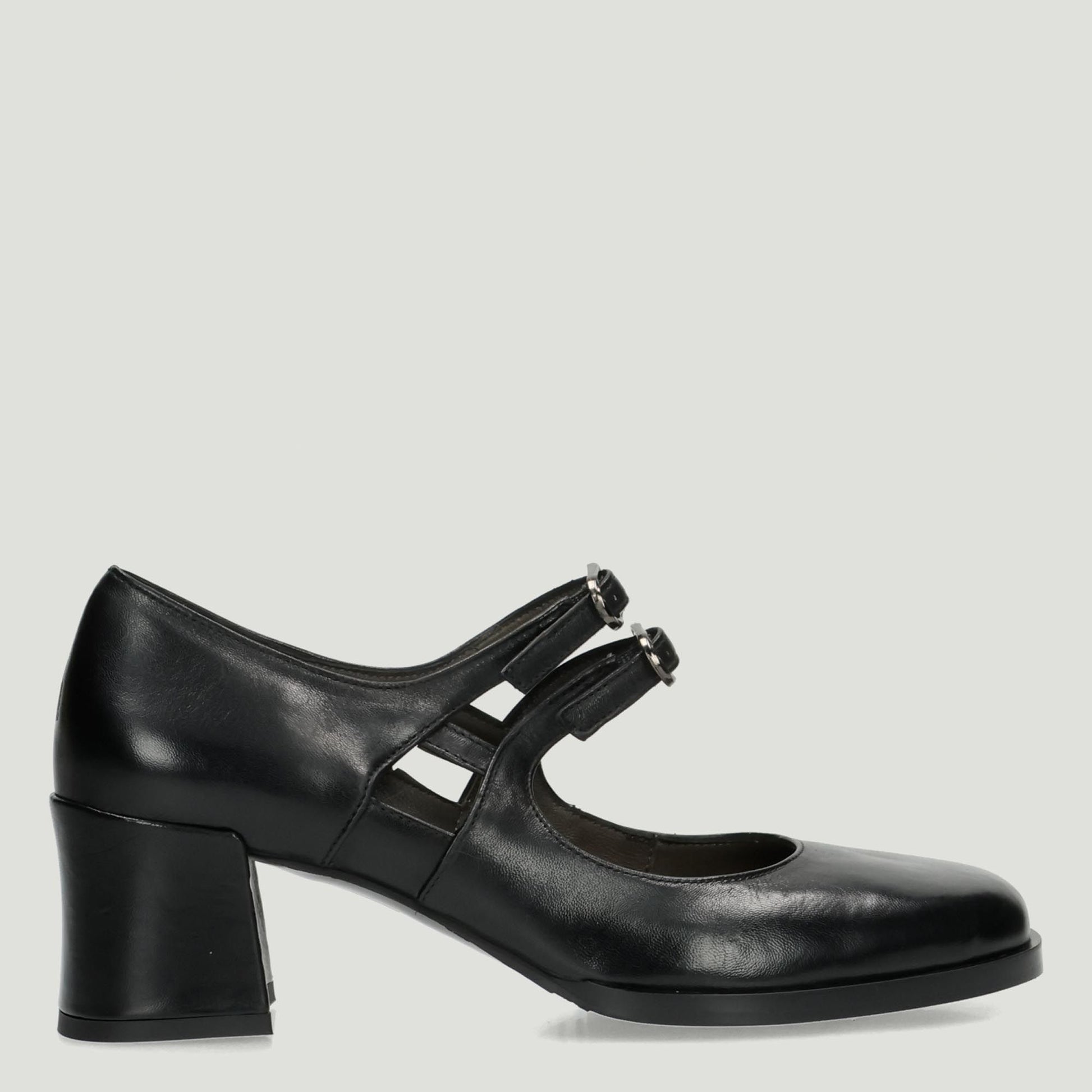 Decollete in pelle nera con doppio cinturino con fibbia regolabile. Interno in pelle. Suola in gomma con tacco di 5 cm. Collezione Malu' donna Autunno/Inverno.