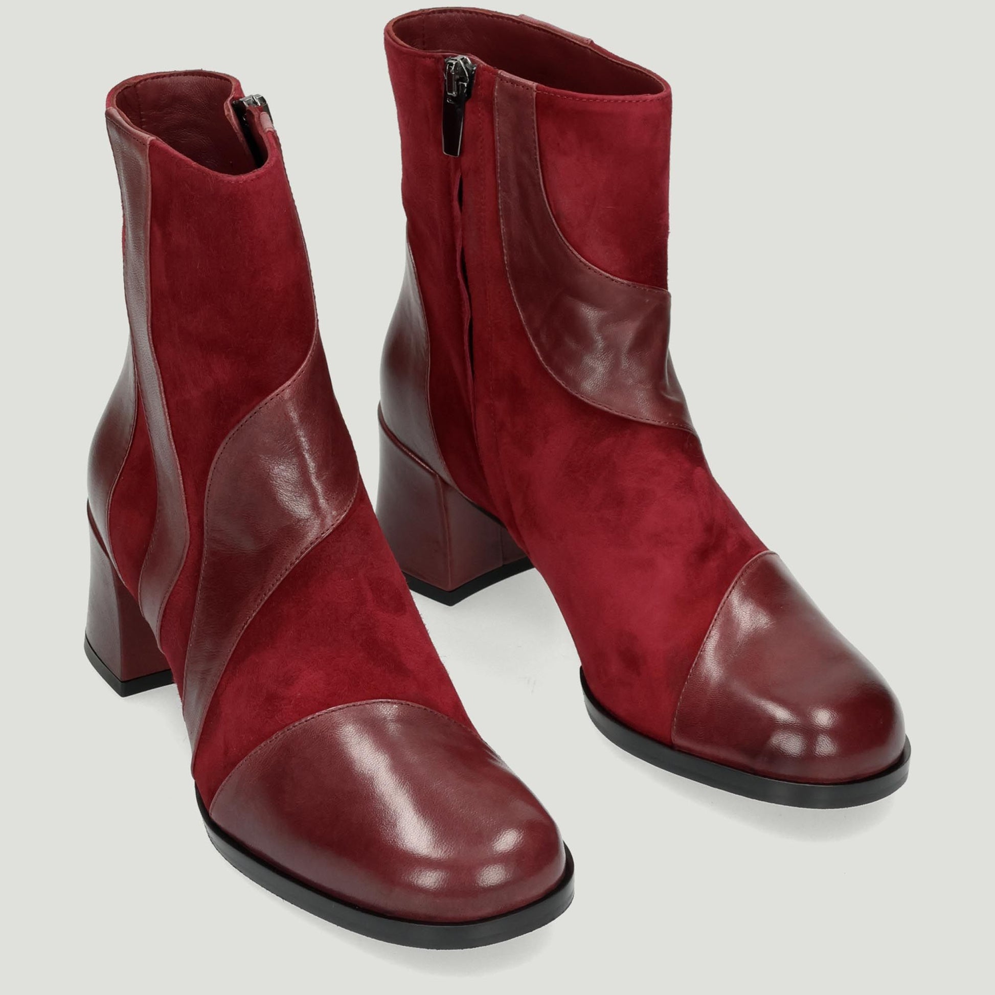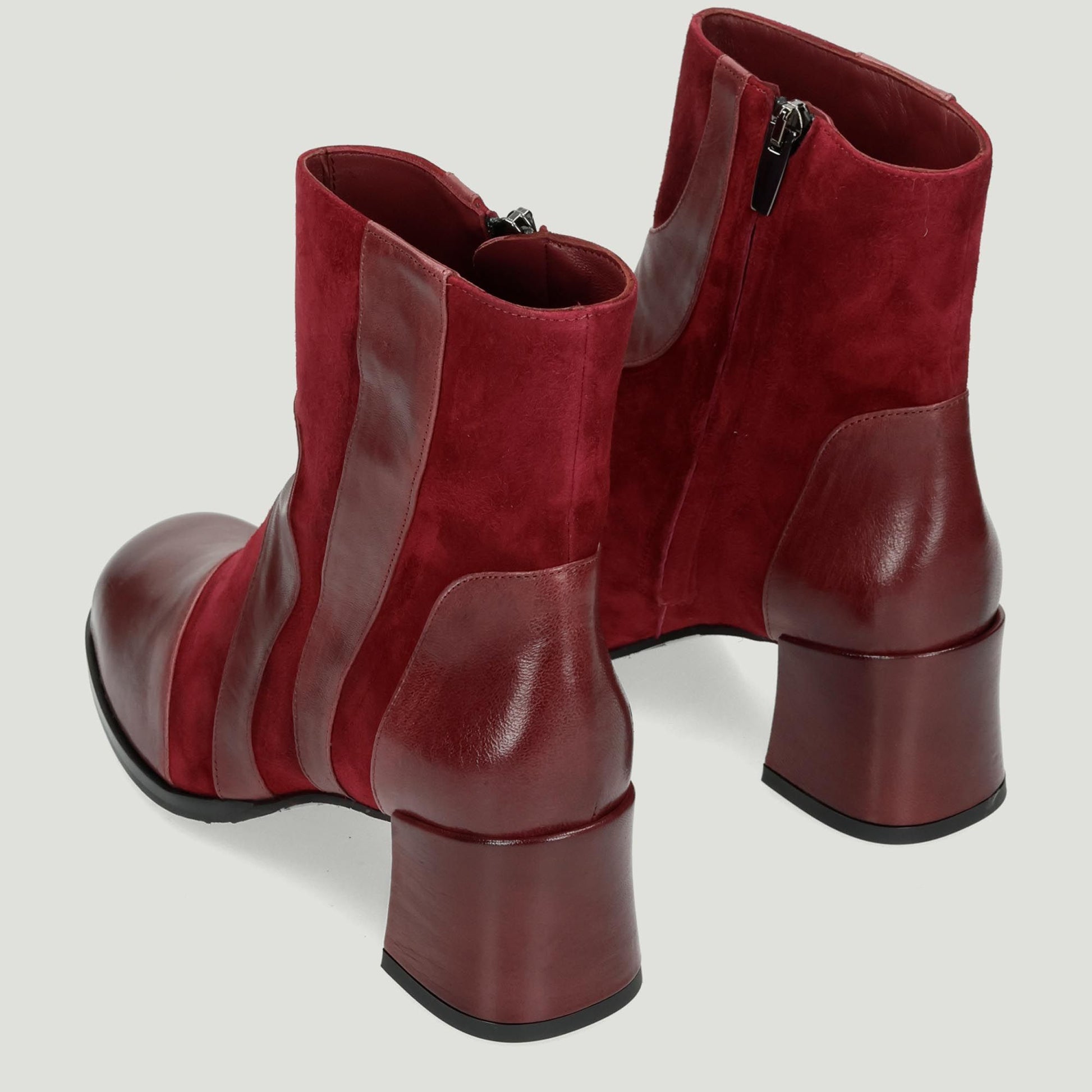 Stivaletto in pelle e camoscio bordeaux. Chiusura con zip interna. Interno in pelle con lavorazione a sacchetto. Suola in gomma con tacco di 5 cm. Collezione Malu' donna Autunno/Inverno.