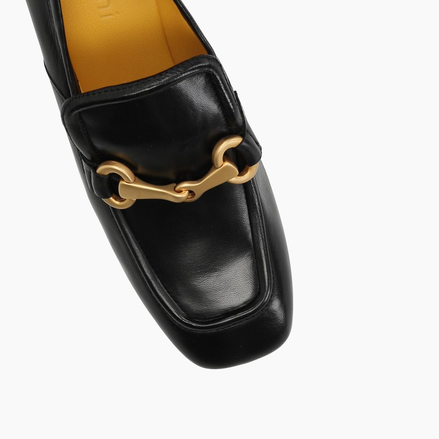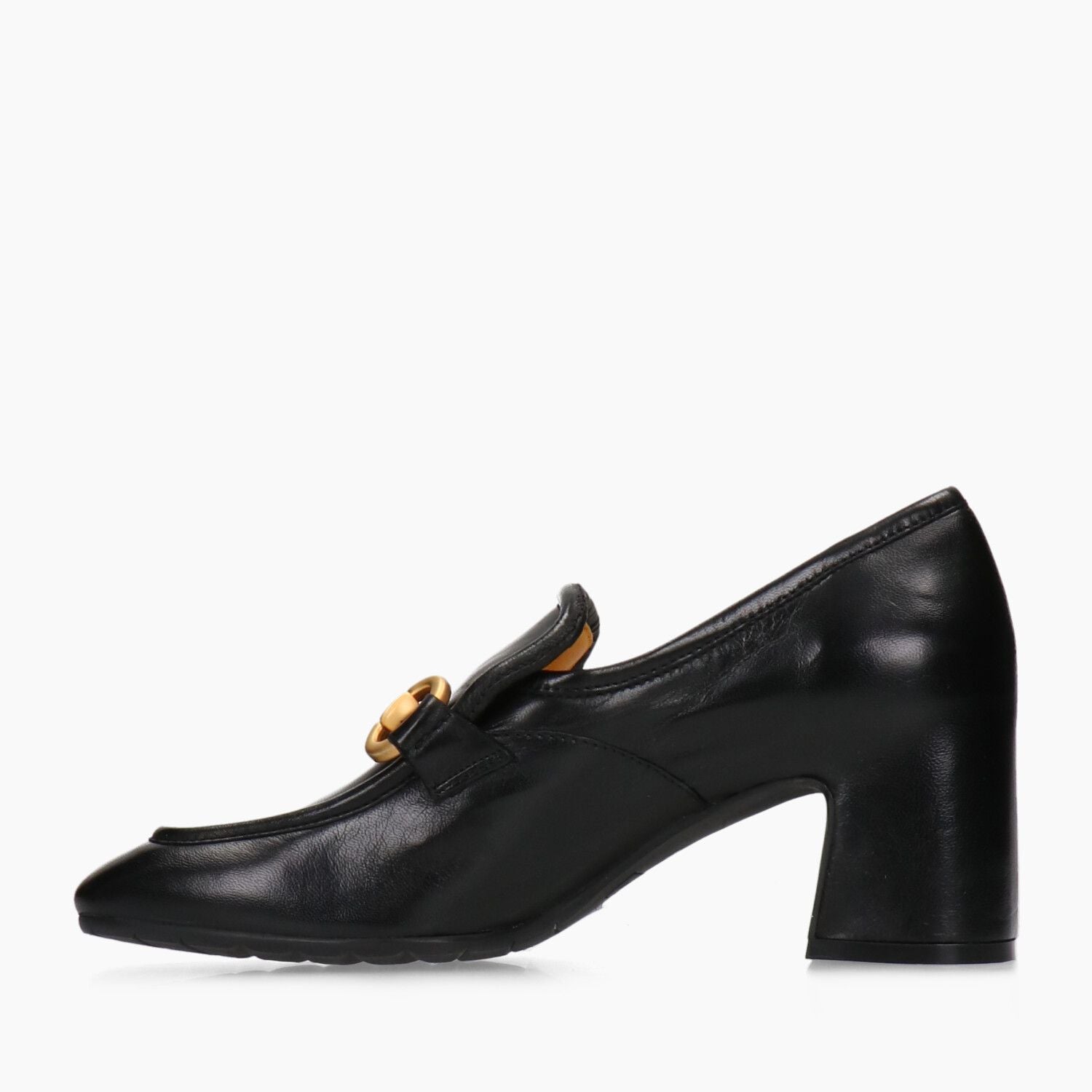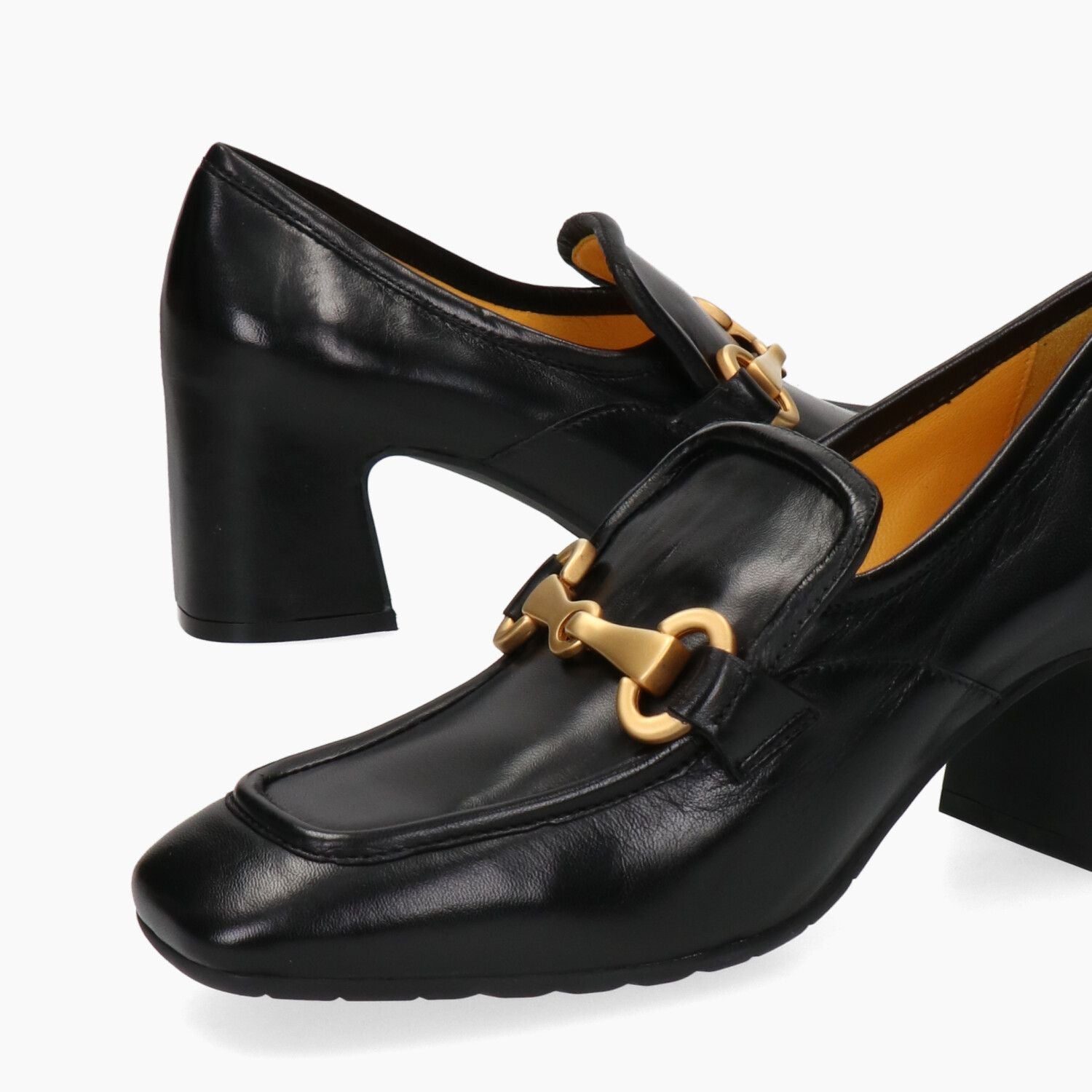 Mocassini in pelle nera con morsetto, tacco 60 fondo cuoio e gomma.