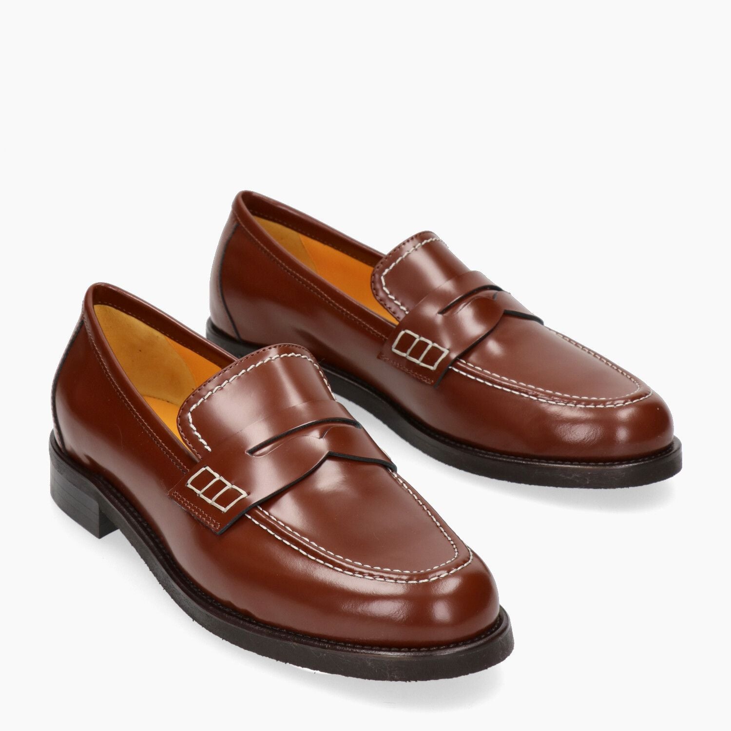 Mocassino in pelle. Tomaia in pelle spazzolata in colore cuoio con impunture bianche. Punta rotonda. Interno in pelle in colore giallo. Tacco di 2 cm. Suola in gomma. Lavorazione artigianale a sacchetto. Collezione Mara Bini donna Autunno/Inverno.