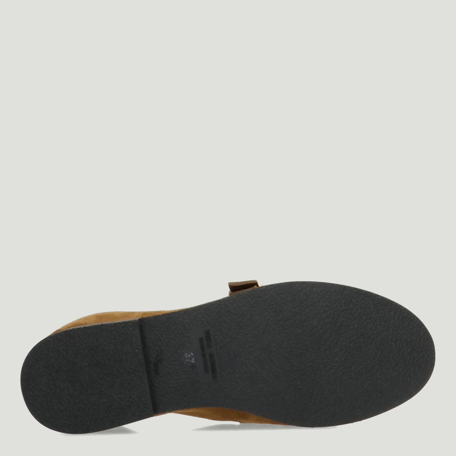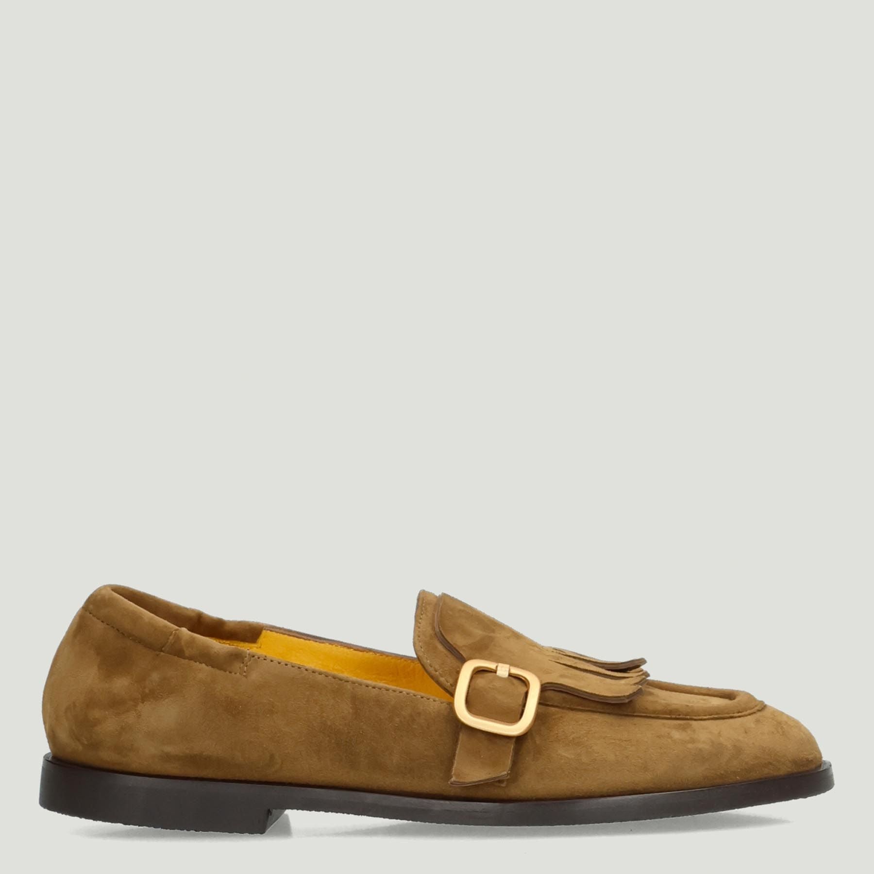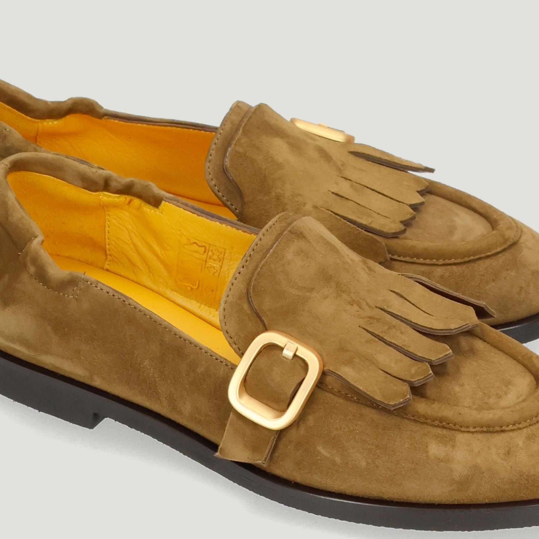 Mocassino in pelle scamosciata color marrone con frangia e fibbia satinata oro. Interno in pelle con lavorazione a sacchetto. Elastici laterali sulla scollature per migliorarne l'aderenza. Suola in gomma antiscivolo con tacco di 2 cm. Collezione Mara Bini donna Autunno/Inverno.