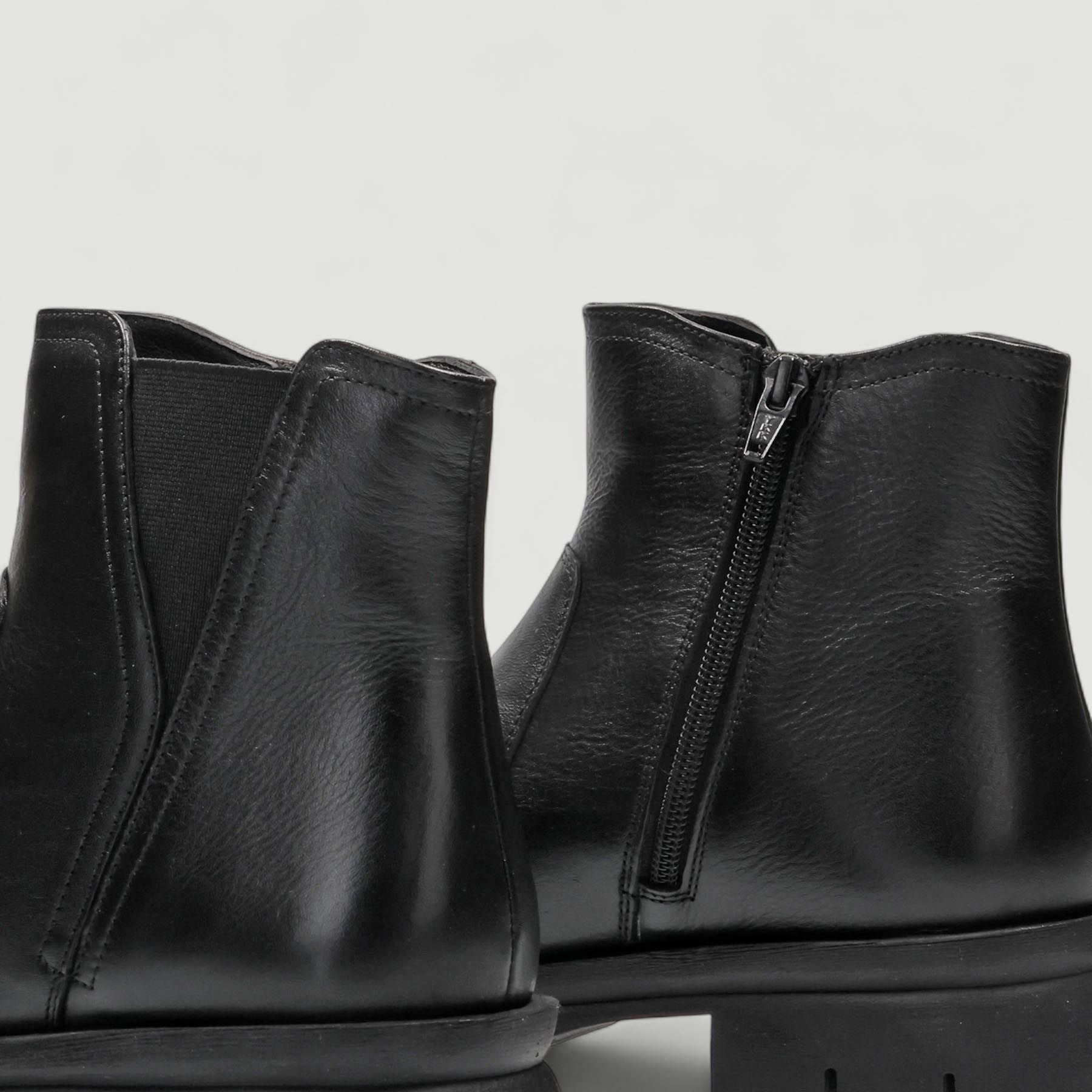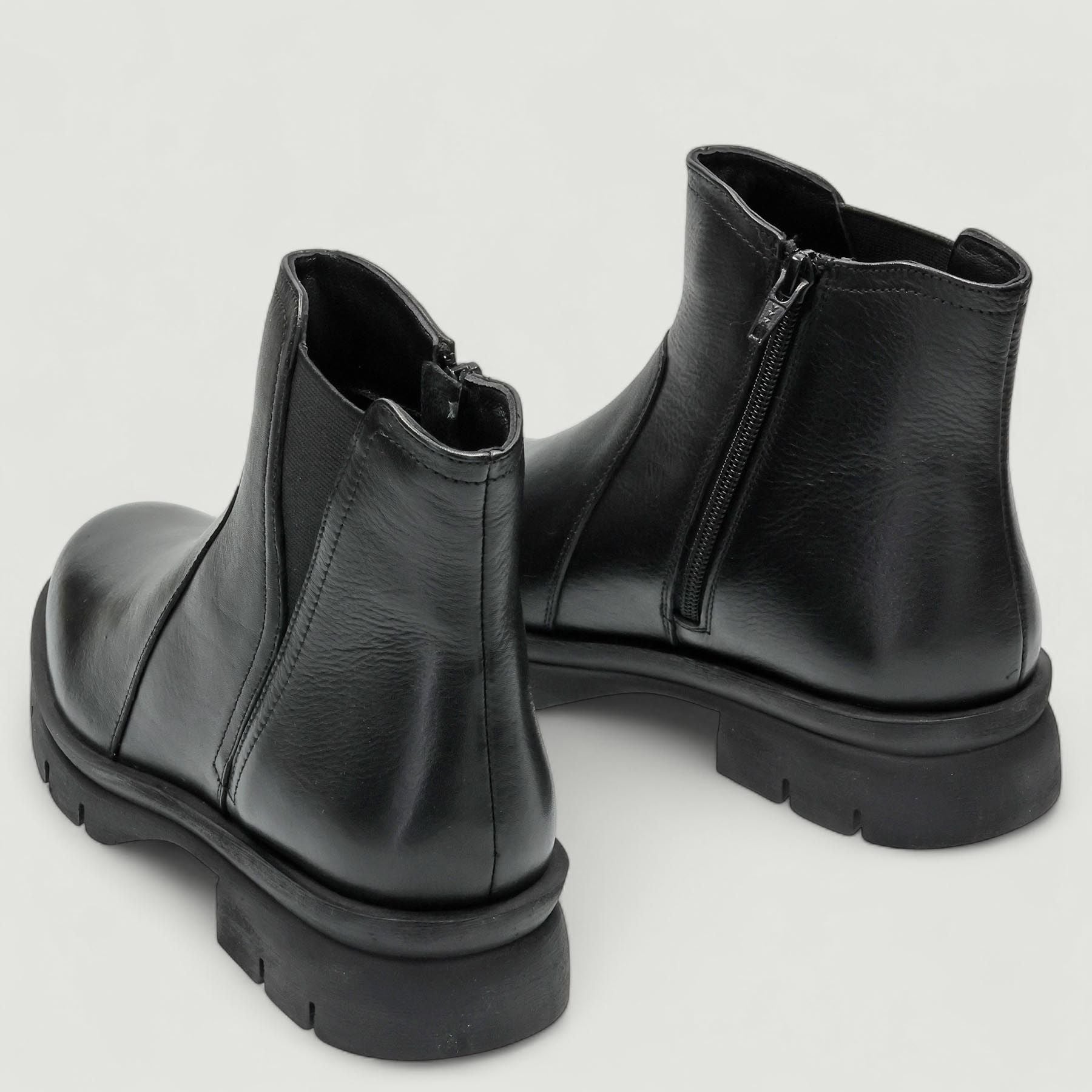 Stivaletti in pelle nera. Chiusura tramite zip interna. Il gambale presenta un elastico esterno per migliorare la calzata sulla caviglia. Interni in pelle e tessuto. Soletta interna rimovibile in pelle. Suola in gomma con tacco di 4 cm. Collezione Melluso donna Autunno Inverno.