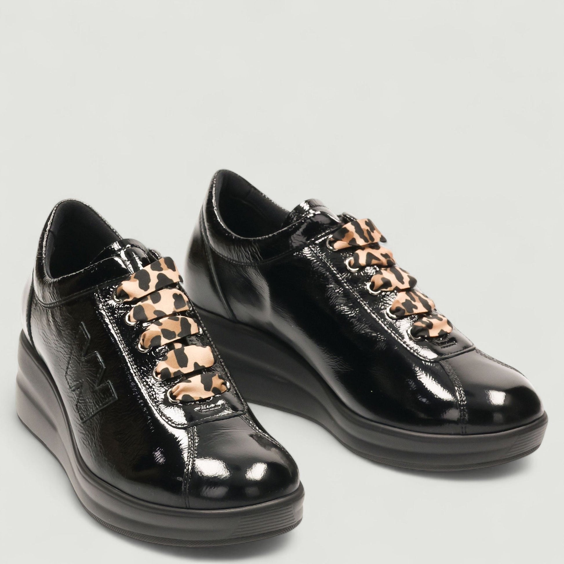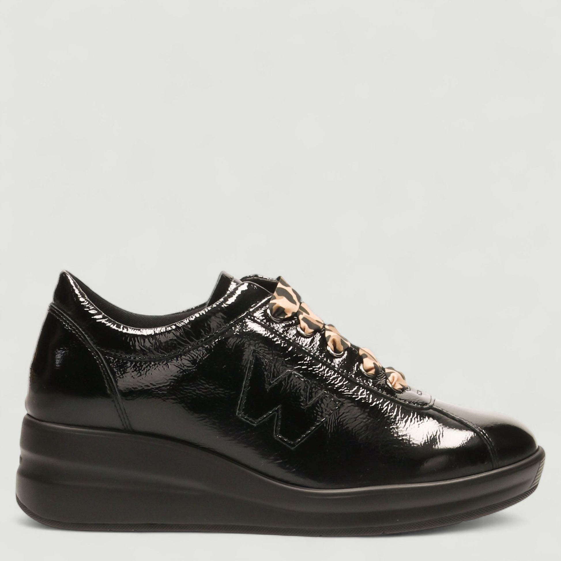 Sneakers in pelle verniciata in colore nero. Chiusura con laccio maculato e laccio in cotone nero di ricambio. Interno in tessuto con sottopiede in pelle rimovibile. Suola in gomma con zeppa di 5 cm. Collezione Melluso donna Autunno/Inverno.