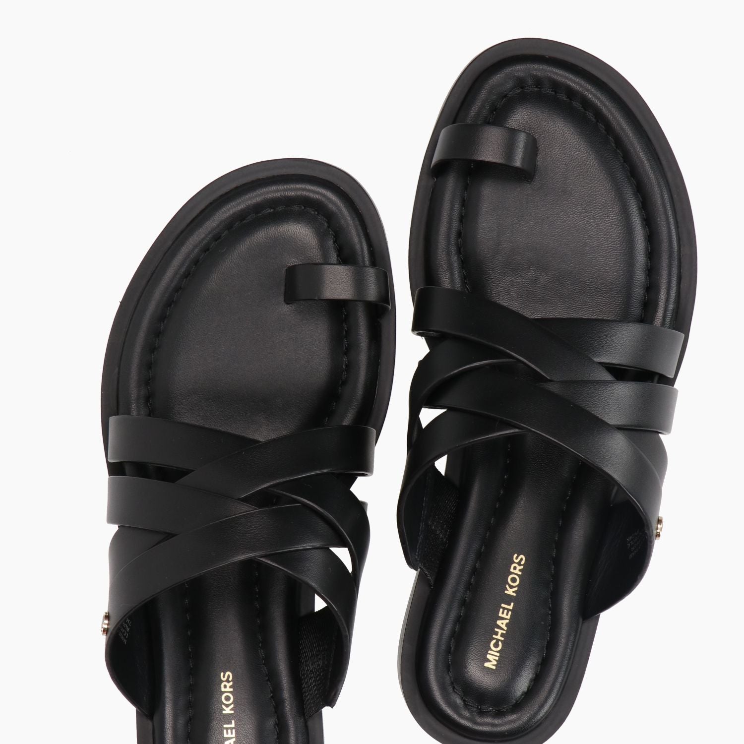 Ciabatta infradito in pelle nera. Piccolo logo laterale in metallo dorato. Interno in pelle. Suola in gomma con tacco di 1,5 cm. Collezione Michael Kors donna Primavera/Estate.