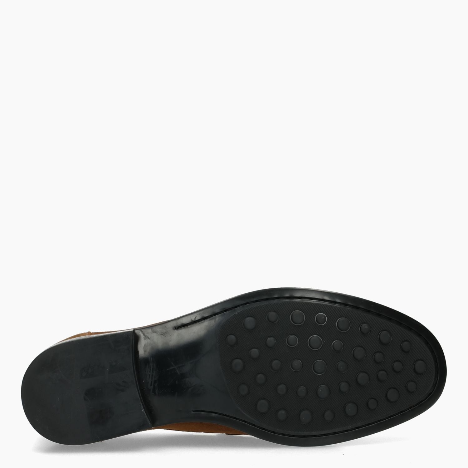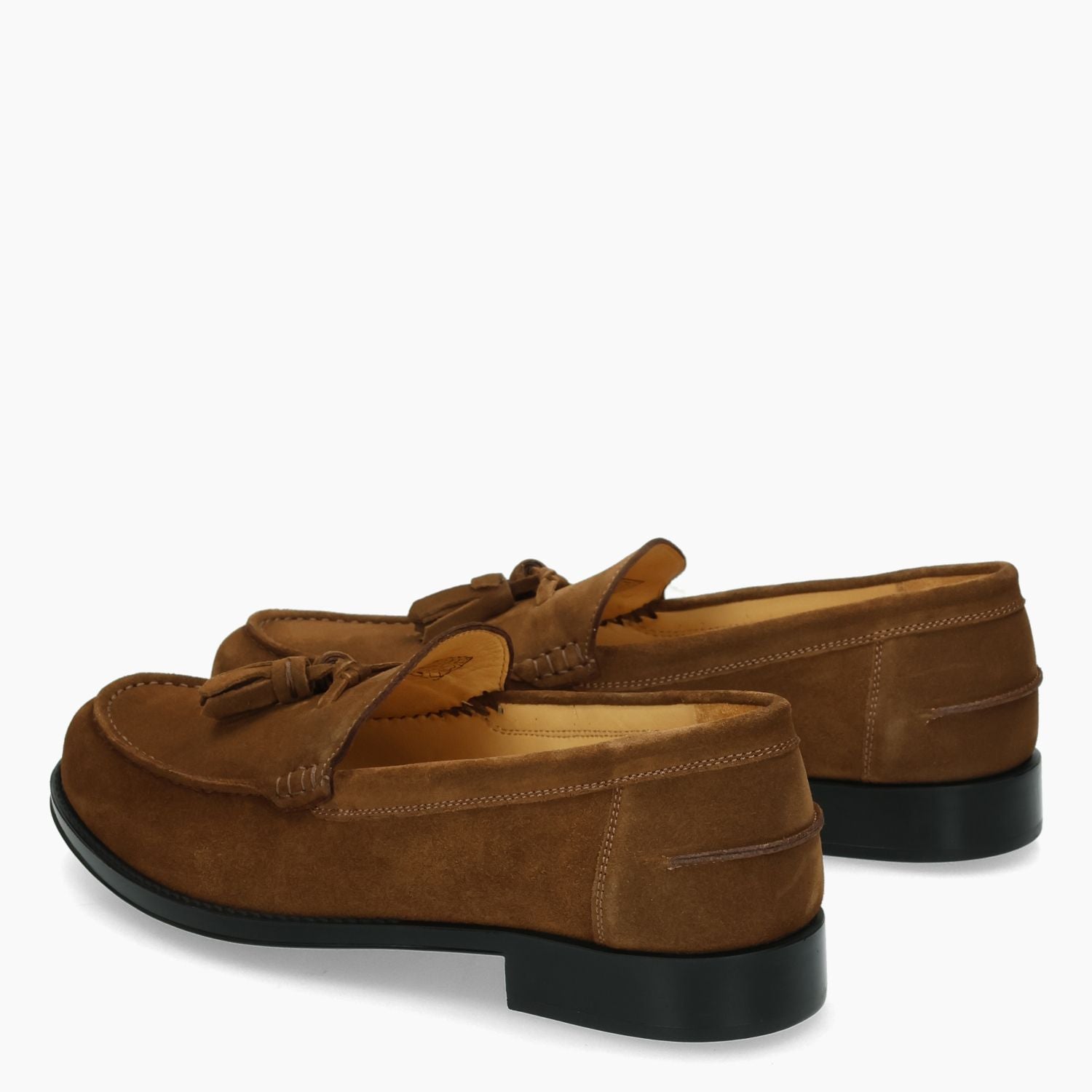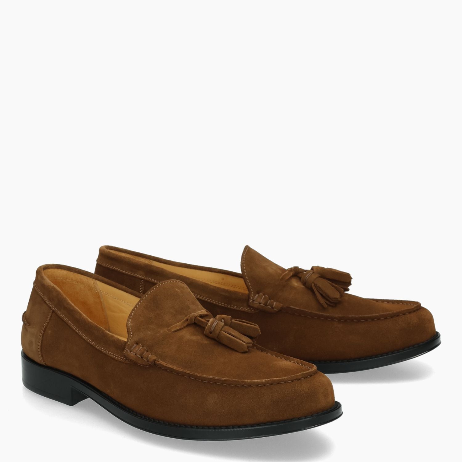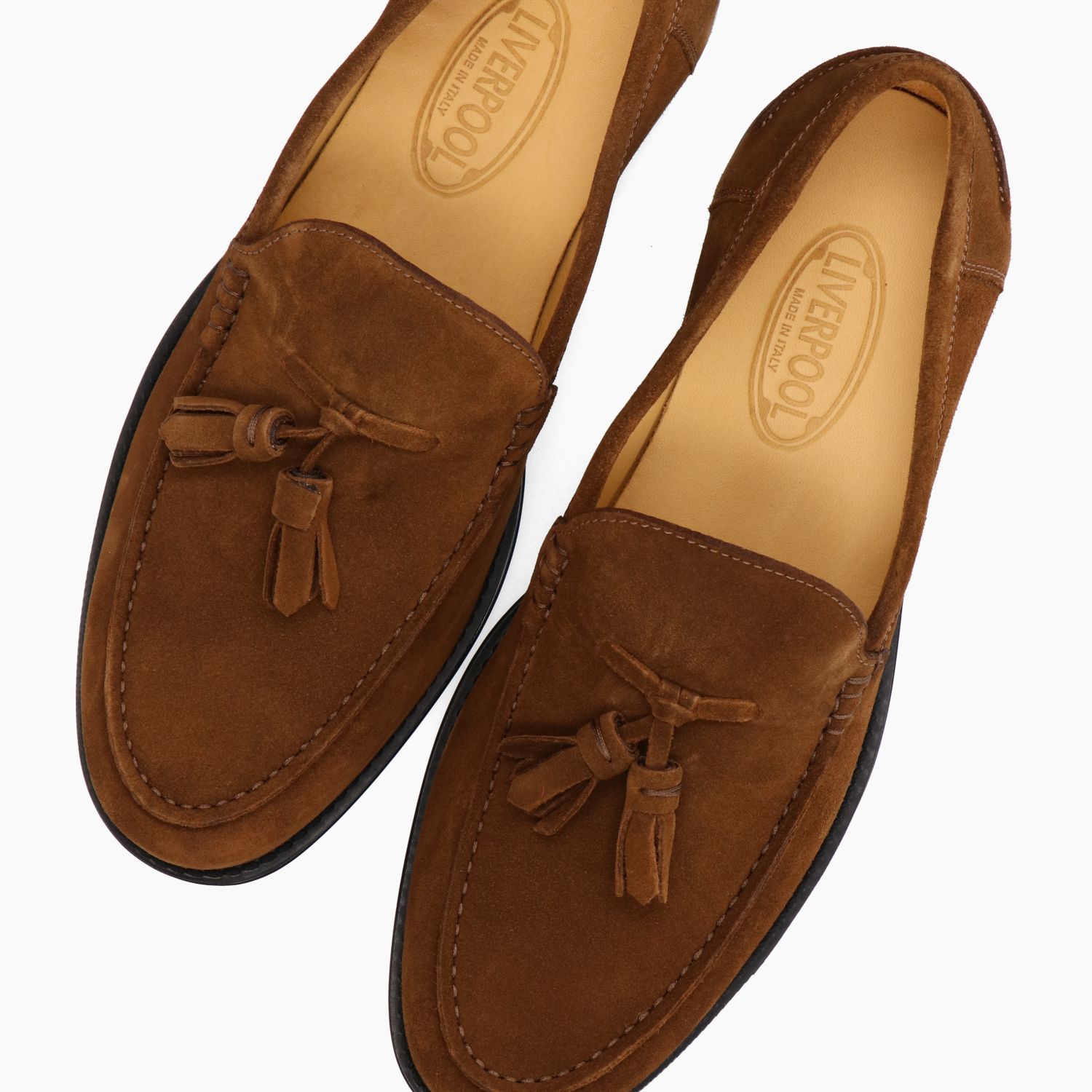 Mocassino in pelle scamosciata cuoio con nappine. Interno in pelle. Suola in gomma con tacco di 2 cm. Collezione Liverpool uomo.