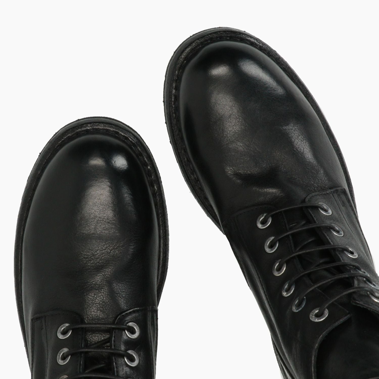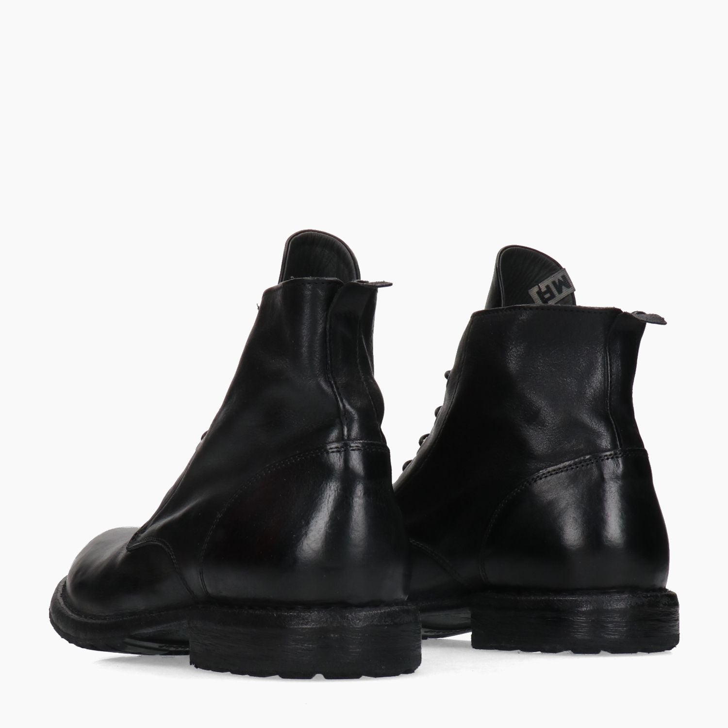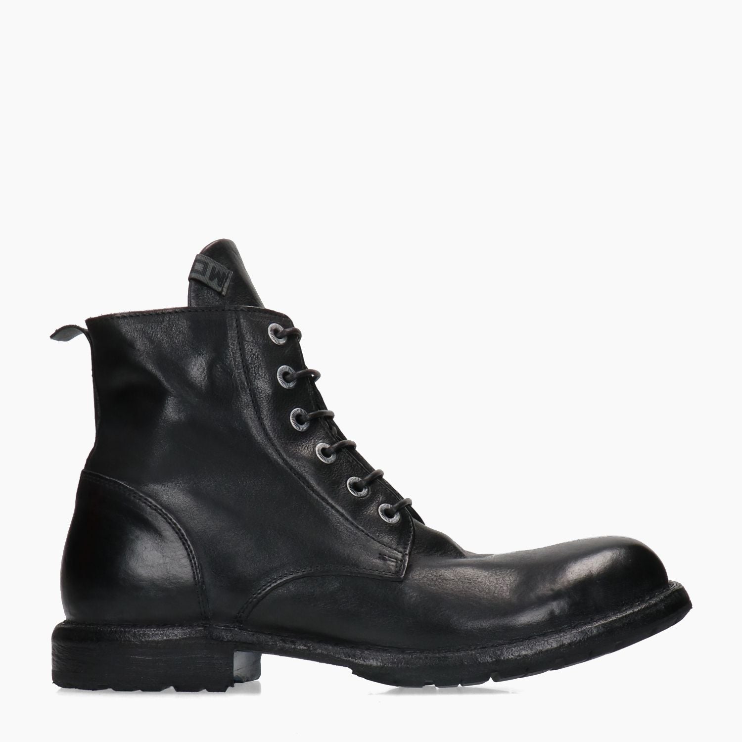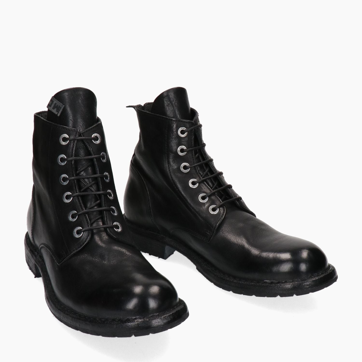 Polacchino in pelle con lacci. Tomaia in pelle in colore nero. Chiusura con lacci in colore nero e occhielli argentati. Punta tonda. Linguetta in pelle. Interno in pelle. Suola esterna in cuoio e gomma. Tacco basso di 3 cm. Nella scatola e' incluso un sacchetto protettivo. Collezione Moma uomo Autunno/Inverno.