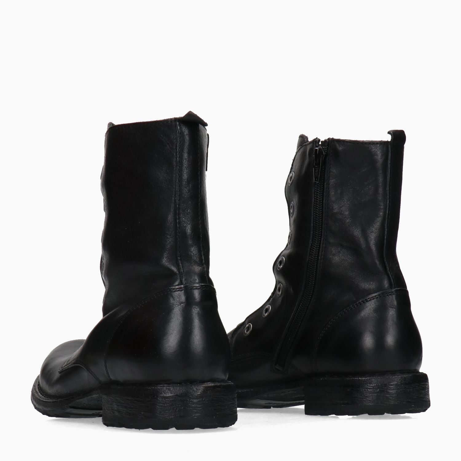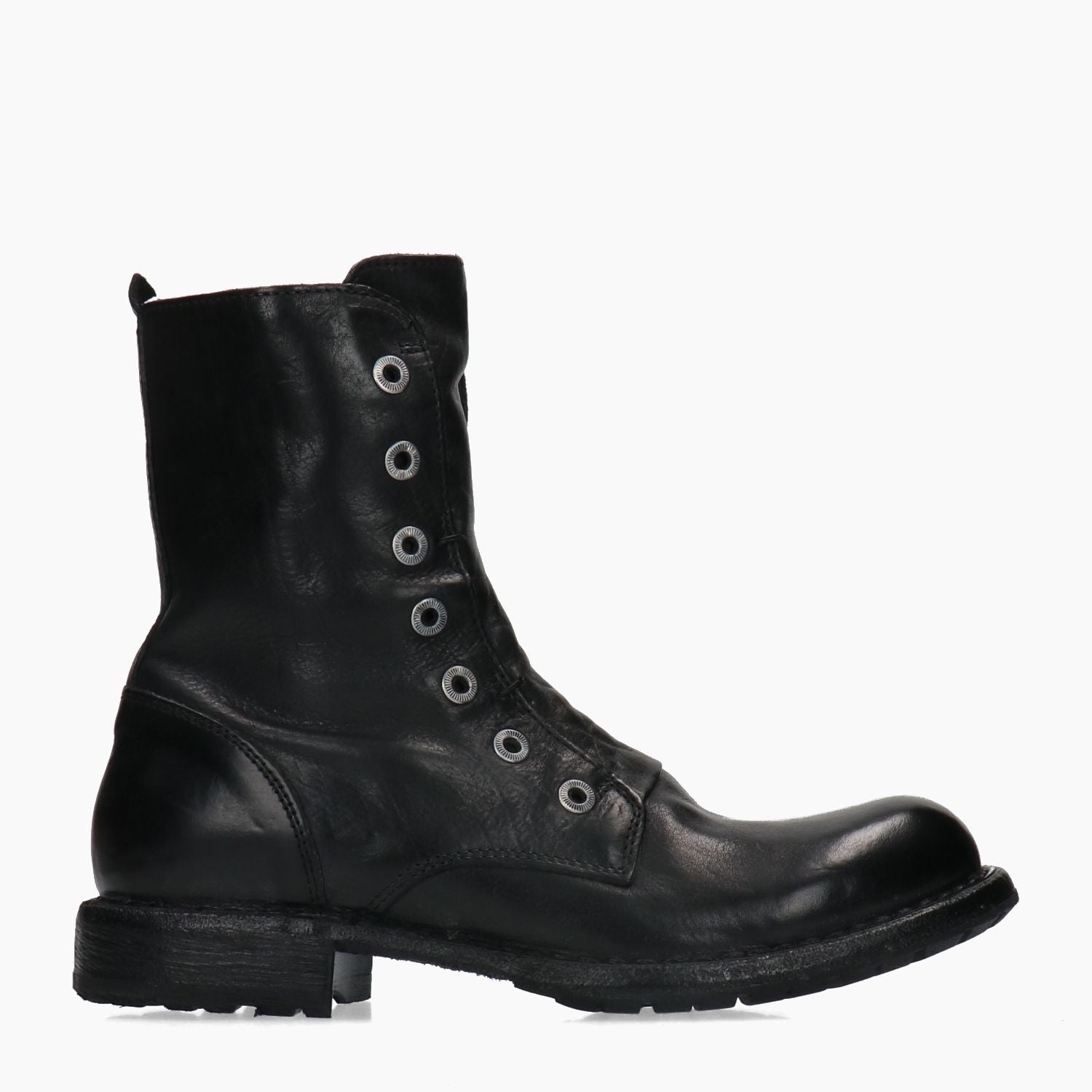 Tronchetto in pelle. Tomaia in pelle in colore nero con occhielli argentati decorativi. Chiusura con zip laterale. Punta tonda. Interno in pelle. Suola esterna in gomma. Tacco basso di 3 cm. Nella scatola e' incluso un sacchetto protettivo. Collezione MoMa donna Autunno/Inverno.
