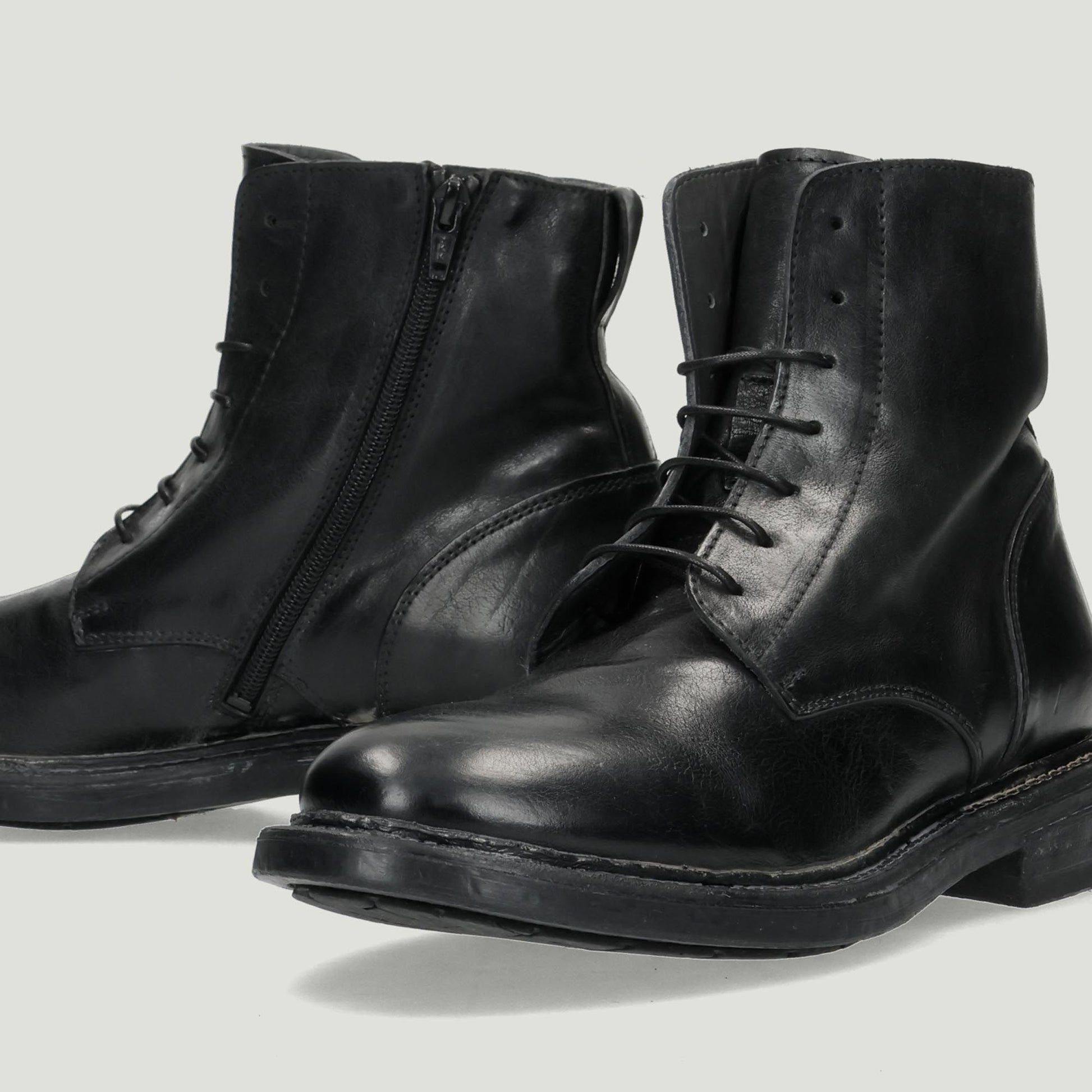 Polacchini Moma in pelle in colore nero. Interno in pelle con sottopiede non estraibile. Chiusura con lacci e zip. Suola in gomma con tacco di 3 cm. Collezione Moma uomo Autunno/Inverno.