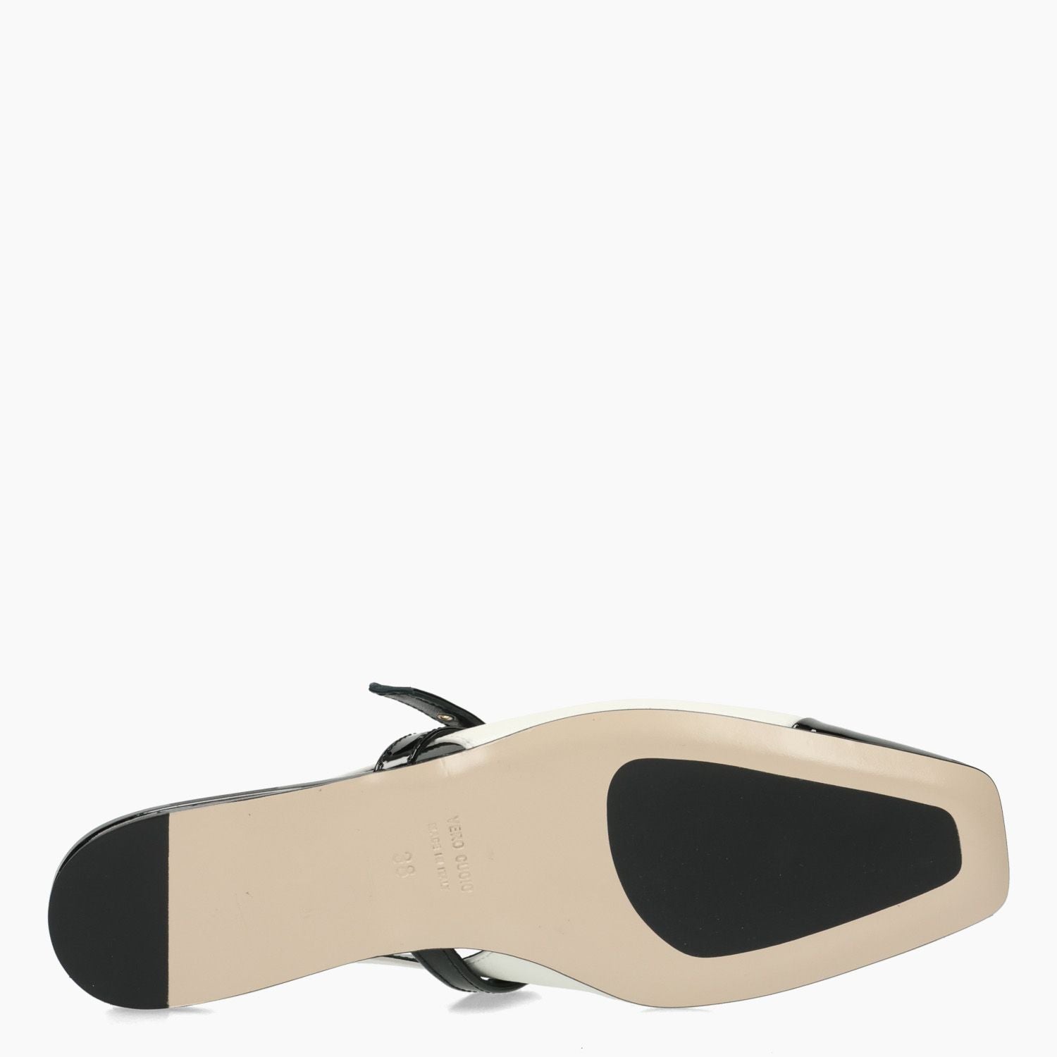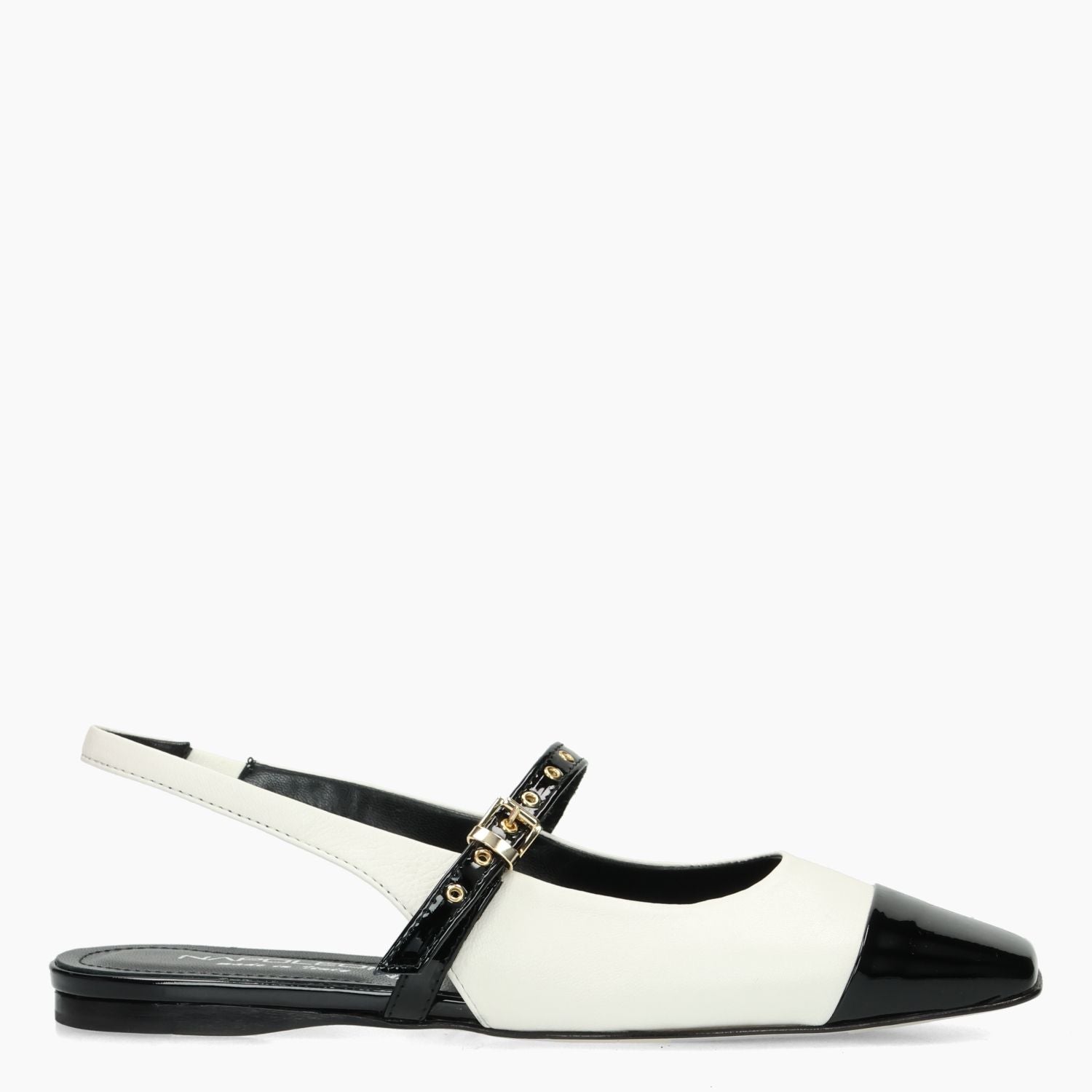 Chanel-Mary Jane in pelle latte e vernice nera con fibbietta dorata sul cinturino regolabile. Interno in pelle. Suola in cuoio e gomma con tacco di 2 cm. Collezione Napoleoni donna primavera/estate.
