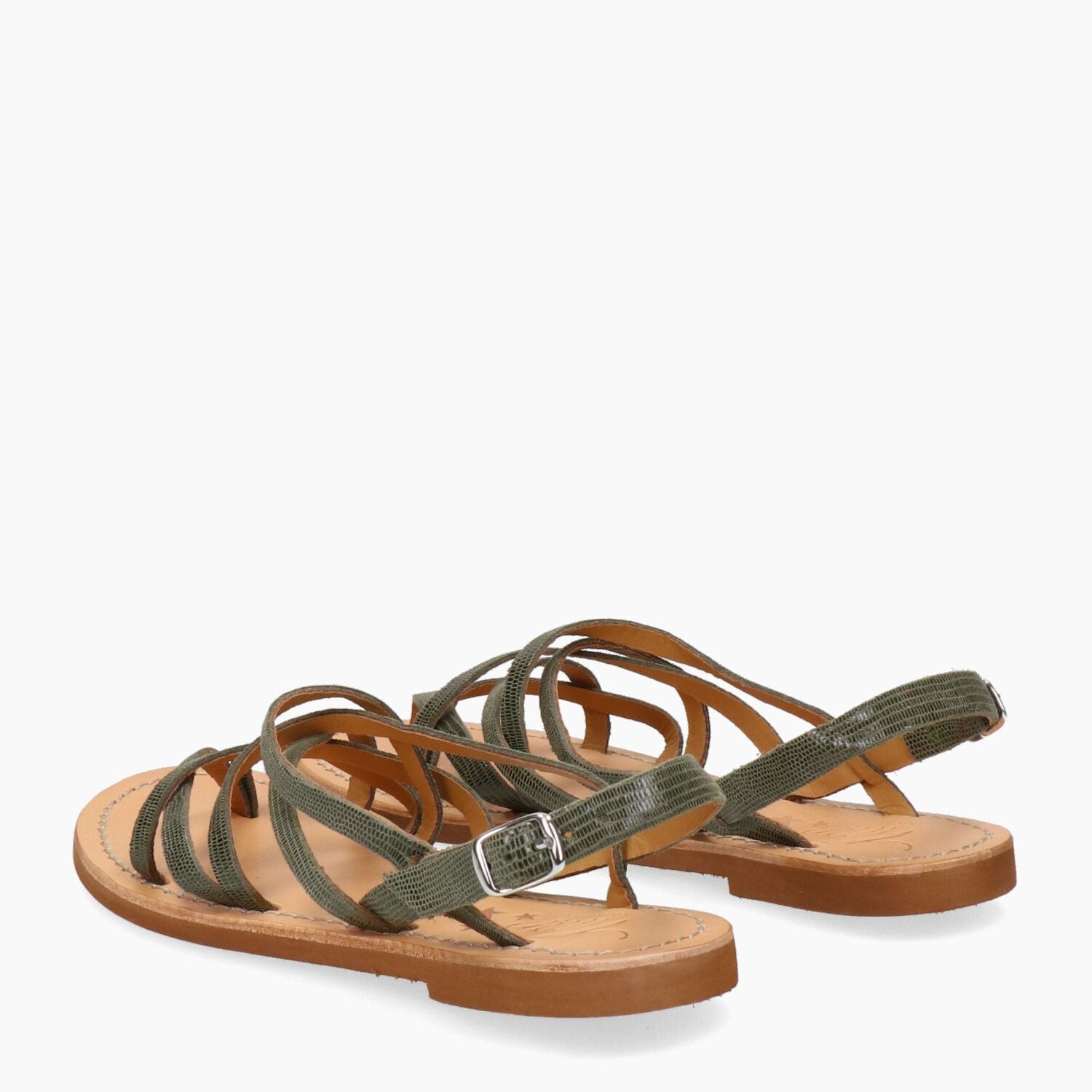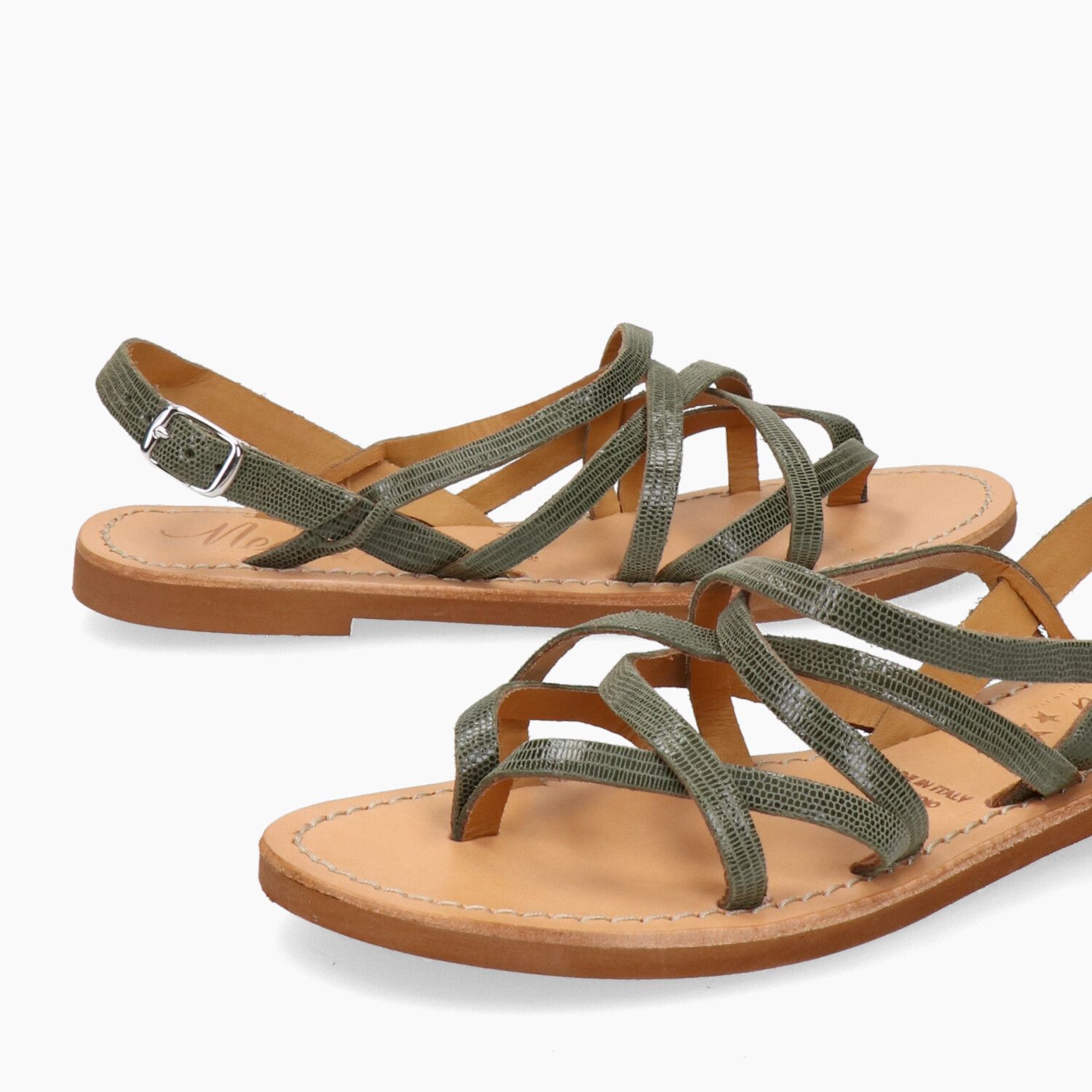 Sandali in pelle stampata lucertola verde salvia, fondo gomma.