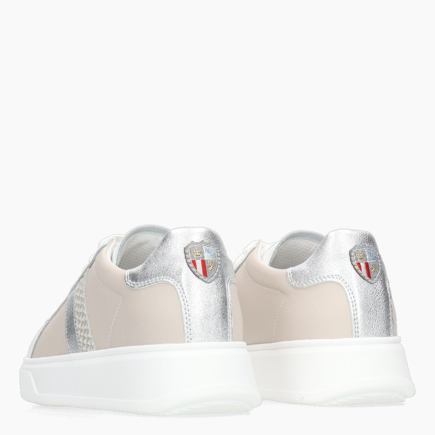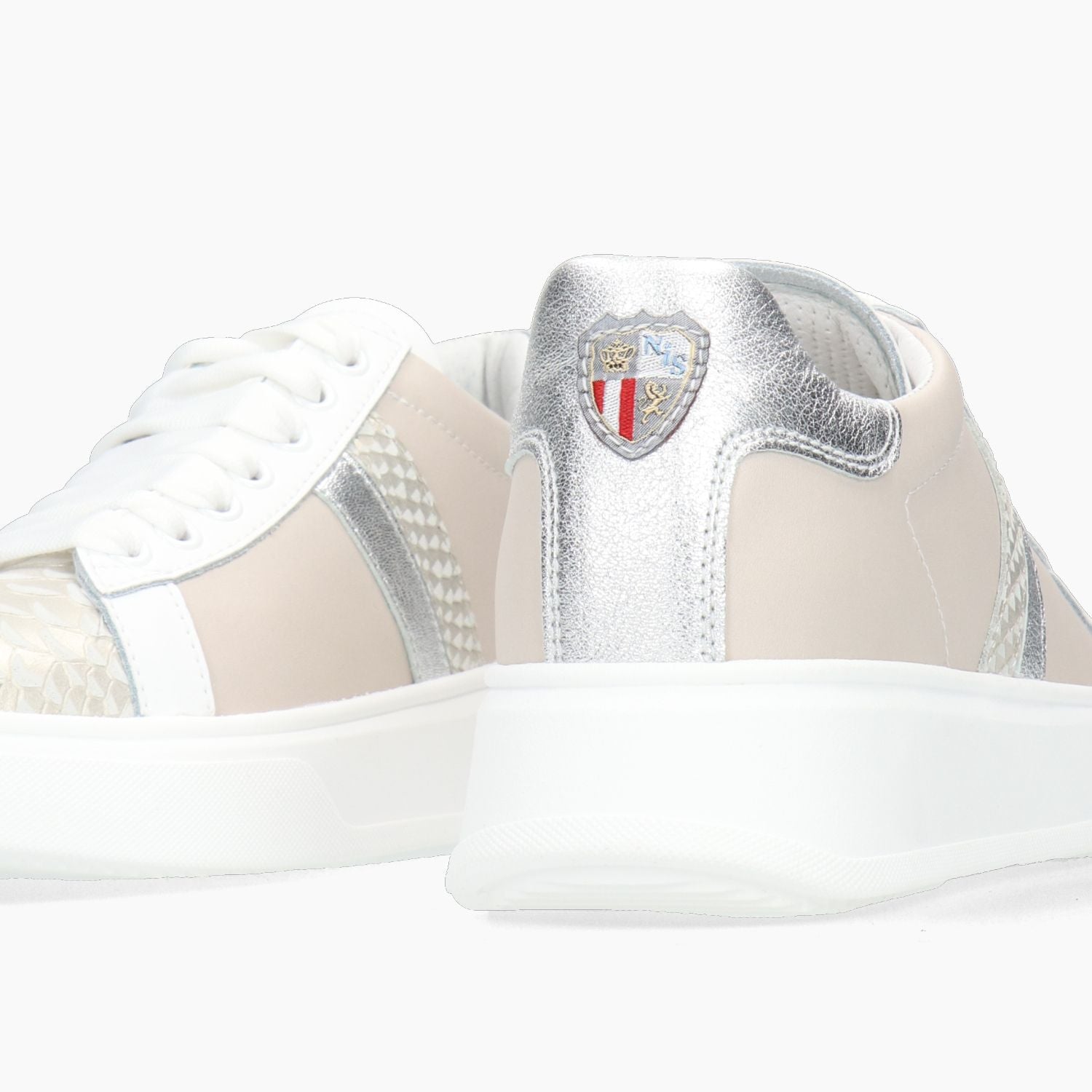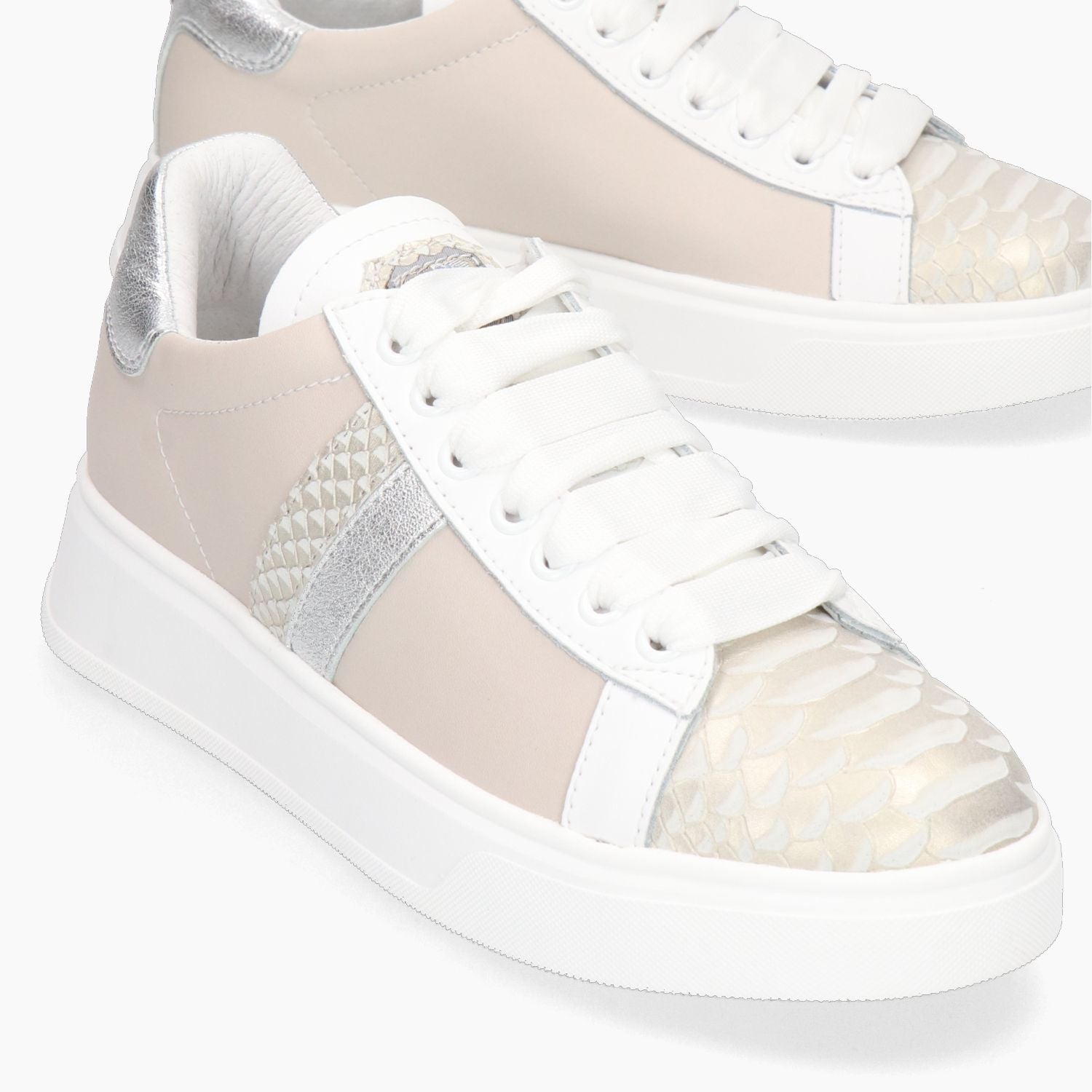 Sneakers in pelle e tessuto beige con puntale in pelle stampata tipo pitone. Interno in pelle con sottopiede estraibile. Suola in gomma con platform di 4,5 cm. All'interno e' presente un laccio di ricambio. Collezione New Italia Shoes donna.