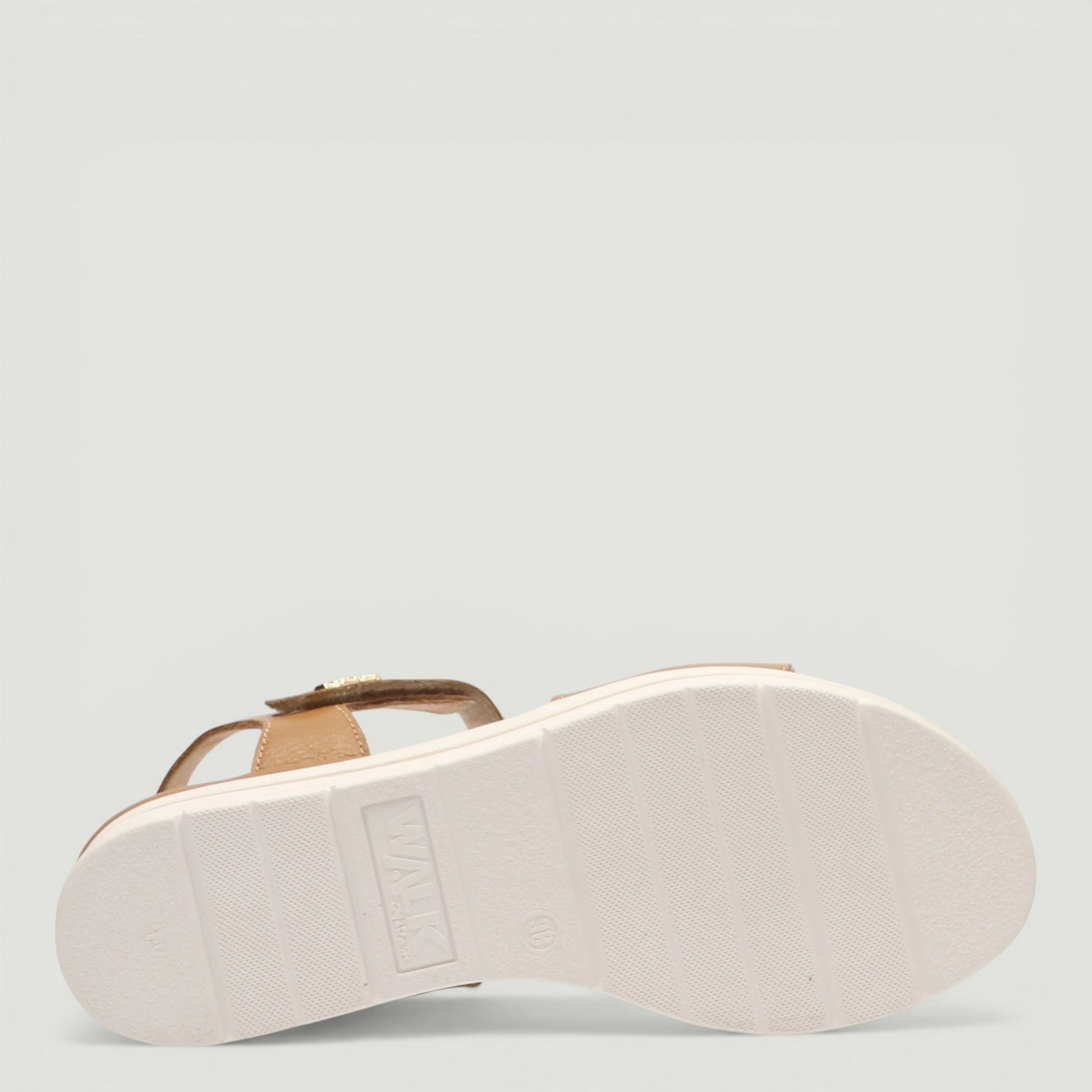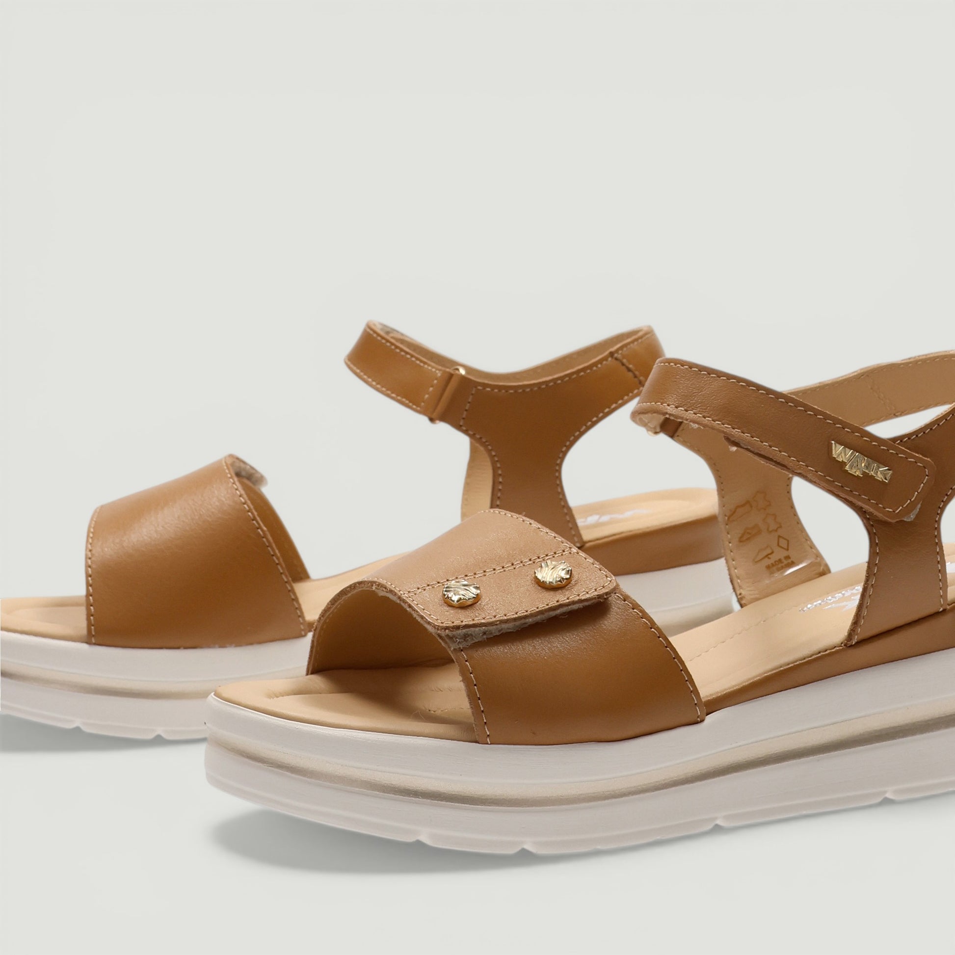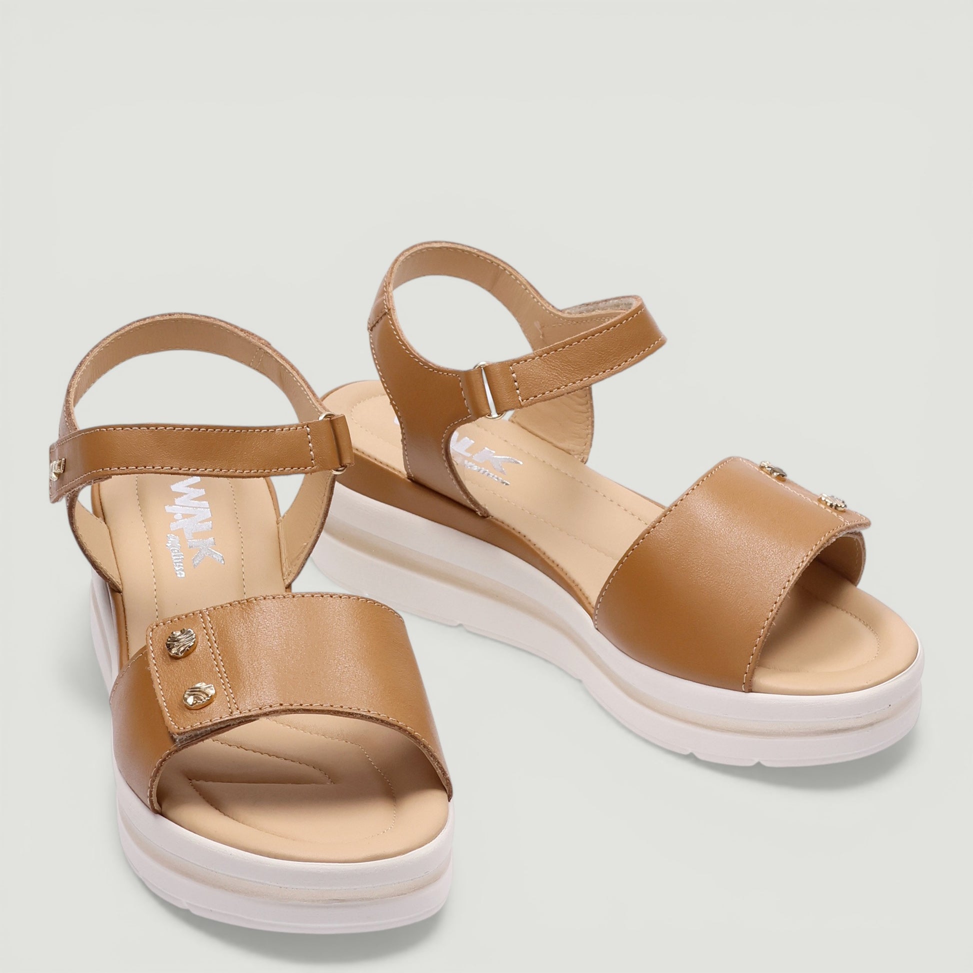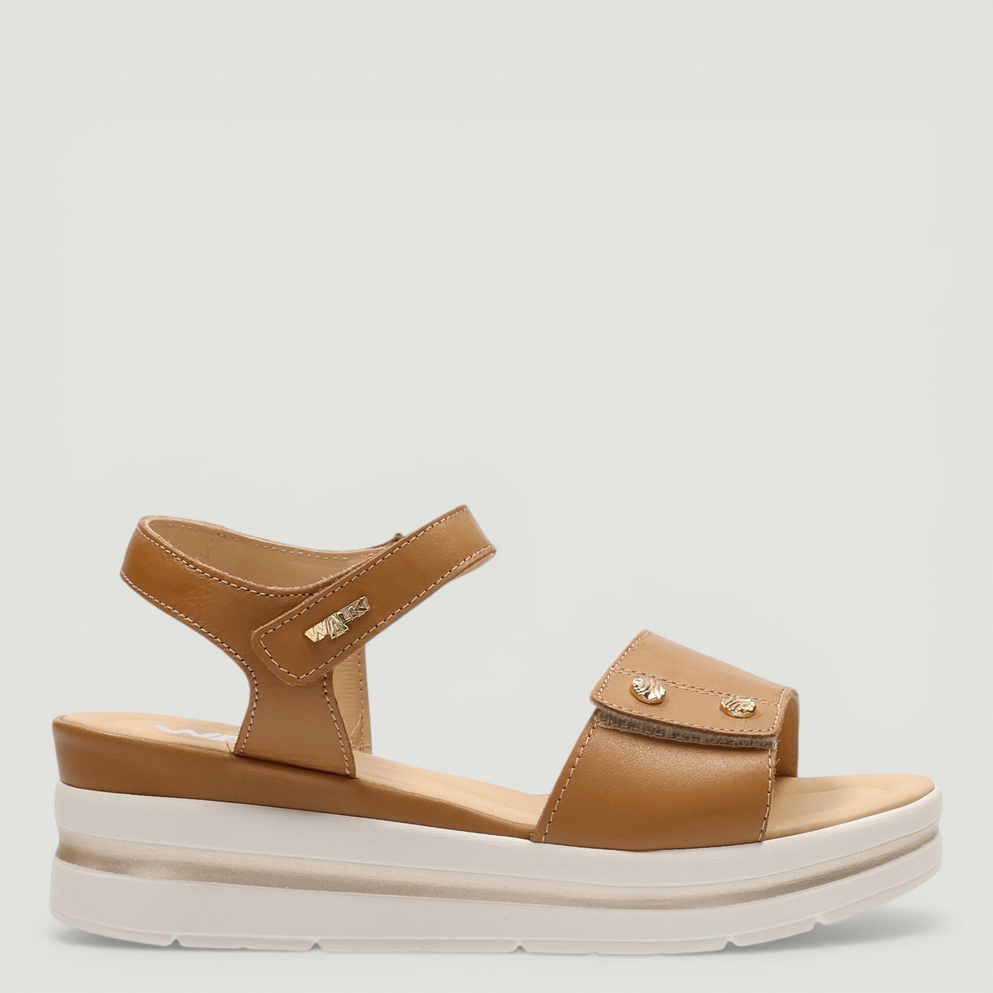 Sandalo Melluso con tomaia in pelle color cuoio. Chiusura con doppio velcro. Interno in pelle. Suola in gomma con zeppa di 6 cm. Collezione Melluso donna Primavera/Estate.