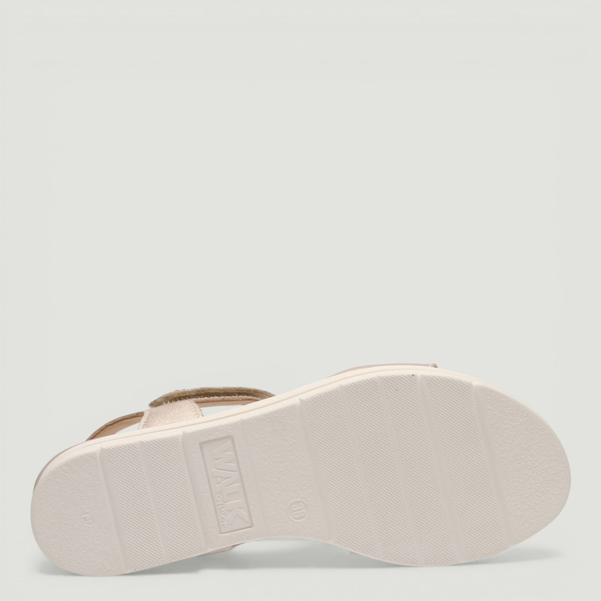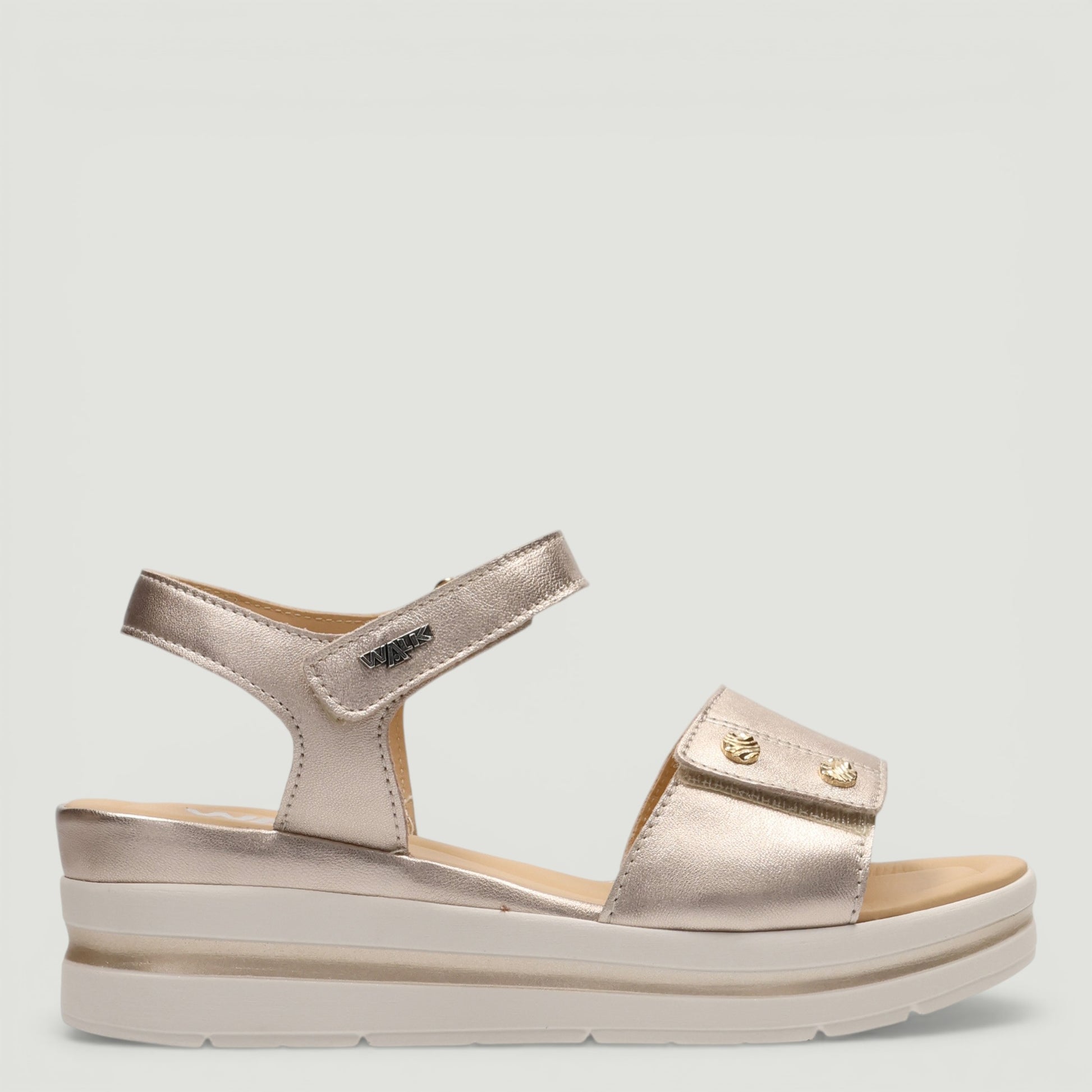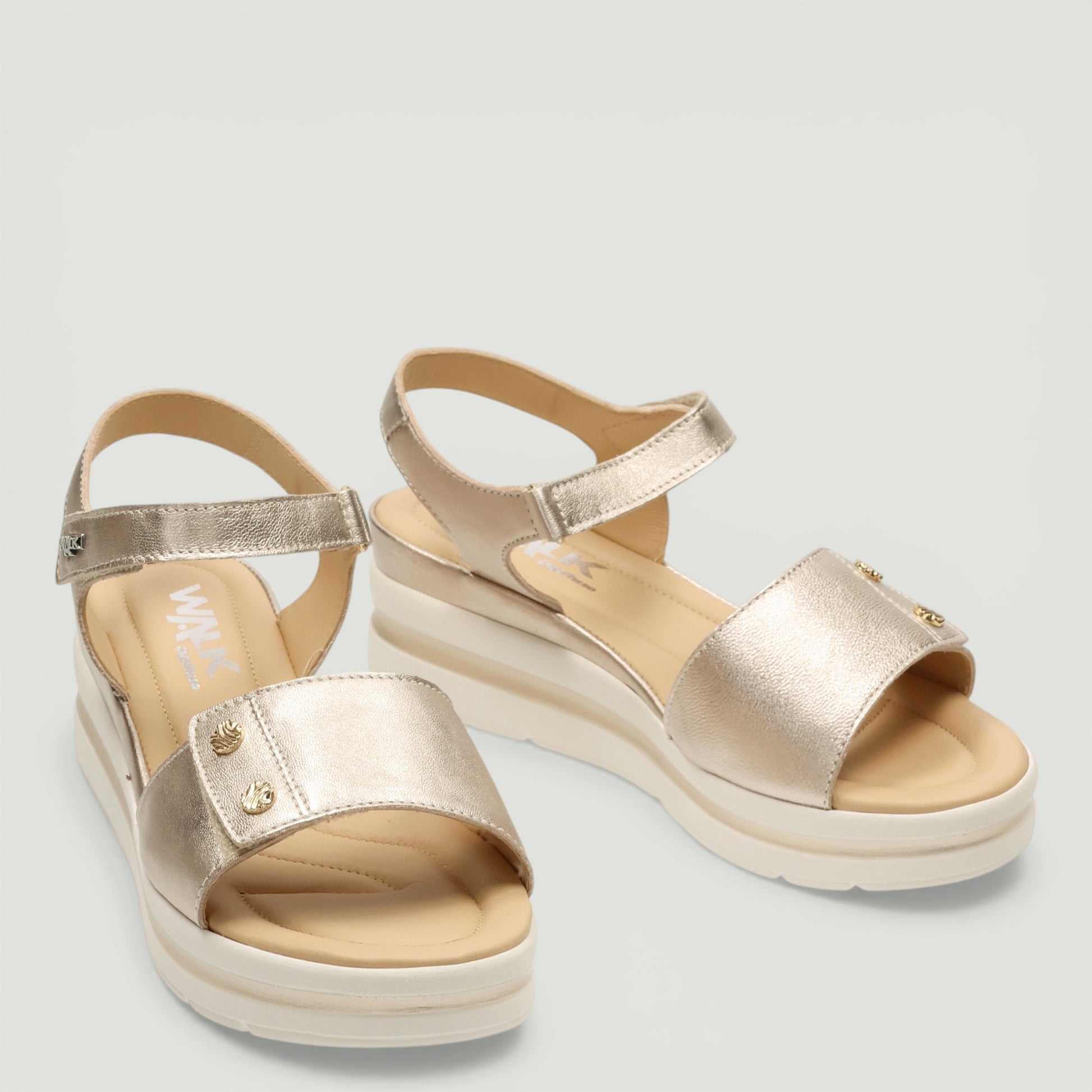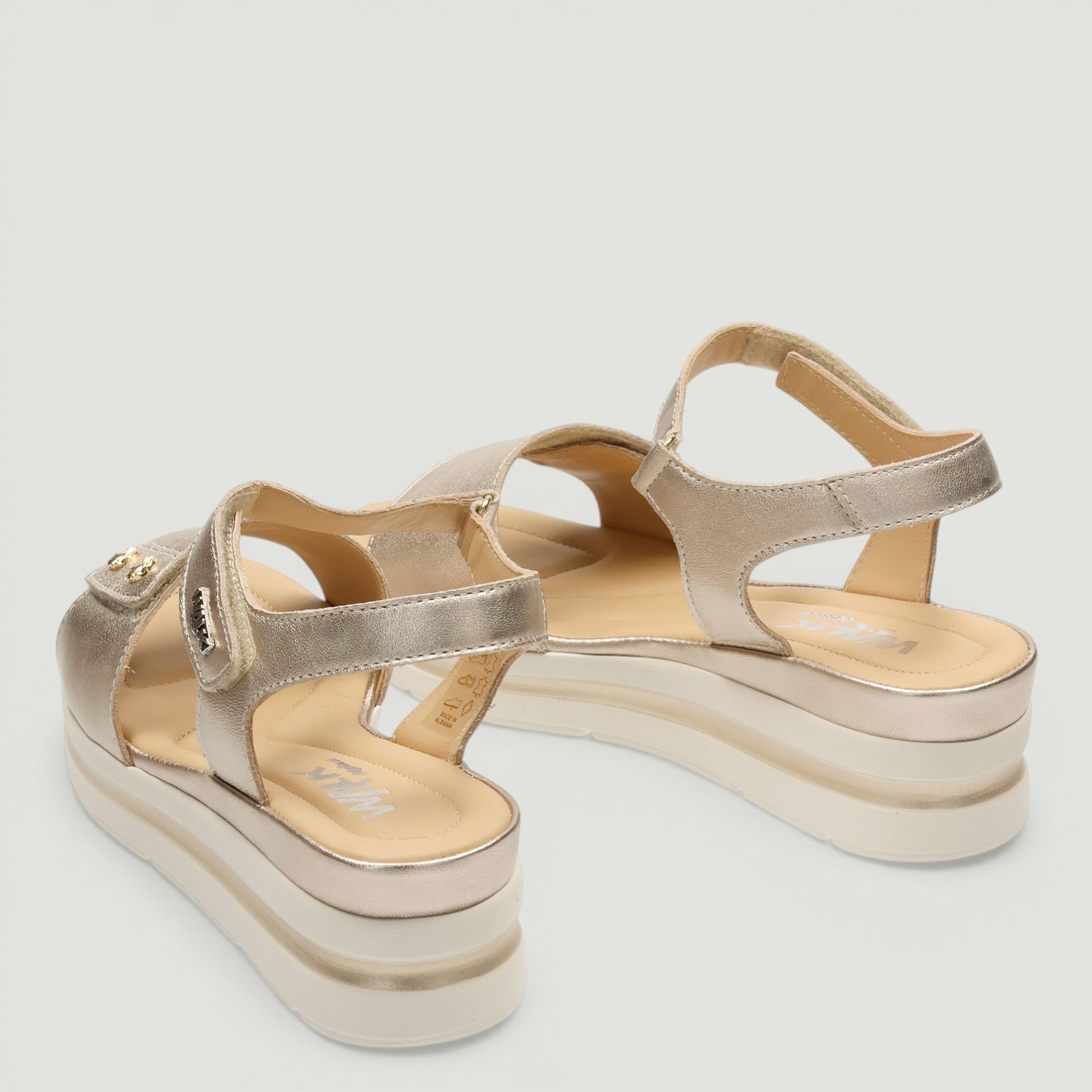 Sandalo Melluso con tomaia in pelle laminata in colore oro. Chiusura con doppio velcro. Interno in pelle. Suola in gomma con zeppa di 6 cm. Collezione Melluso donna Primavera/Estate.