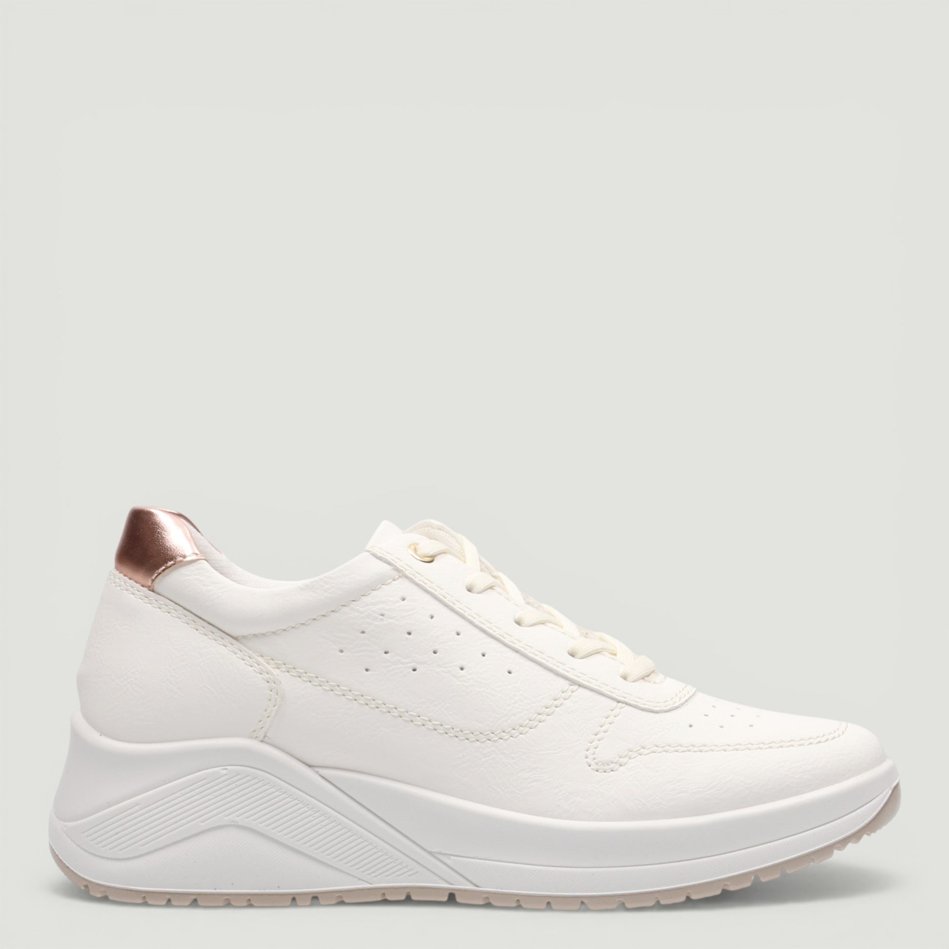 Sneakers in pelle bianca. Interno in pelle e tessuto con sottopiede in memory foam amovibile. Suola in gomma con zeppa di 5 cm. Collezione Igi&Co donna Primavera/Estate.
