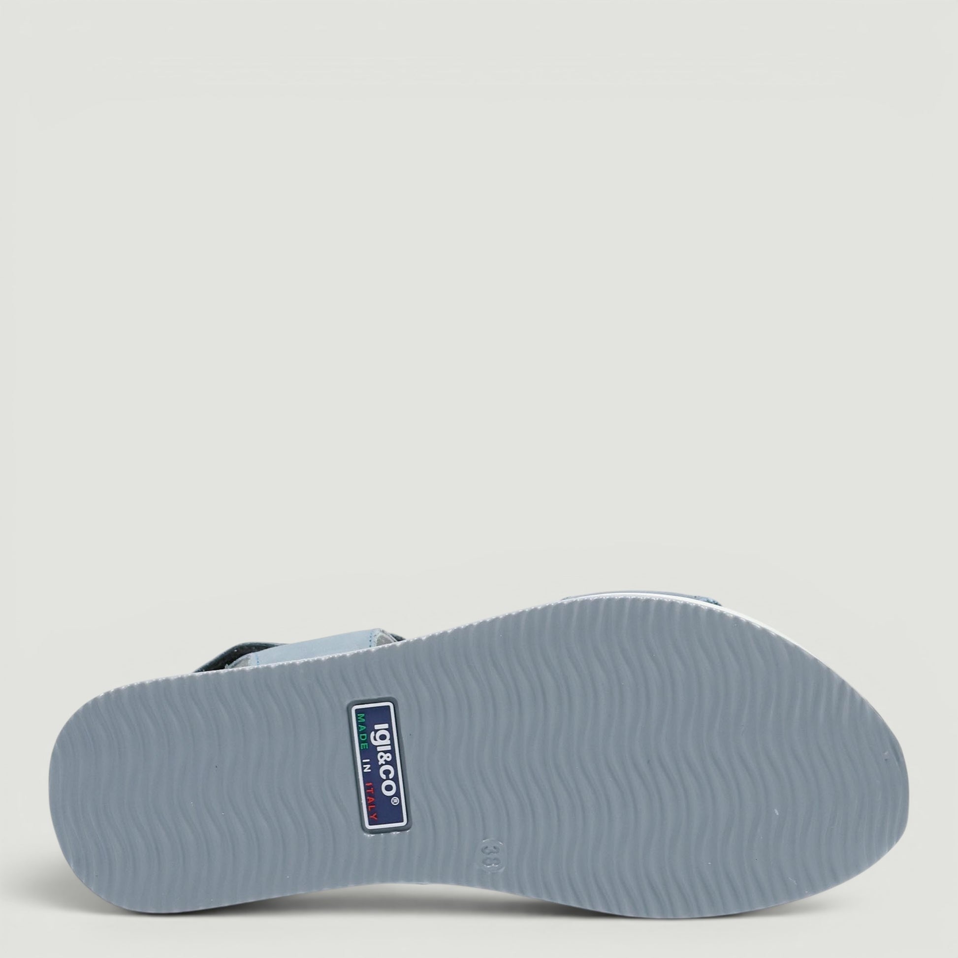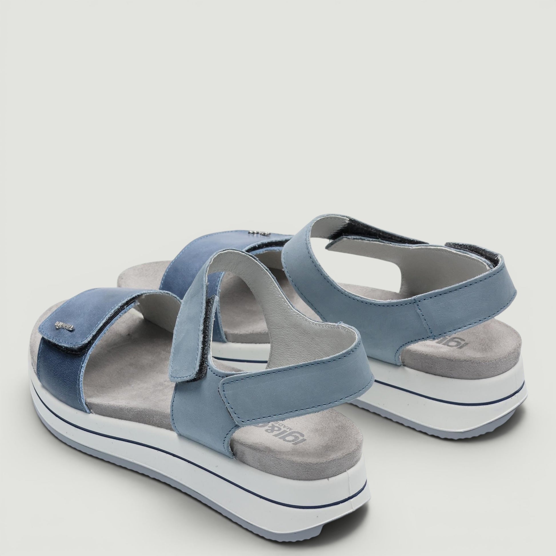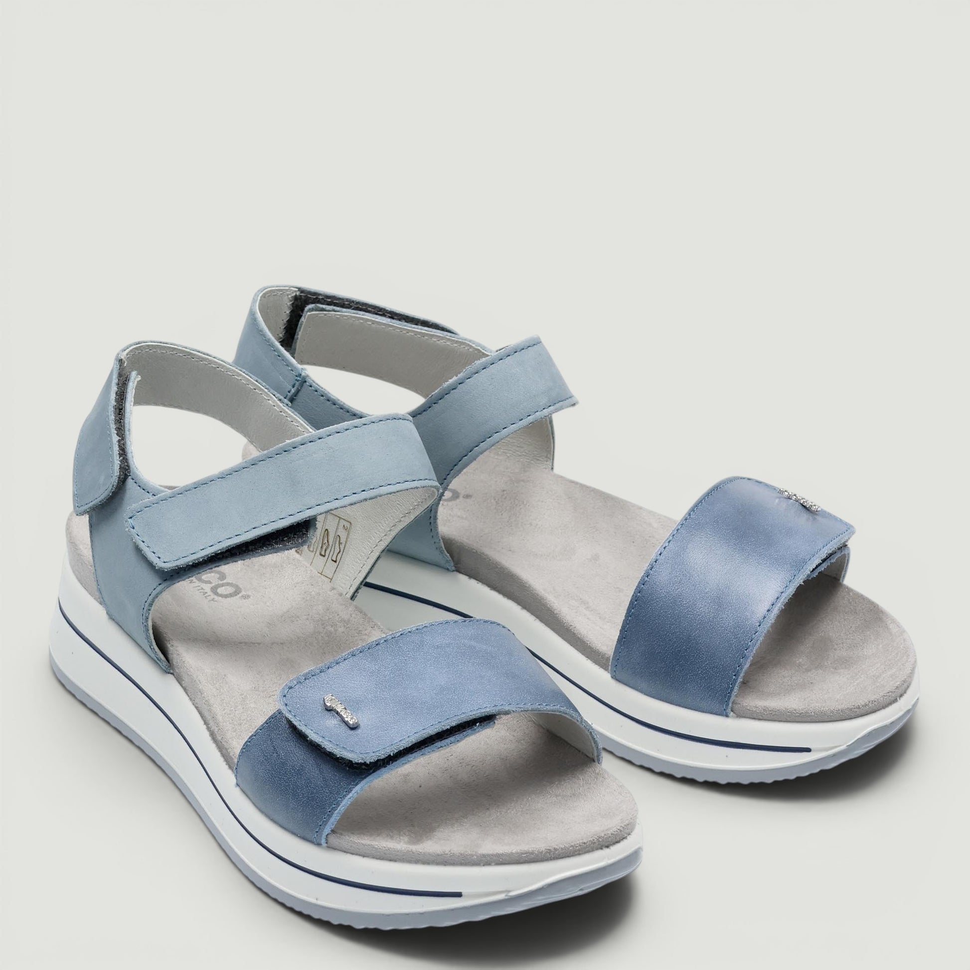 Sandalo in nabuk avio e laminato jeans. Interno in pelle con sottopiede in microfibra. Cinturini regolabili con velcro. Suola in gomma con zeppa di 4 cm. Collezione Igi&Co donna Primavera/Estate.