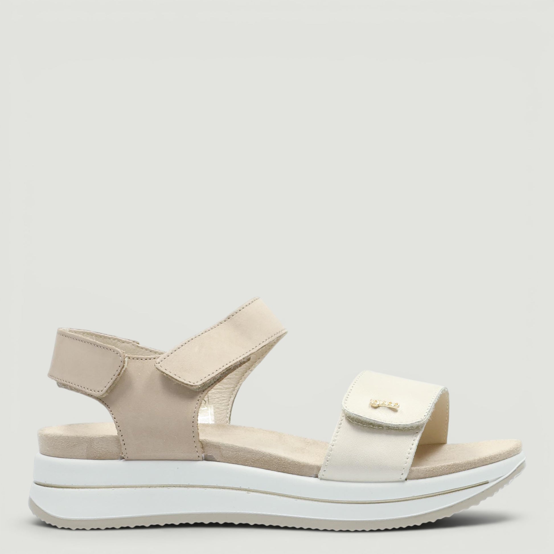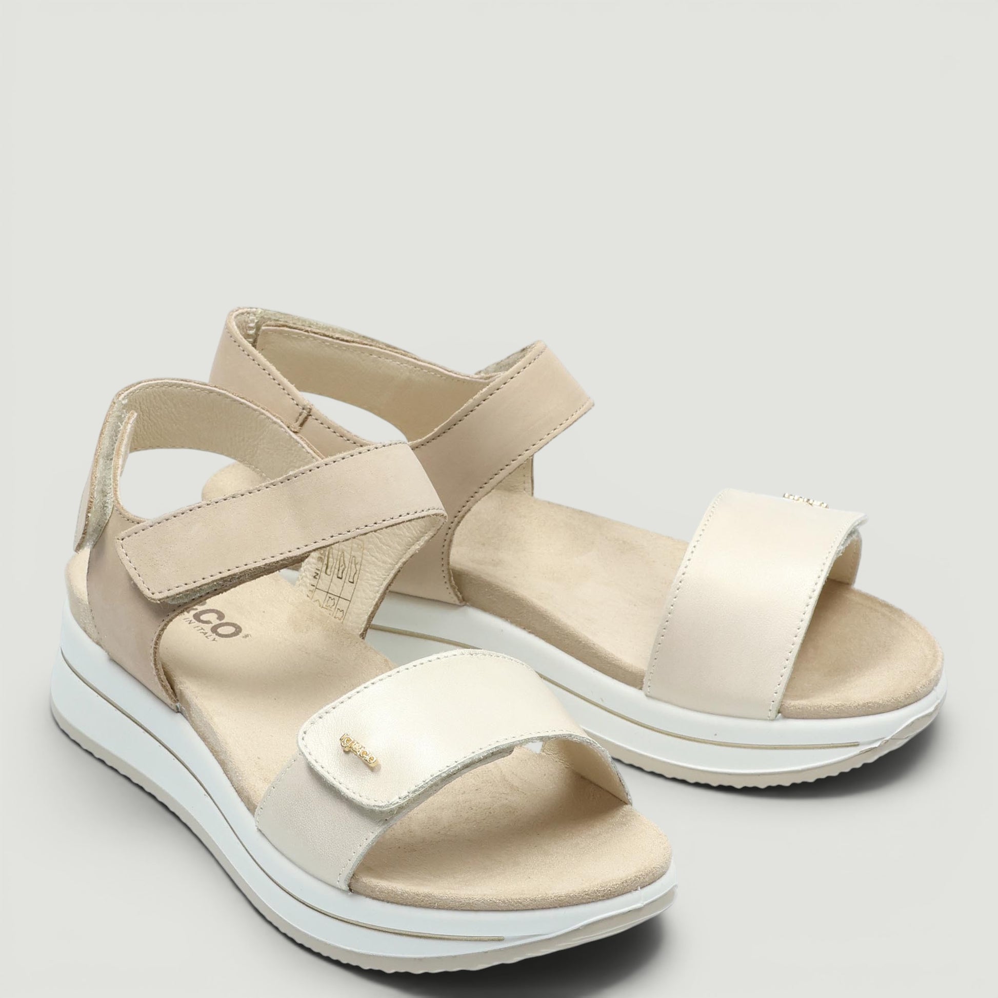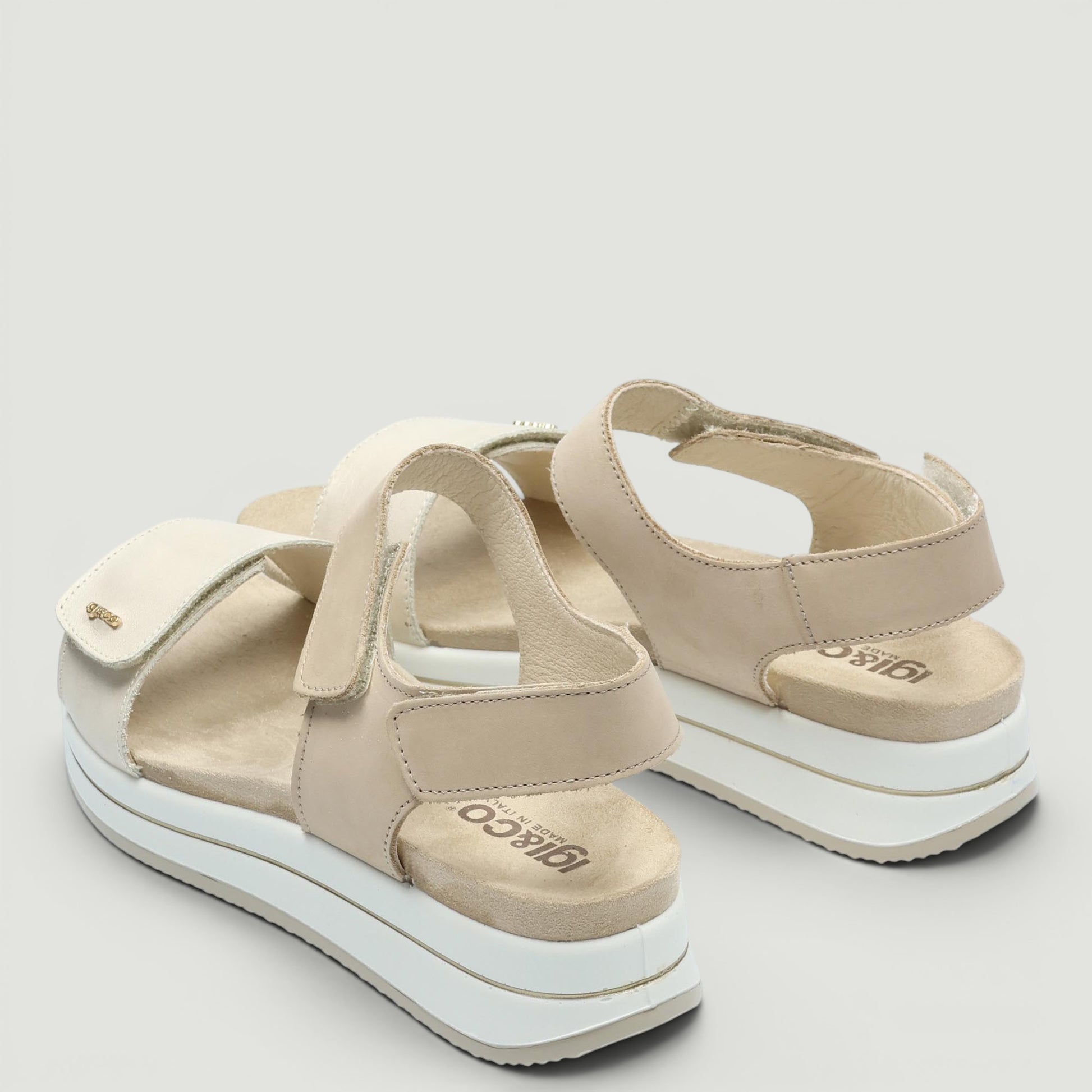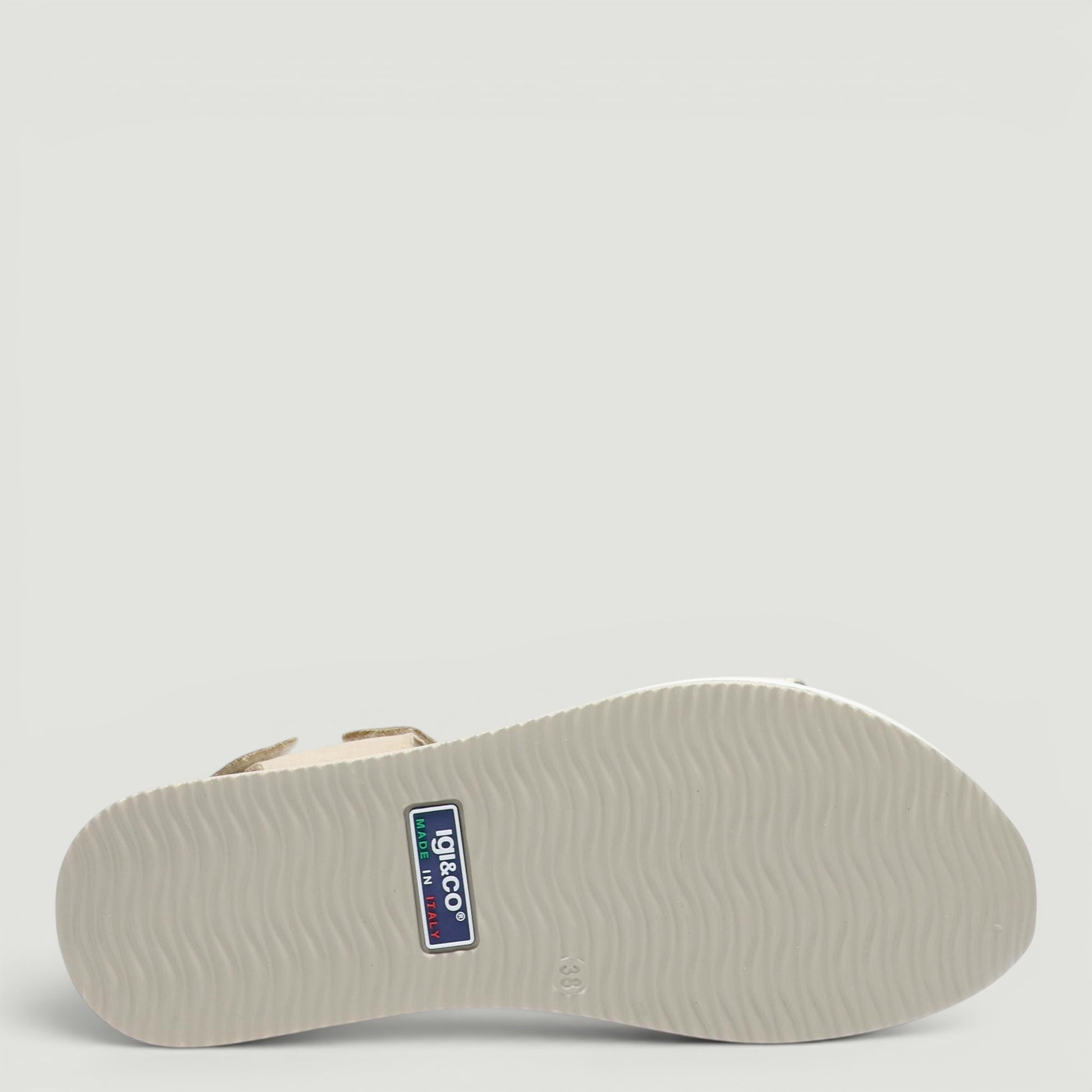 Sandalo in pelle beige e laminato platino. Interno in pelle con sottopiede in microfibra. Cinturini regolabili con velcro. Suola in gomma con zeppa di 4 cm. Collezione Igi&Co donna Primavera/Estate.