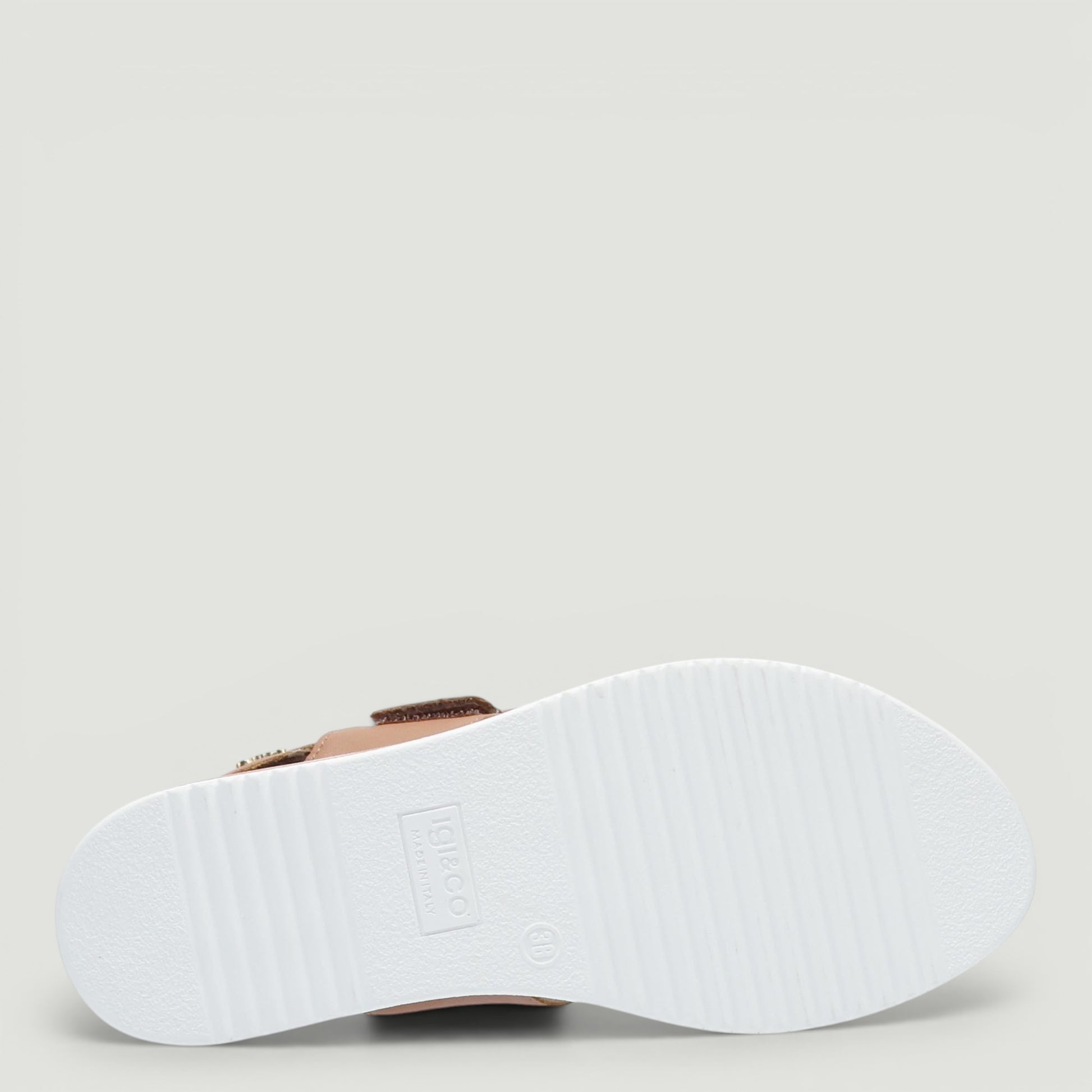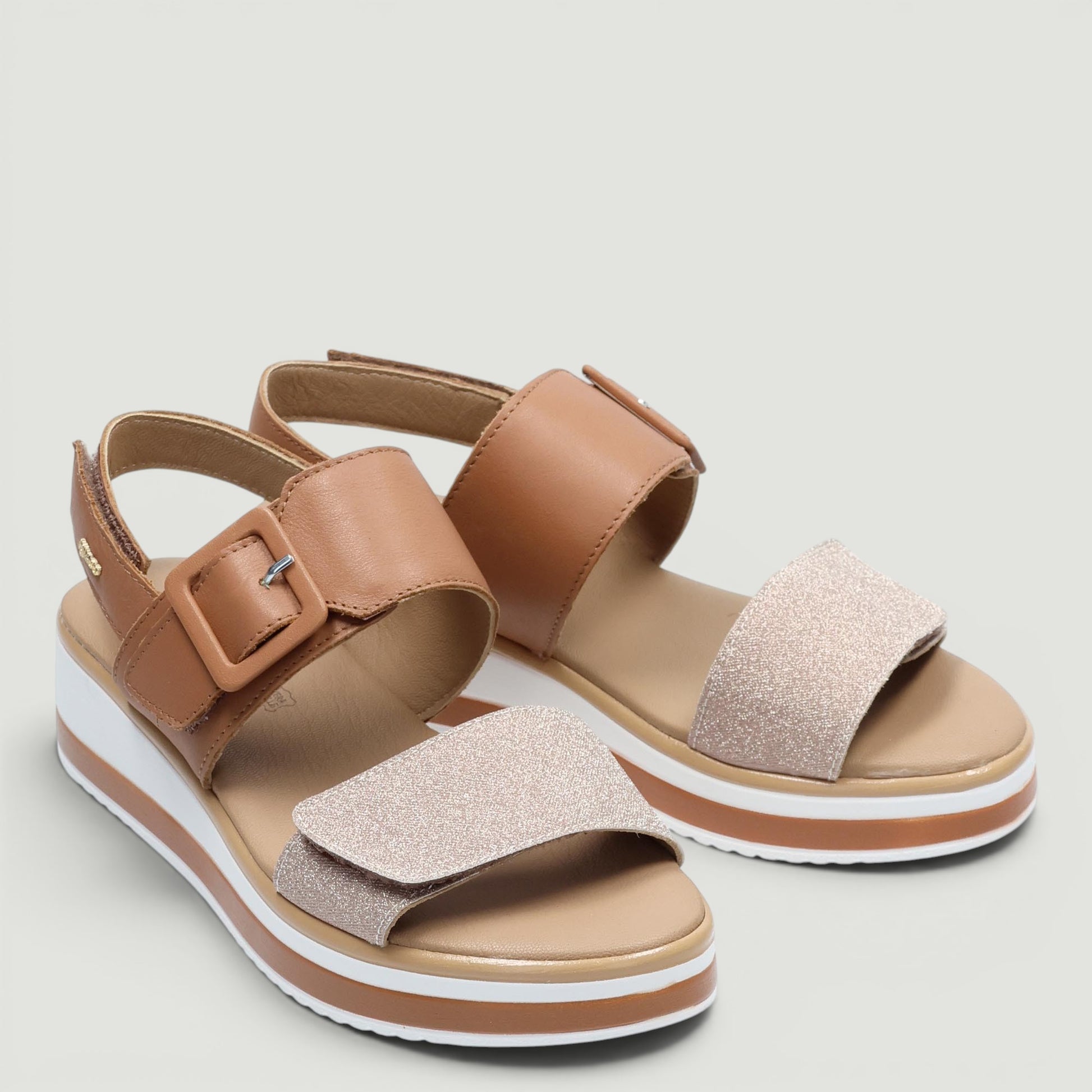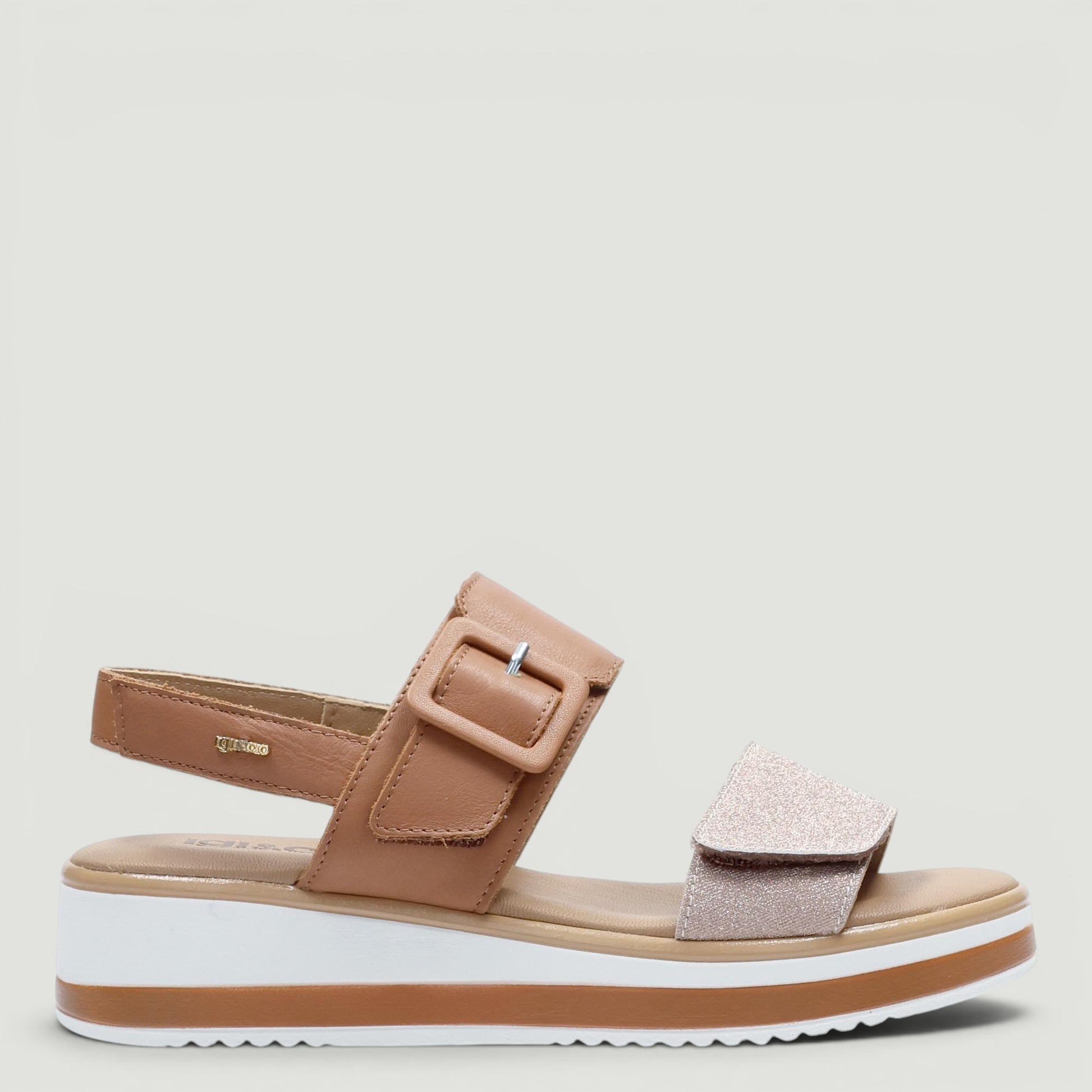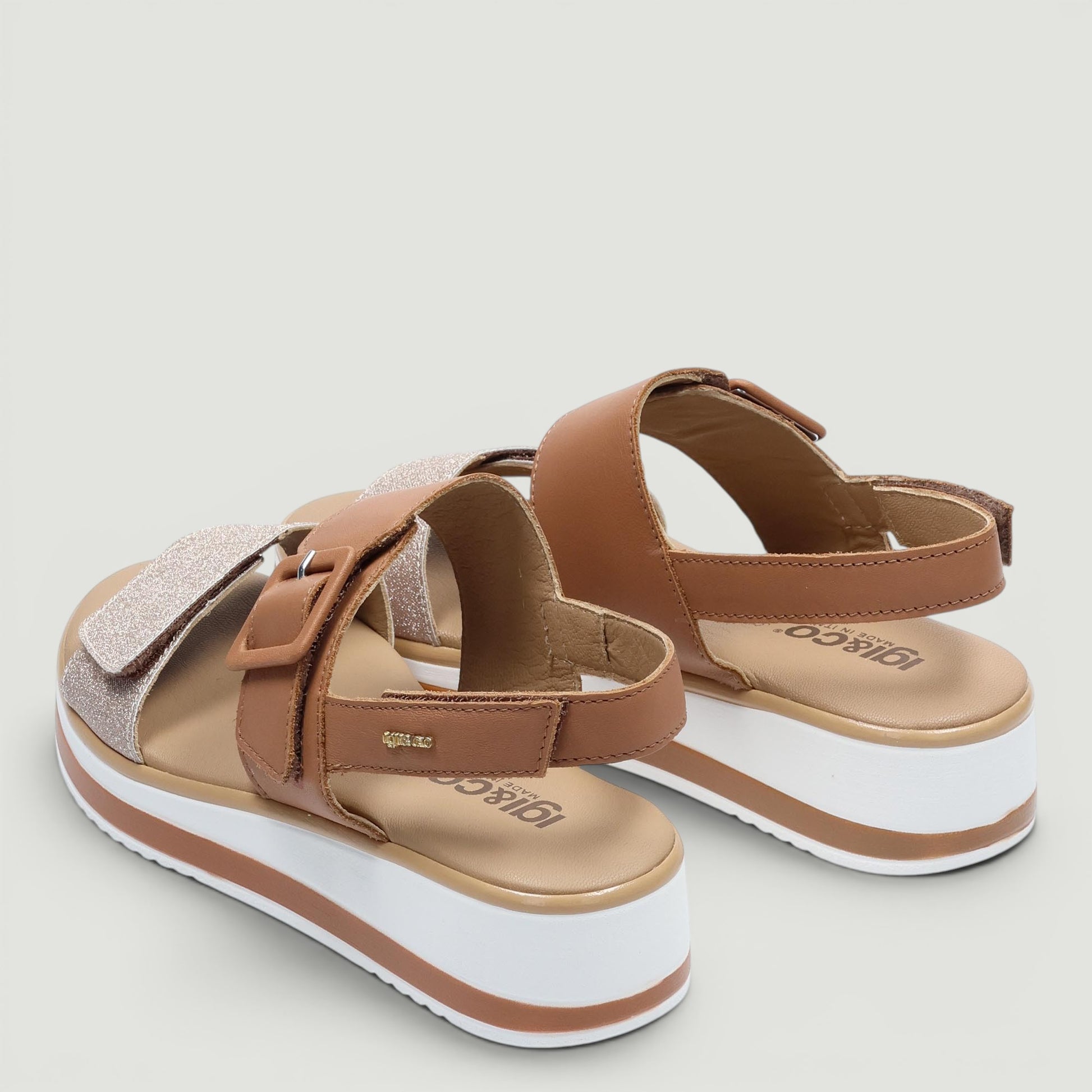 Sandalo in tessuto laminato rame e pelle cuoio. Interno in pelle con sottopiede imbottito. Cinturini regolabili con velcro. Suola in gomma con zeppa dii 4,5 cm. Collezione Igi&Co donna Primavera/Estate.
