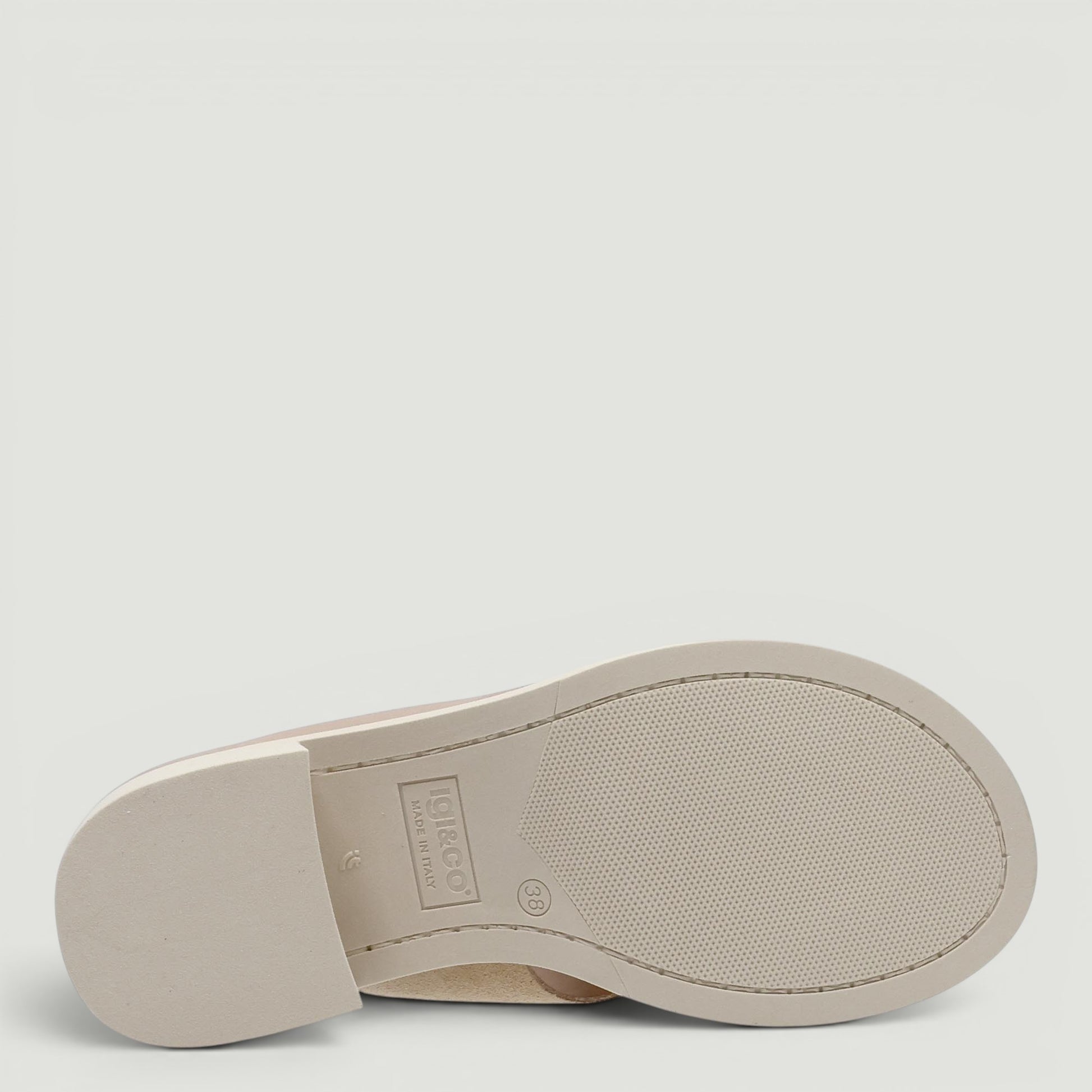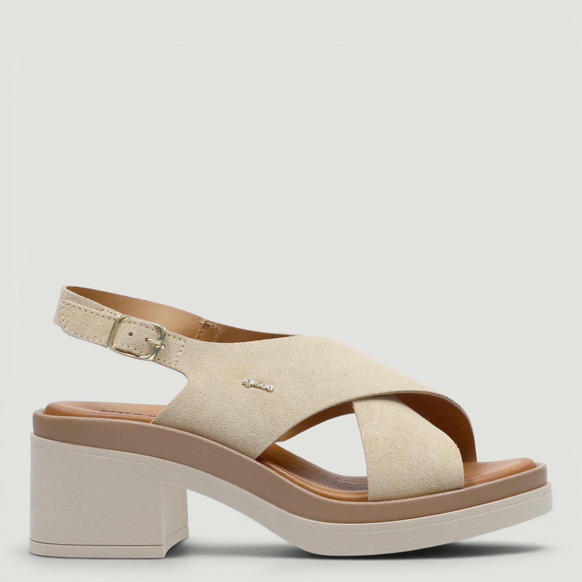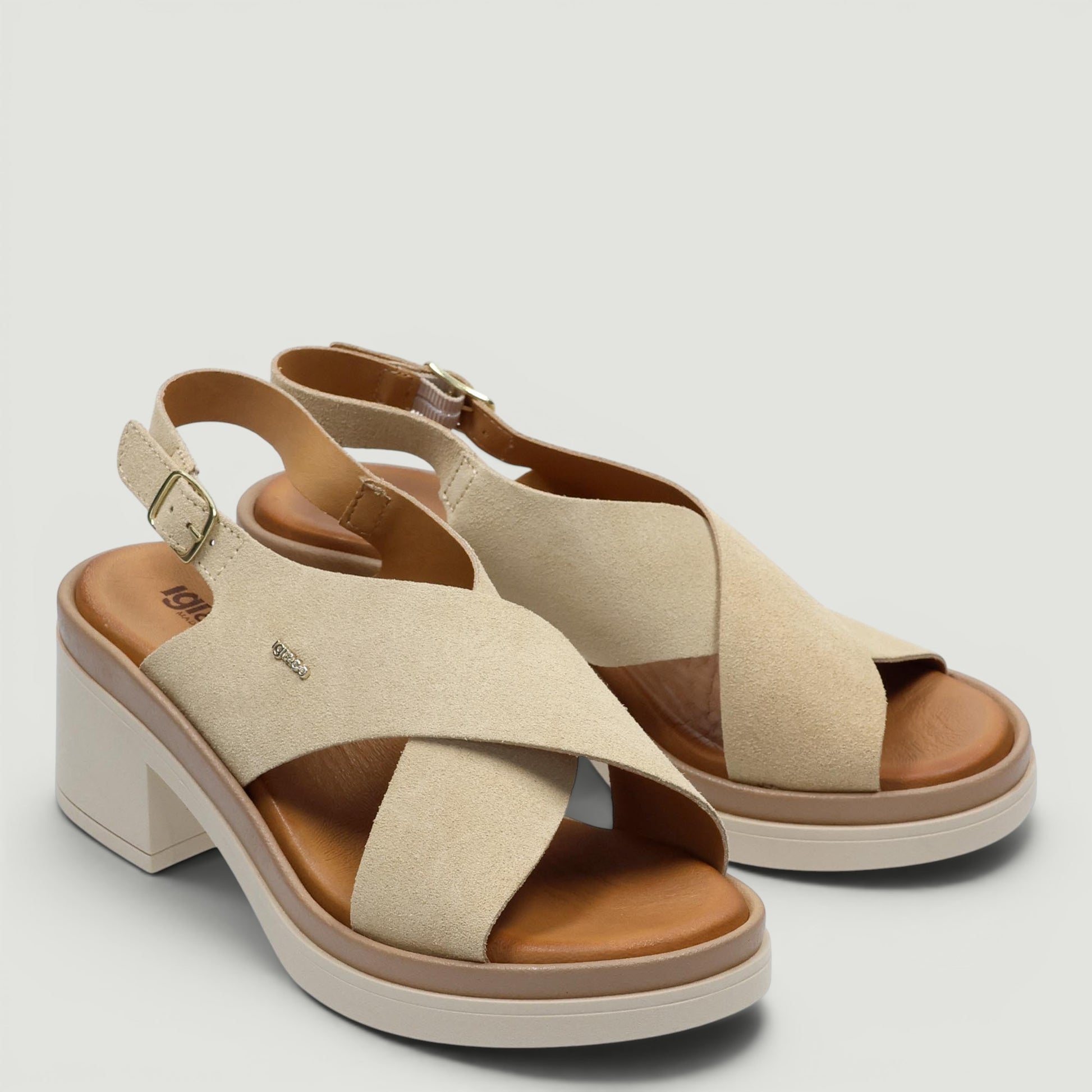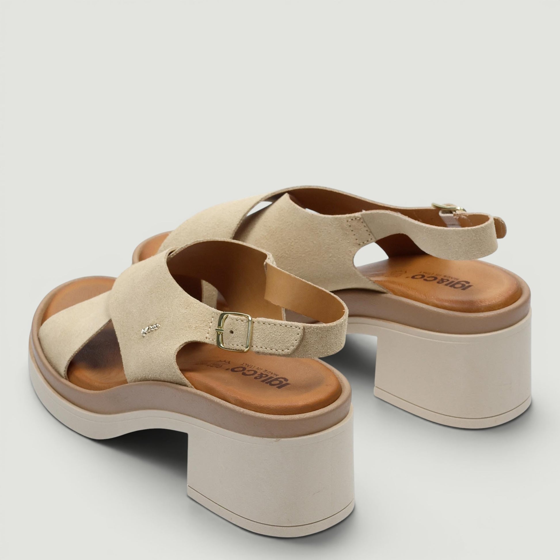 Sandalo con tomaia in pelle scamosciata beige. Interno in ecopelle con sottopiede in pelle memory foam. Cinturino regolabile. Suola in gomma con tacco dii 6 cm. Collezione Igi&Co donna Primavera/Estate.