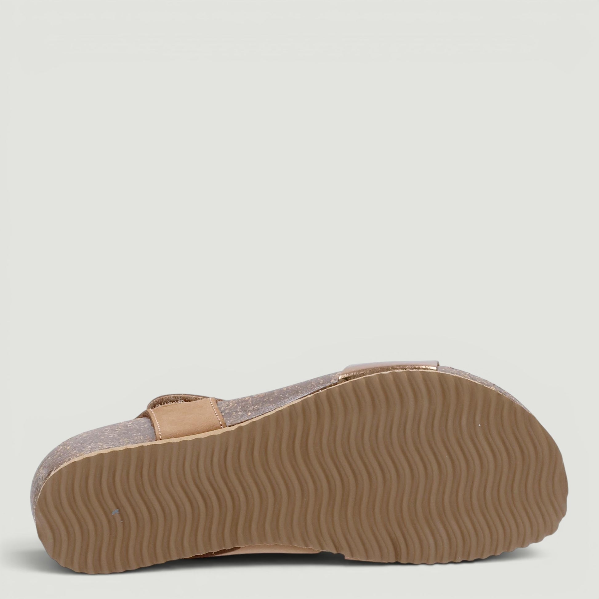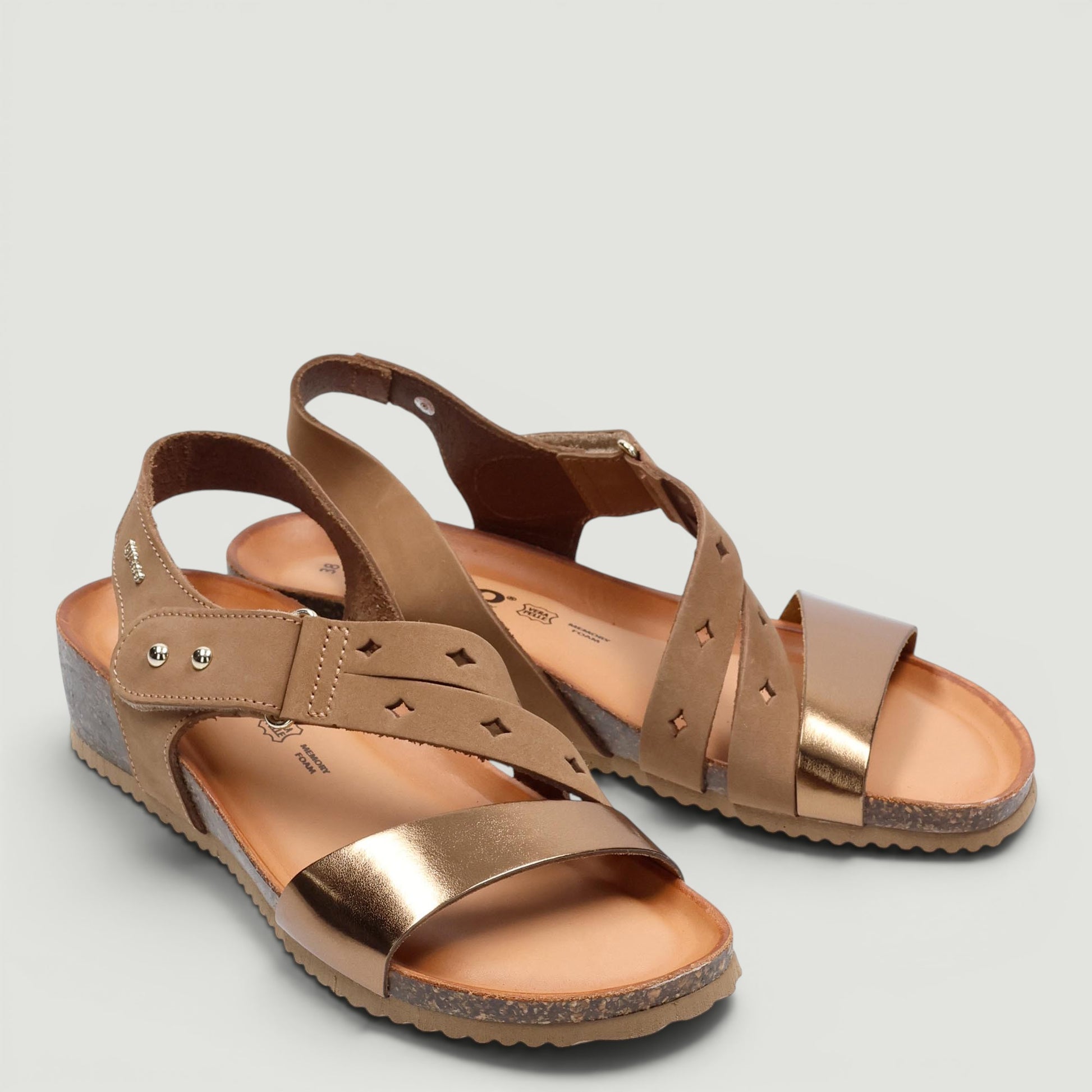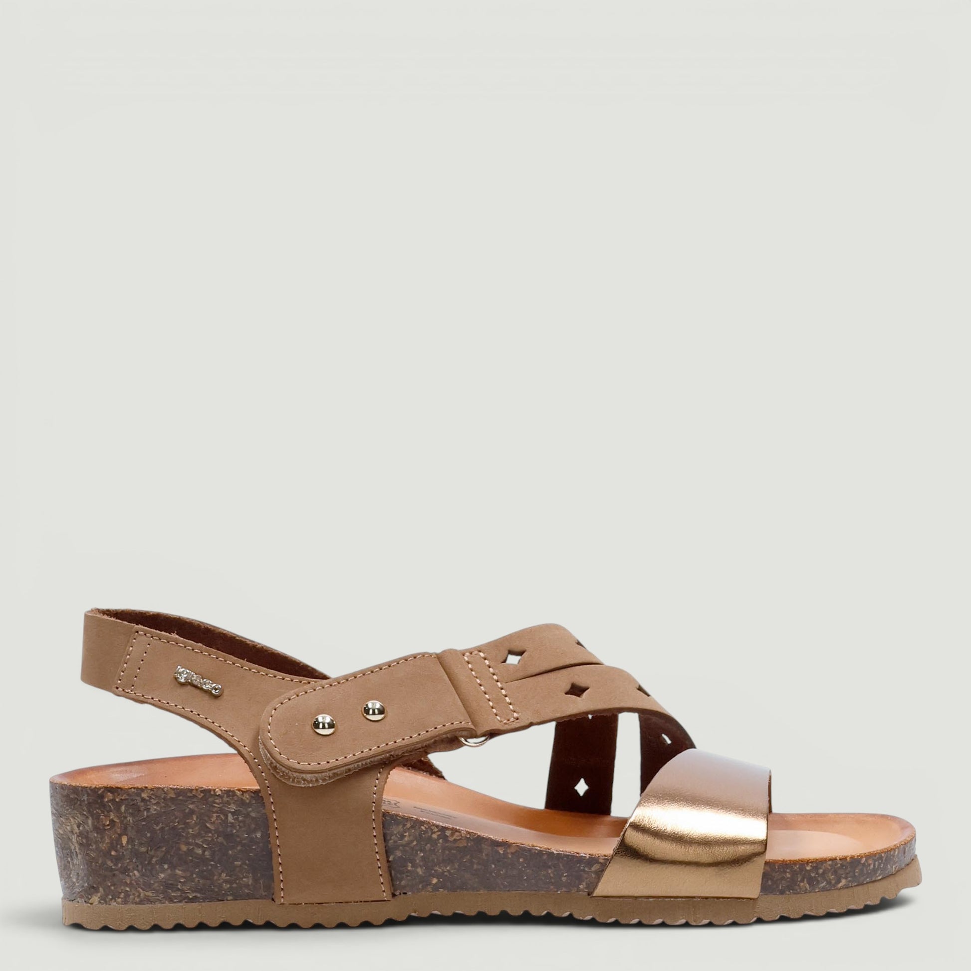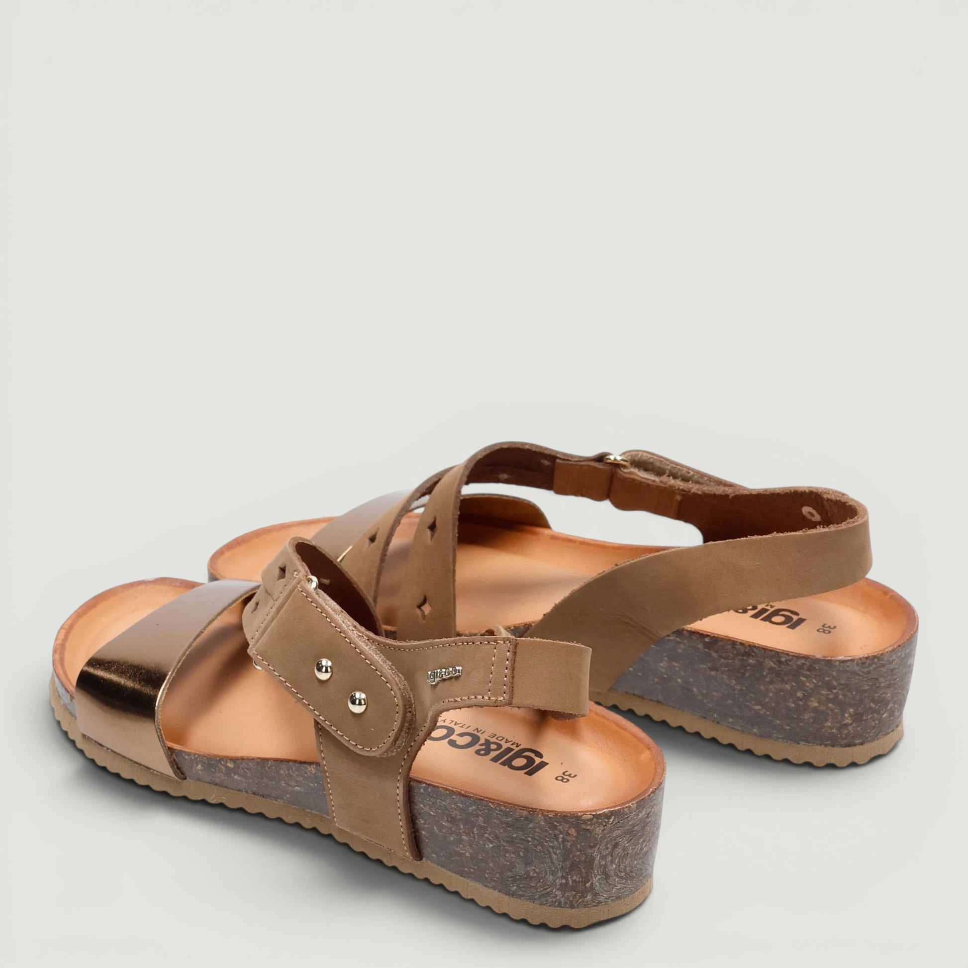 Sandalo in nabuk cuoio e pelle laminata bronzo. Chiusura con velcro regolabile. Interno in pelle con sottopiede memory foam in pelle. Suola in gomma con zeppa di 3 cm. Collezione Igi&Co donna Primavera/Estate.