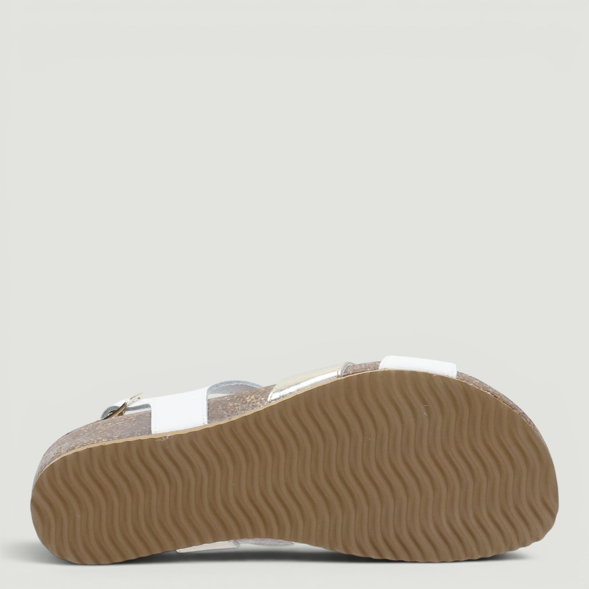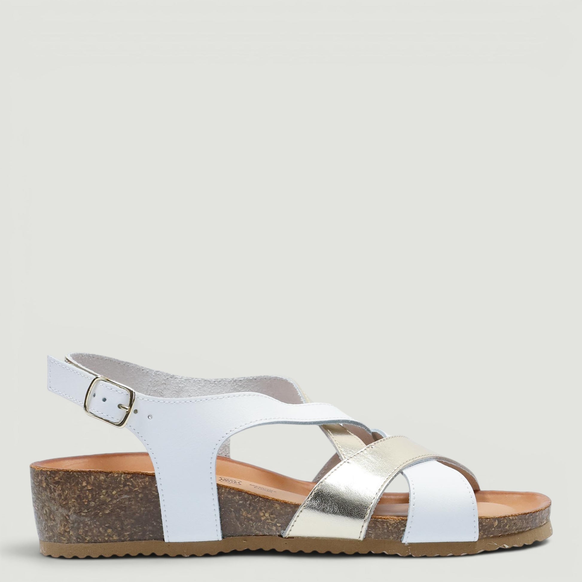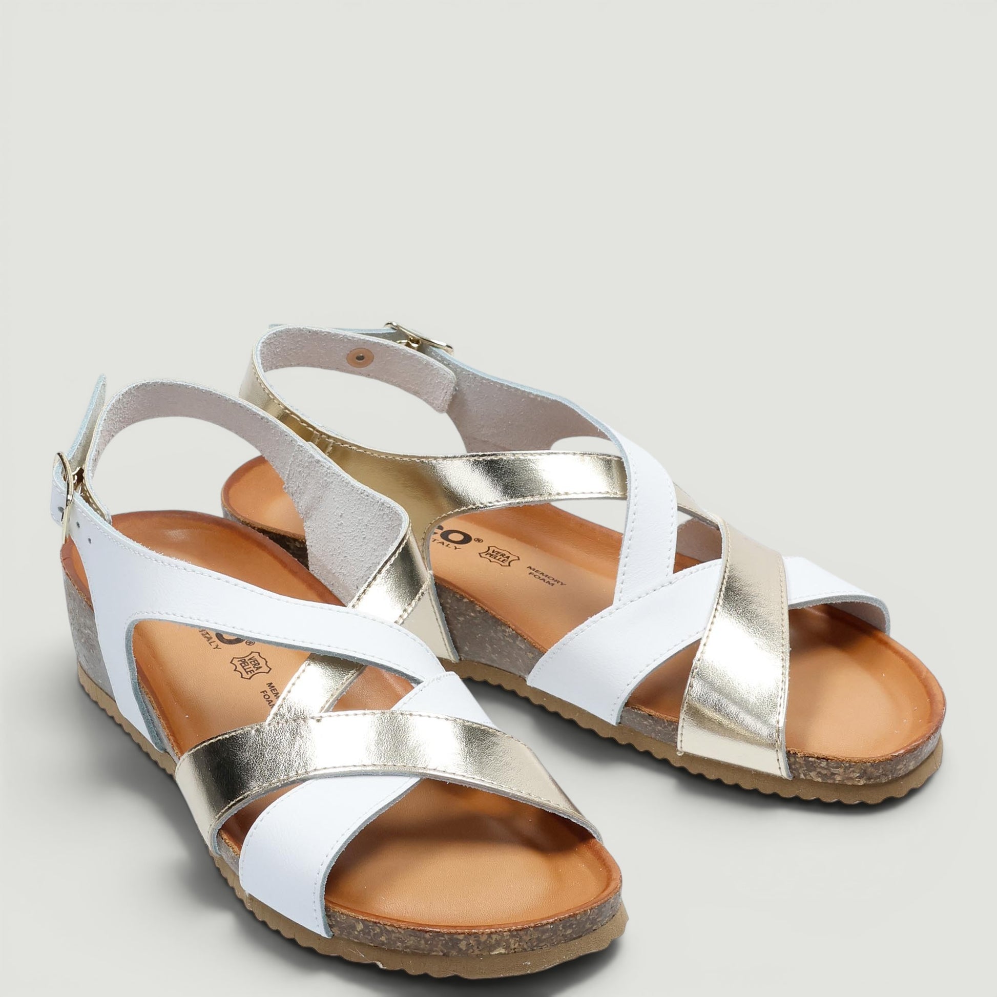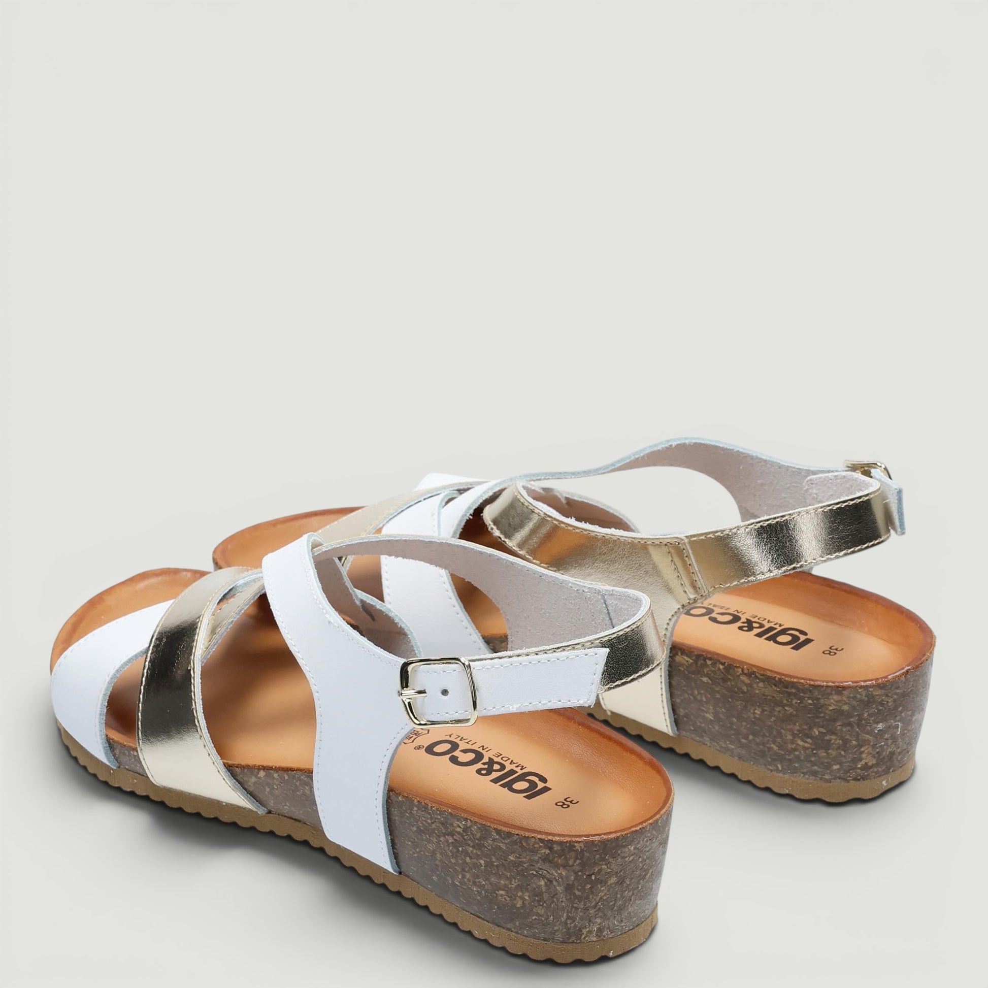 Sandalo in pelle bianca e pelle laminata oro. Chiusura con cinturino regolabile. Interno in pelle con sottopiede memory foam in pelle. Suola in gomma con zeppa di 3 cm. Collezione Igi&Co donna Primavera/Estate.