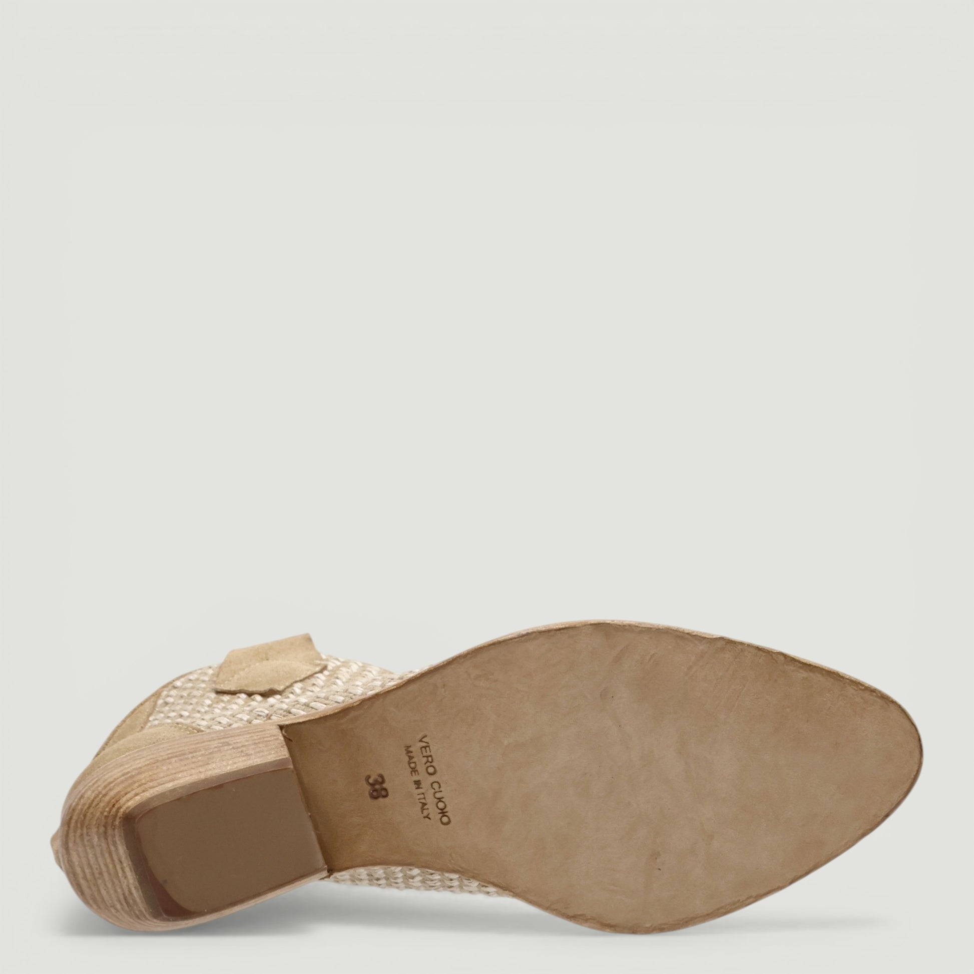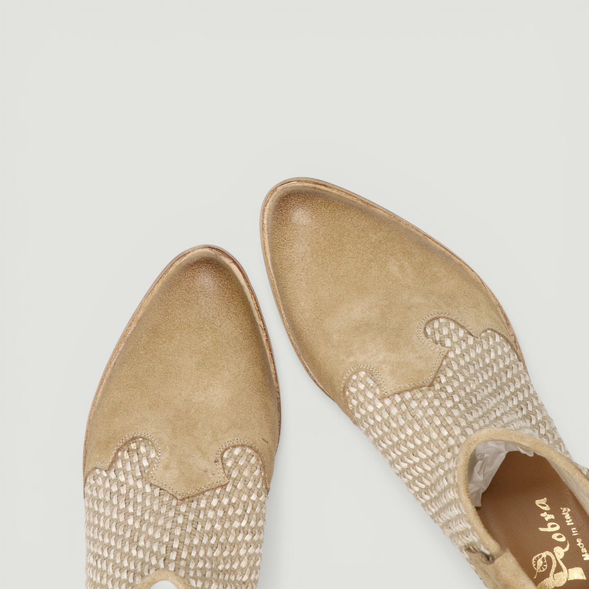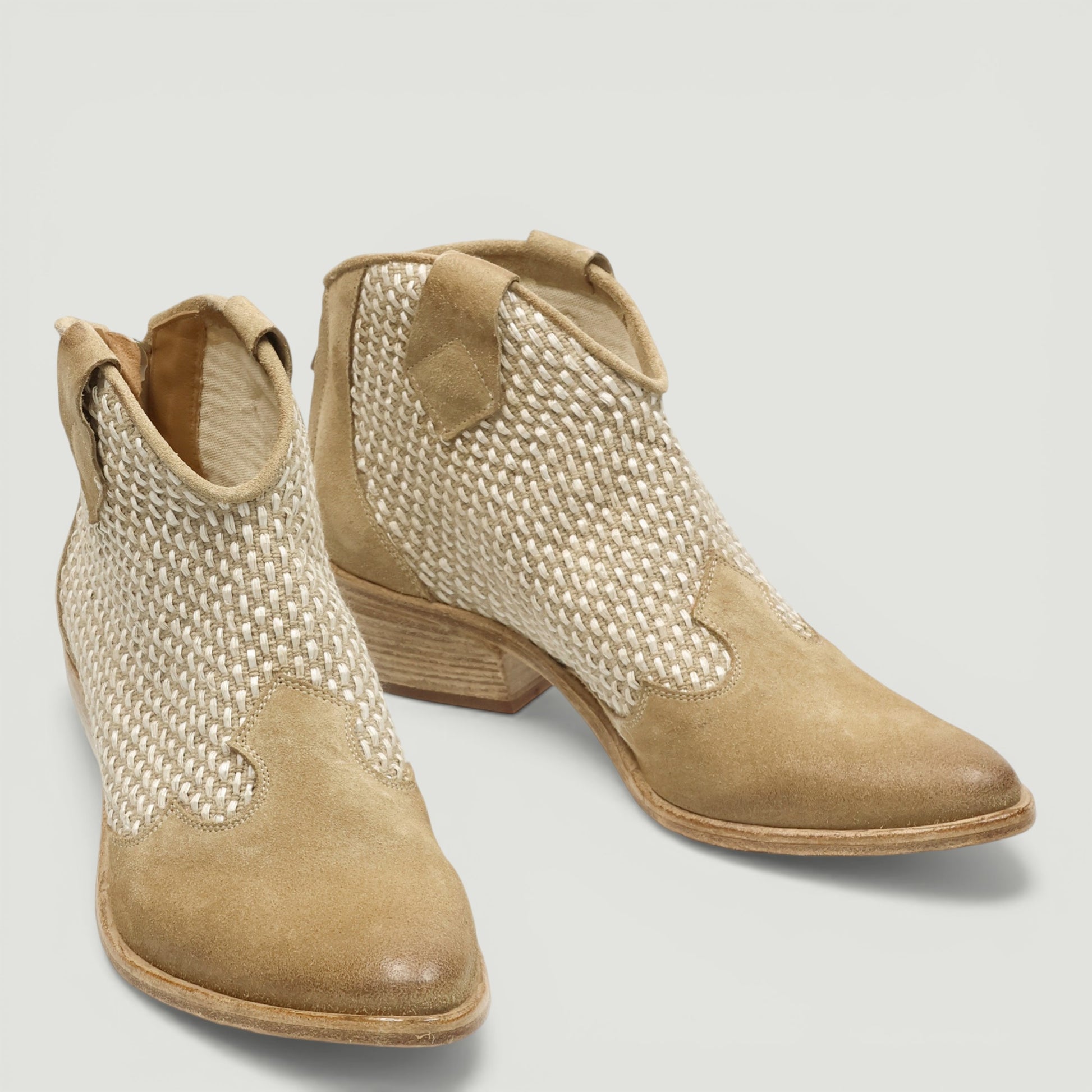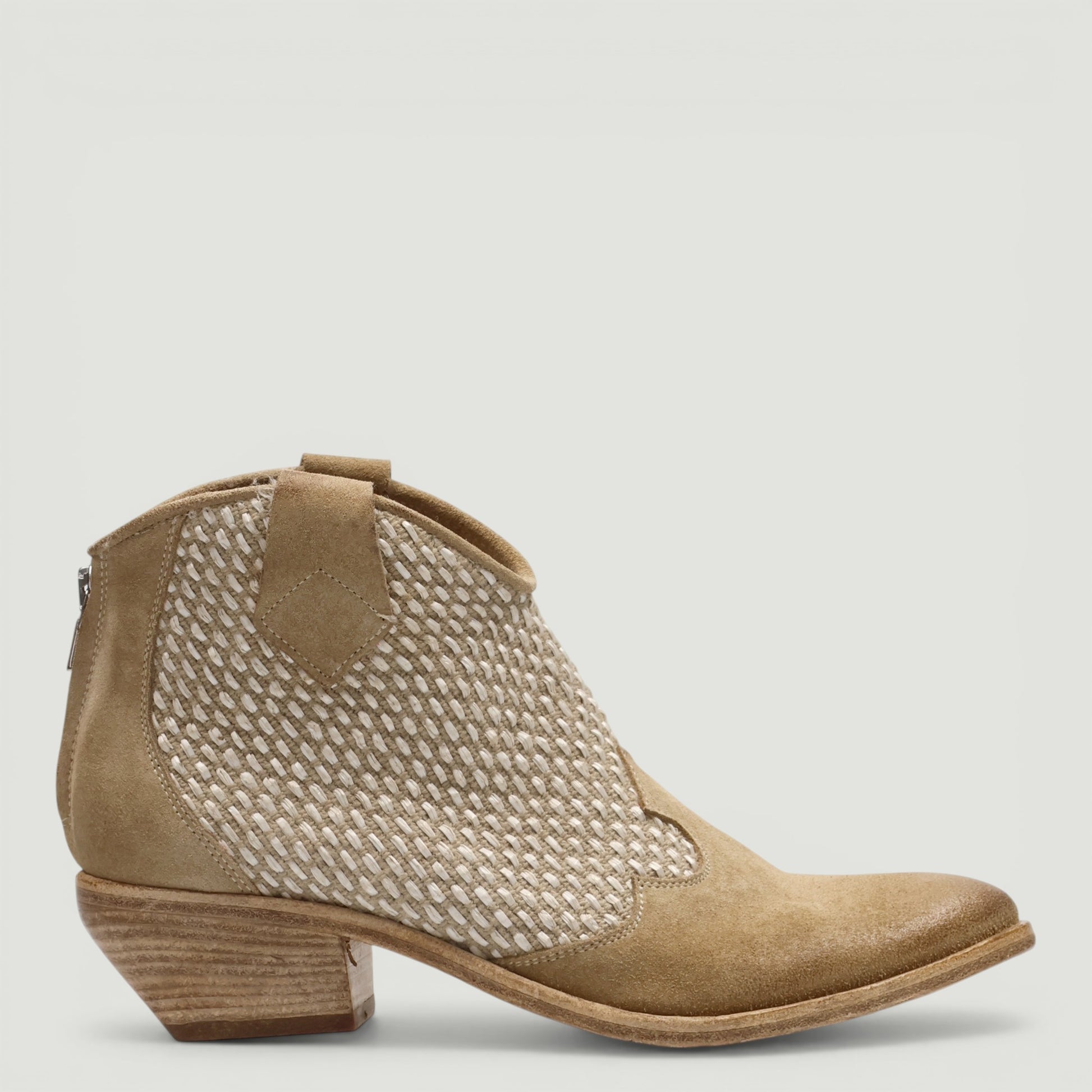Texanino in pelle scamosciata sabbia con gambale in tessuto. Chiusura con zip posteriore. Interno in pelle e tessuto. Sottopiede non rimovibile. Suola in cuoio con tacco di 4 cm. Collezione Kobra donna.