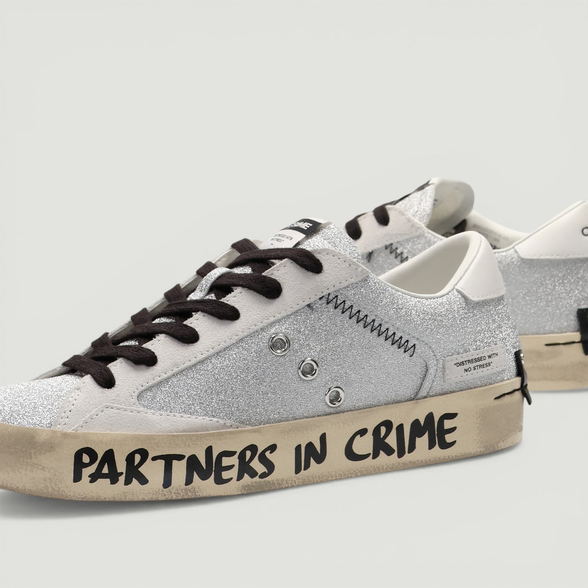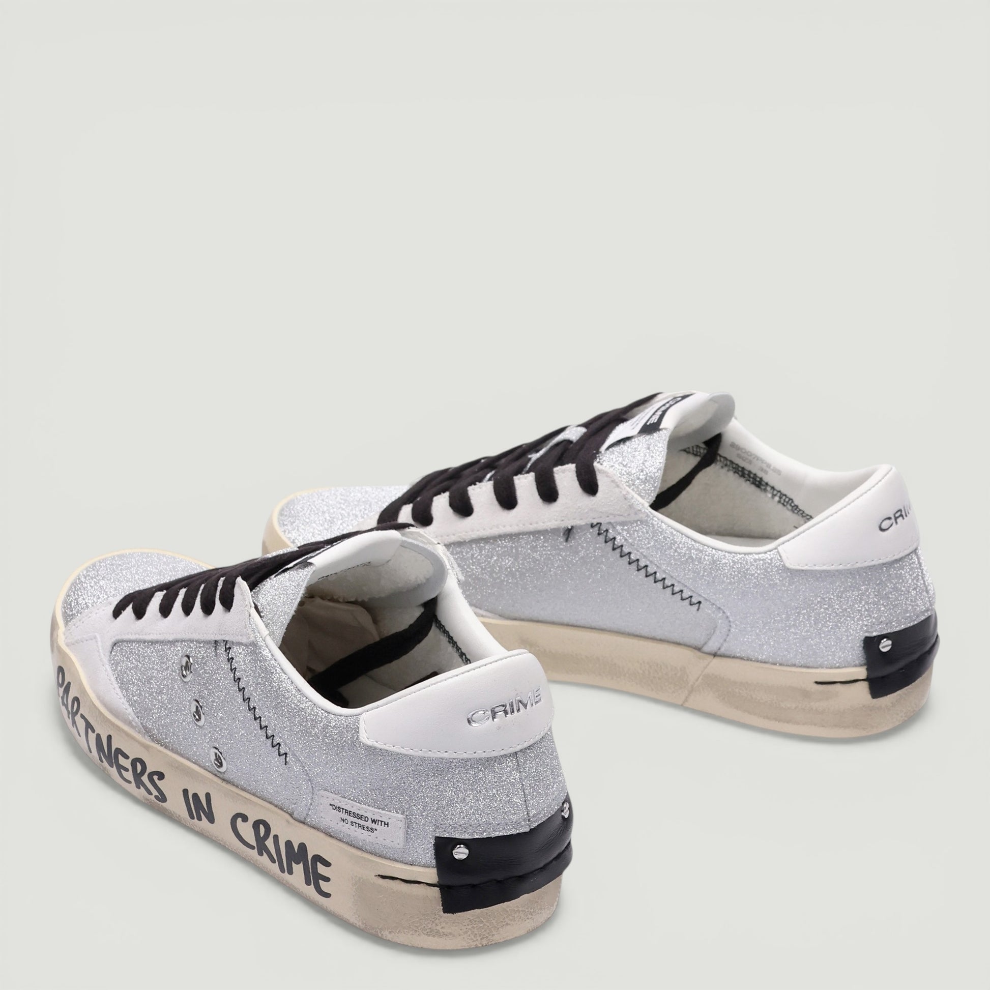 Sneakers in micro glitter argento e pelle scamosciata bianca. Linguetta con logo. Chiusura con lacci di cotone neri + lacci di ricambio avorio. Interno in tessuto con sottopiede amovibile in pelle. Suola in gomma di 3 cm con scritta laterale. Collezione Crime London donna.