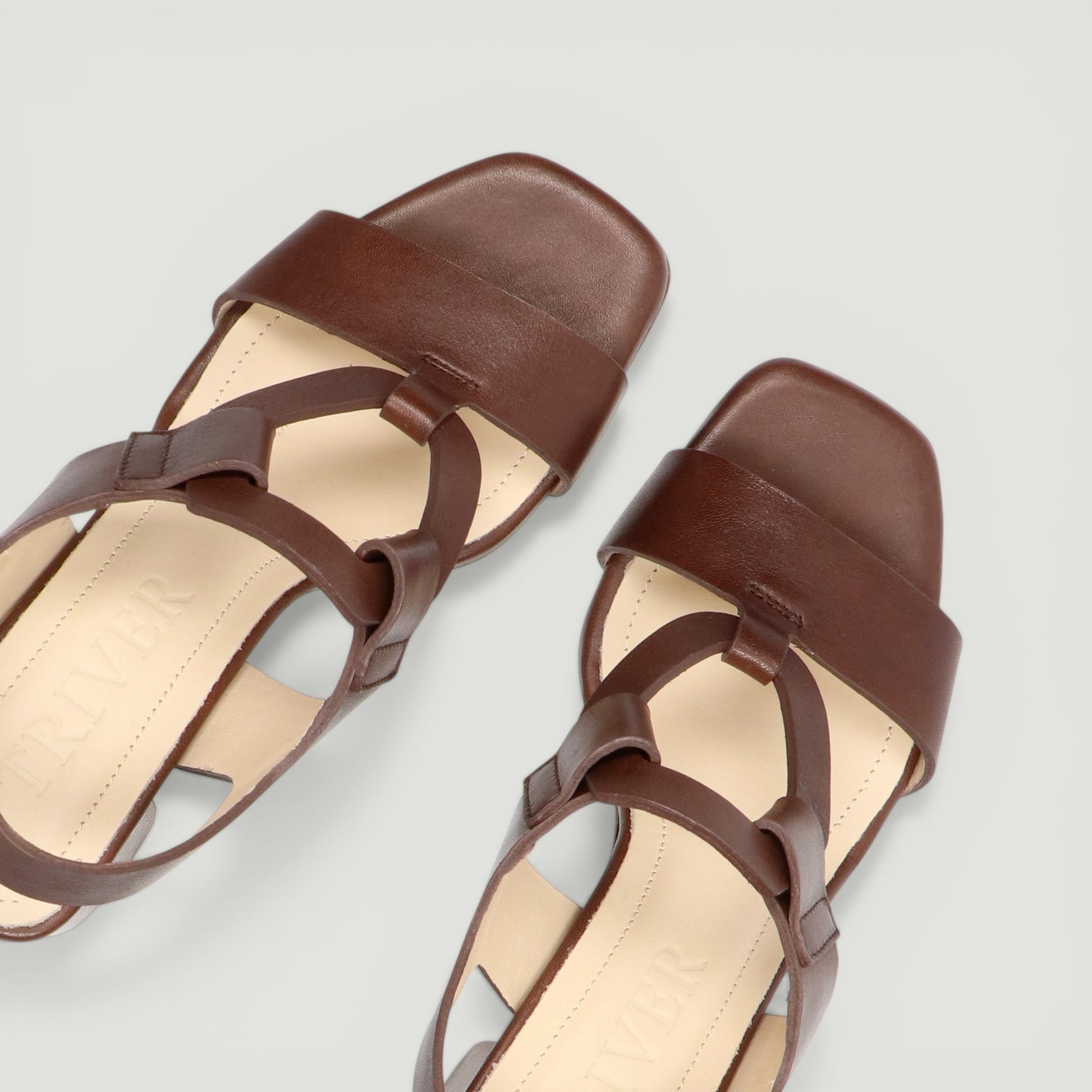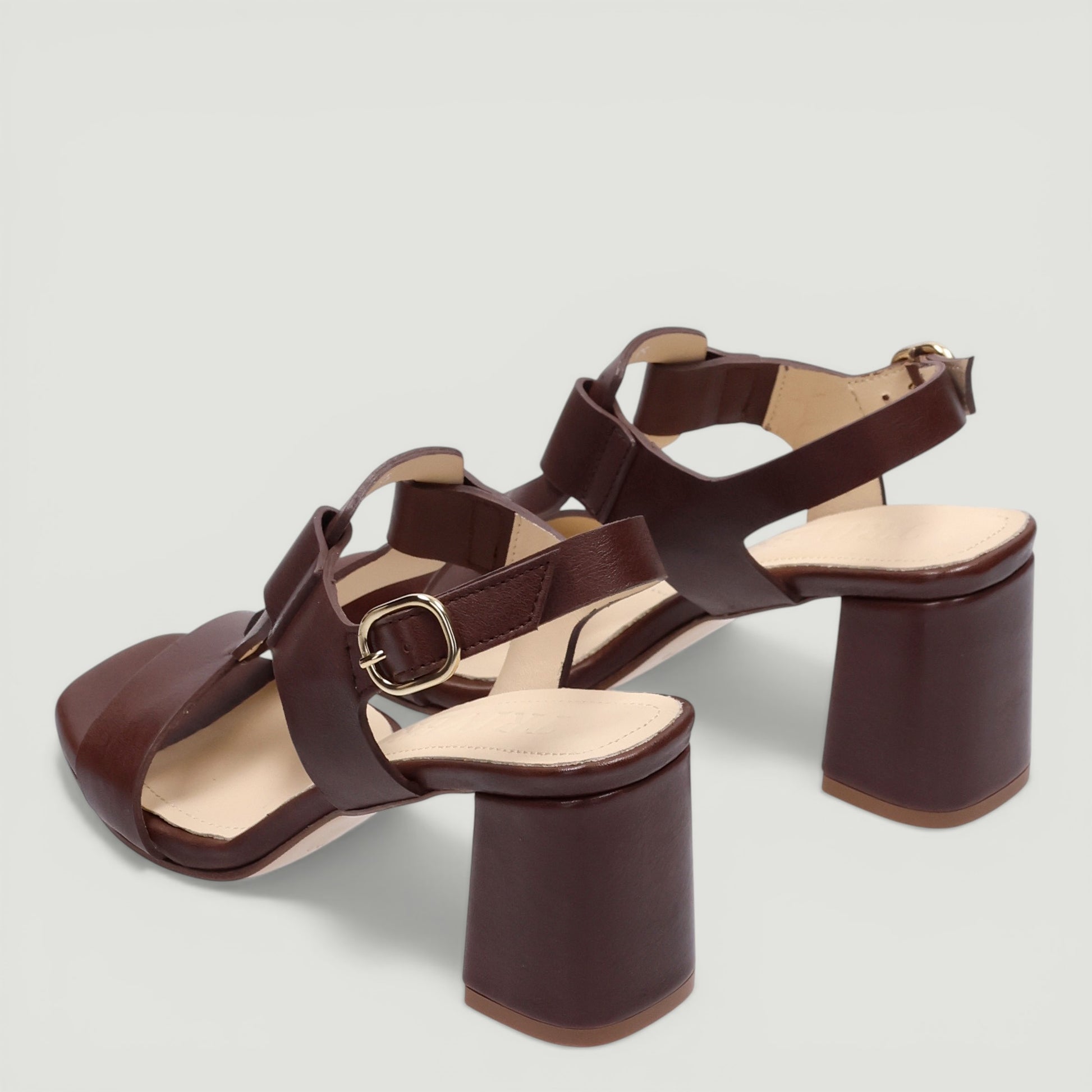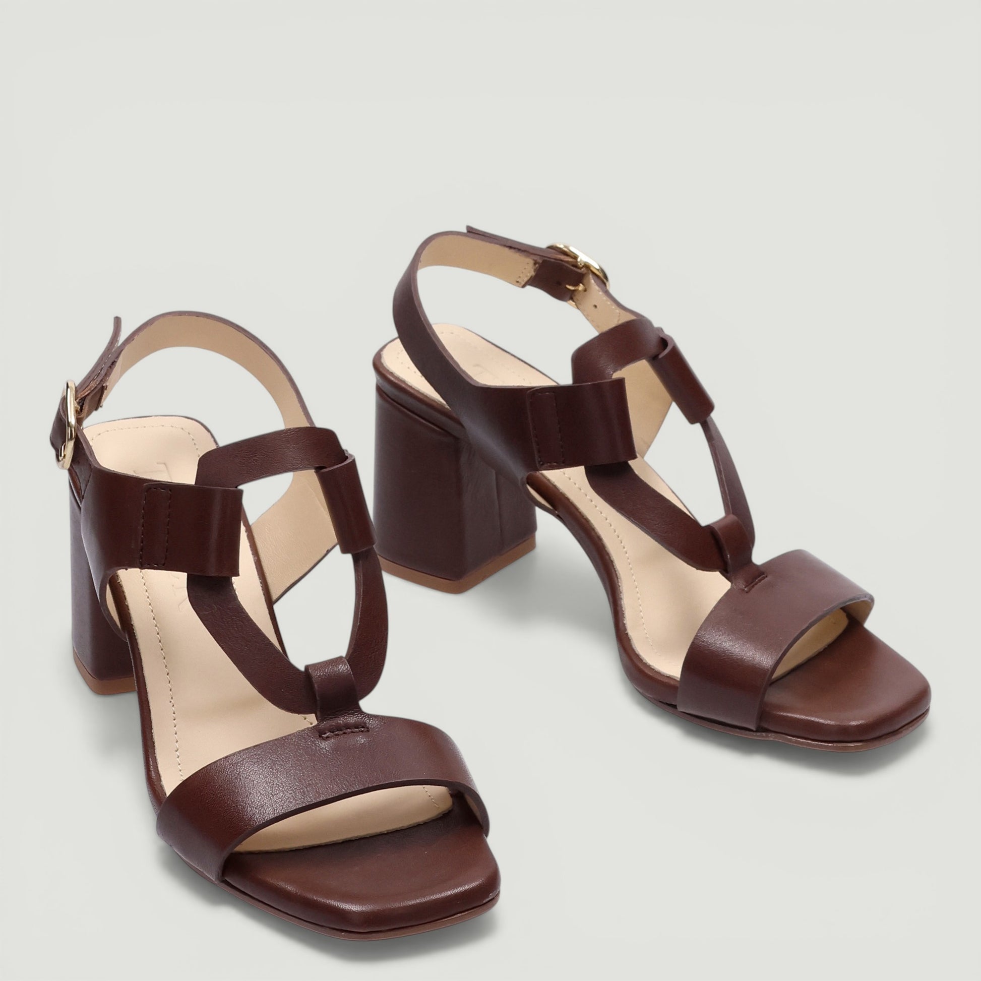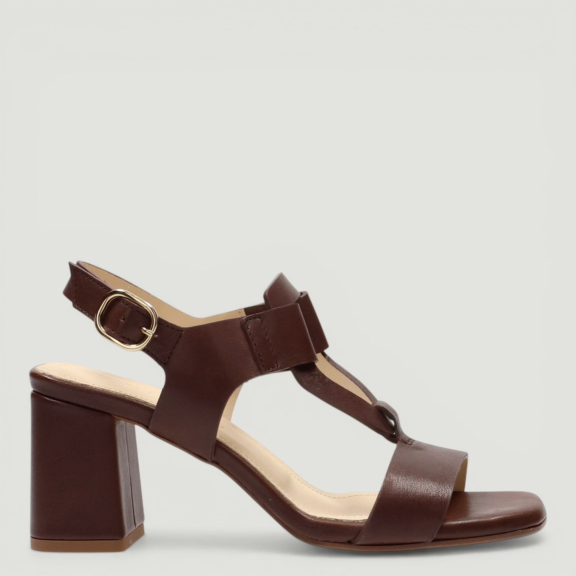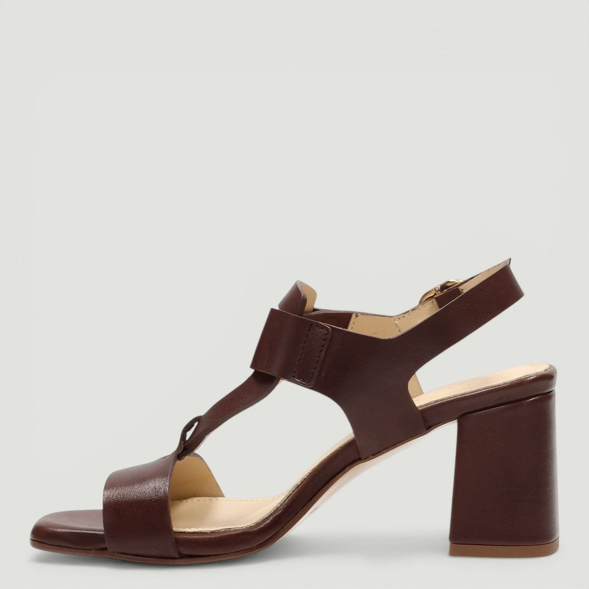 Sandalo in pelle testa di moro. Cinturino alla caviglia regolabile con fibbia dorata. Interno in pelle. Suola in gomma con tacco di 6 cm con plateau di 1 cm. Collezione Triver donna Prinavera/Estate.