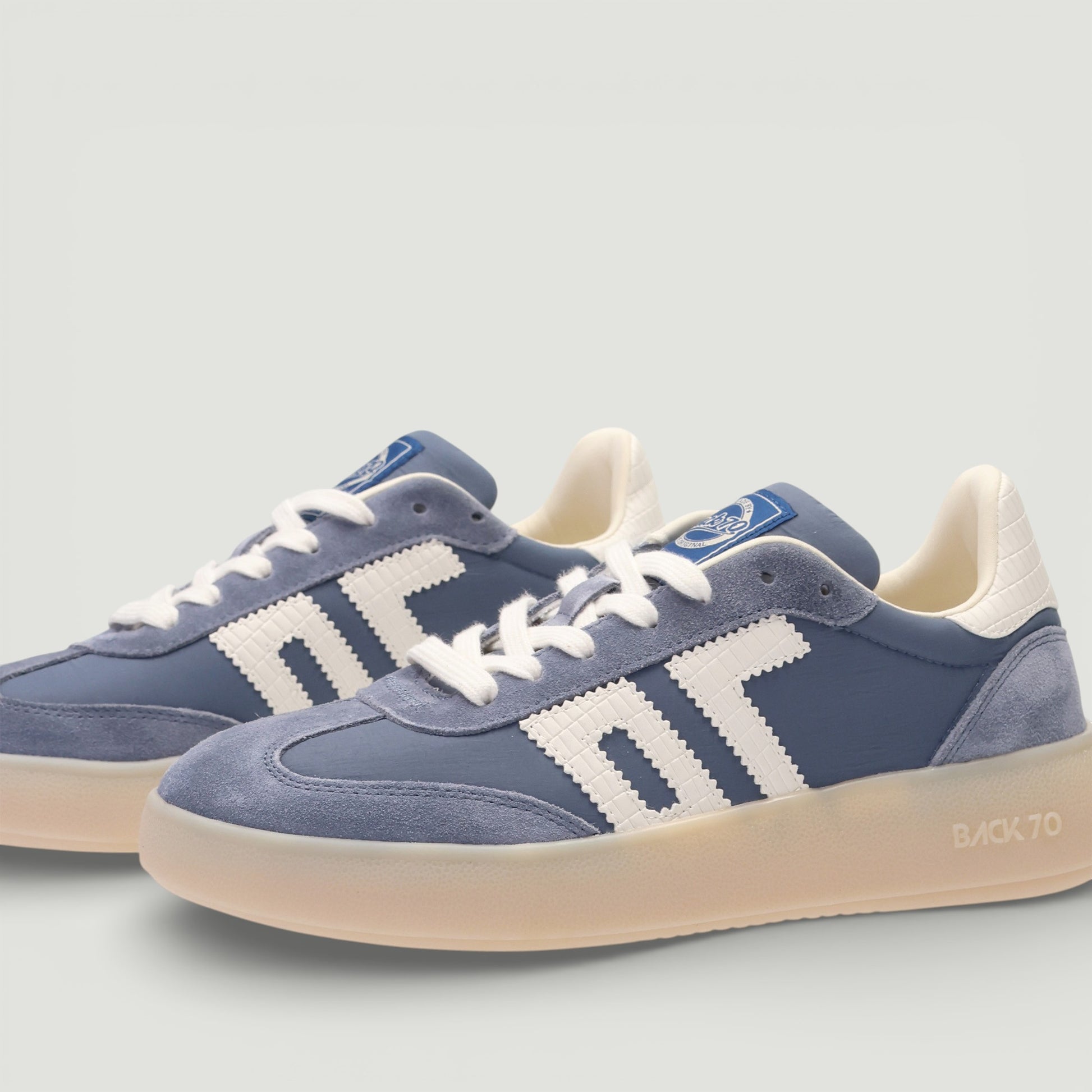 Sneakers in nylon azzurro con riporti in pelle scamosciata in tinta. Logo laterale in pelle stampata cocco bianco. Chiusura tramite laccio di cotone. Interno in tessuto con sottopiede estraibile. Suola in gomma. Collezione Back 70 donna primavera/estate.