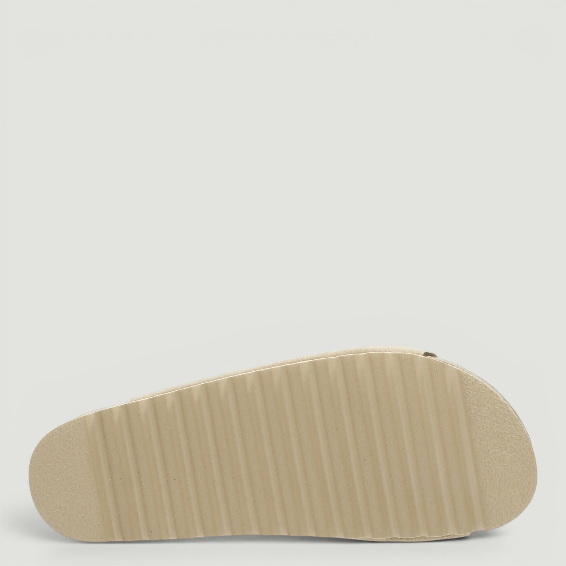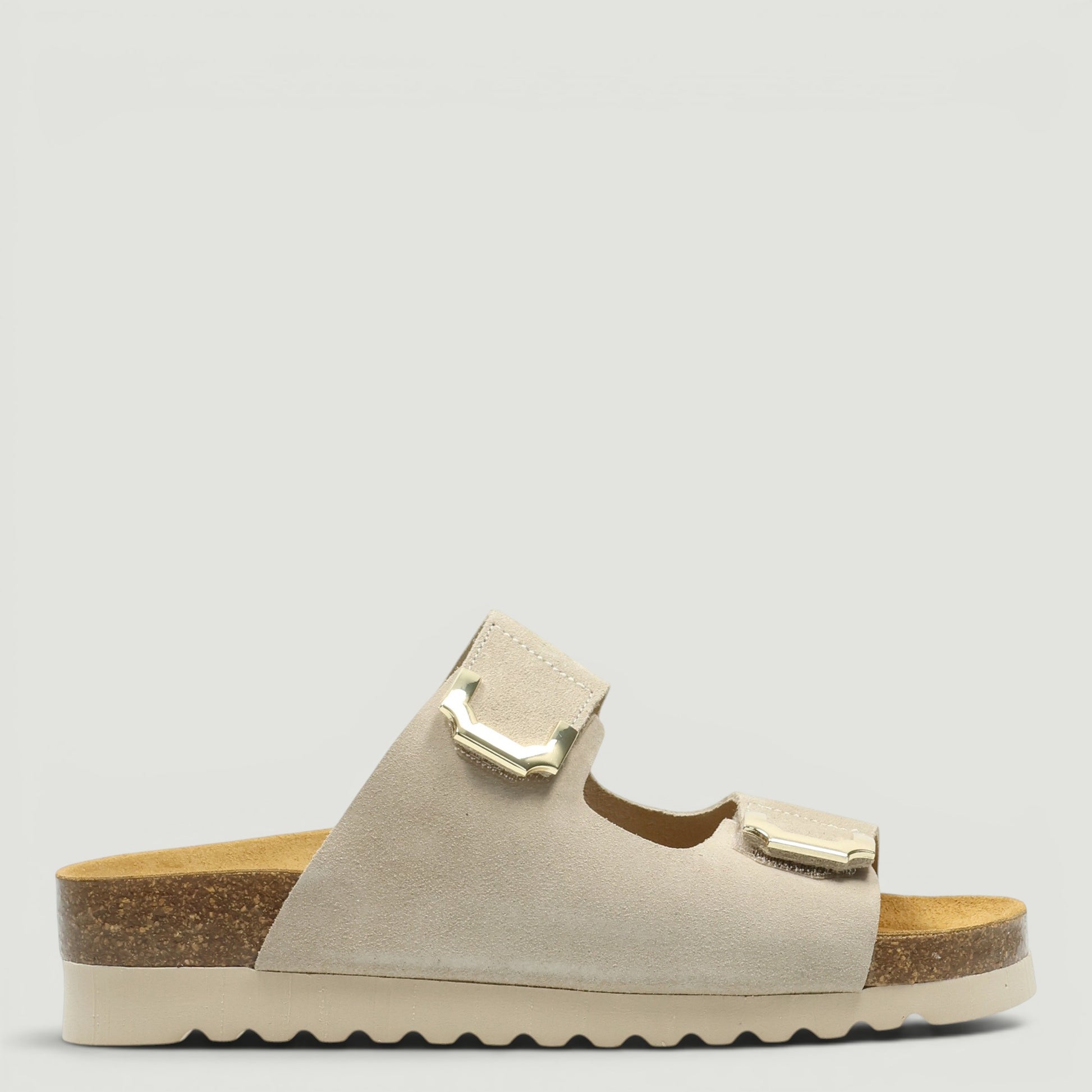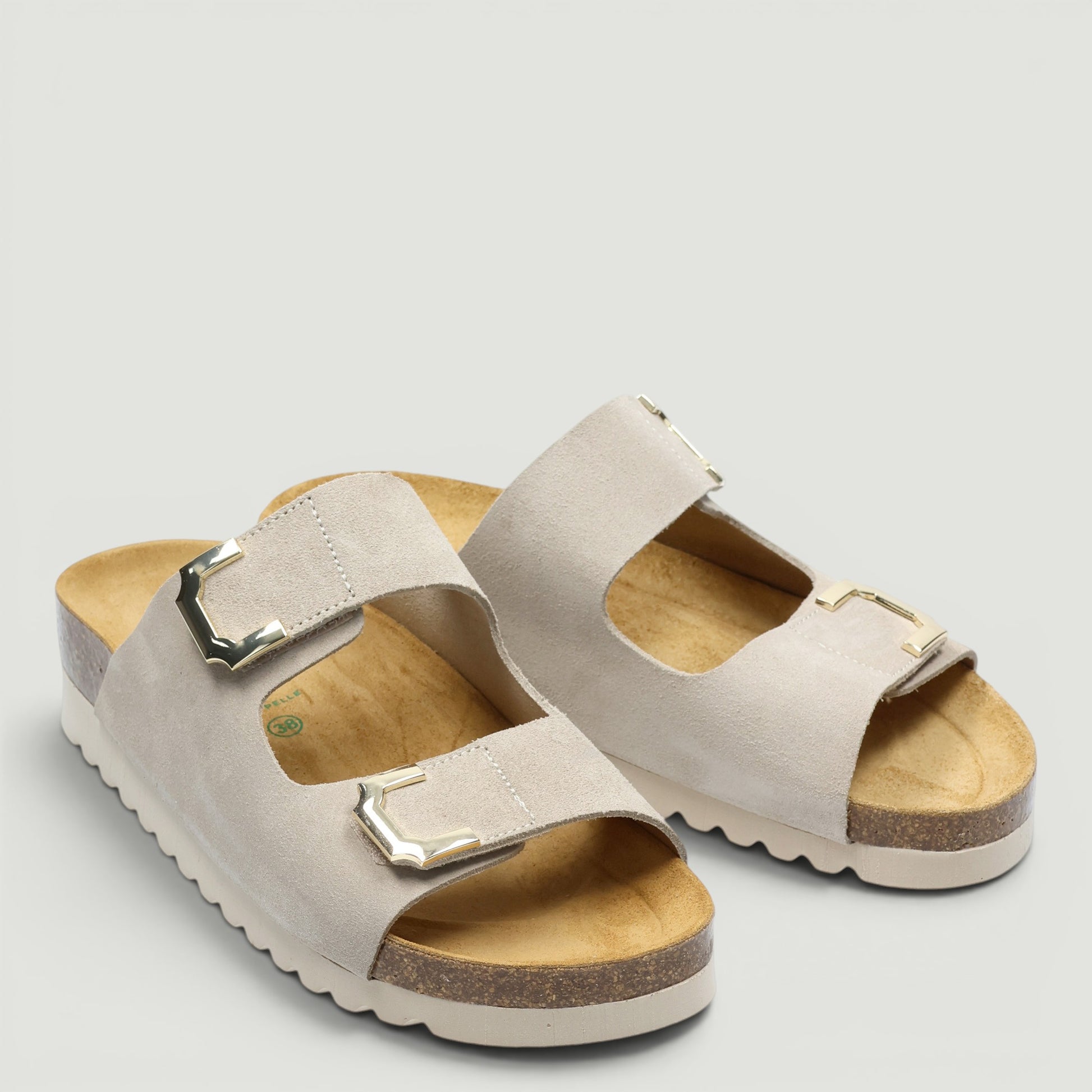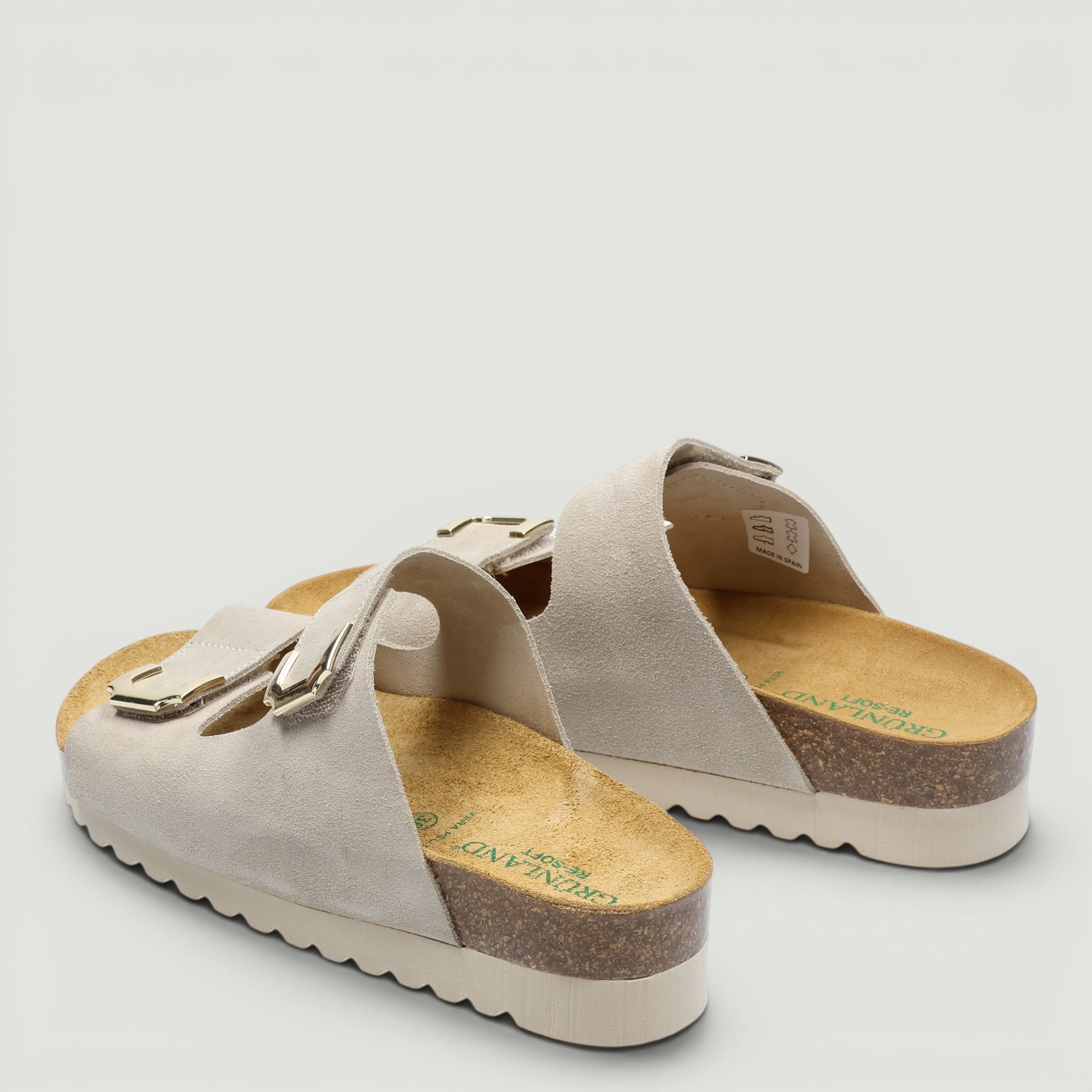 Ciabatta Grunland con tomaia in pelle scamosciata beige. Chiusura con doppio velcro in metallo dorato. Interno in pelle con sottopiede in pelle Re-Soft imbottito. Suola in gomma con zeppa di 3 cm. Collezione Grunland donna Primavera/Estate.