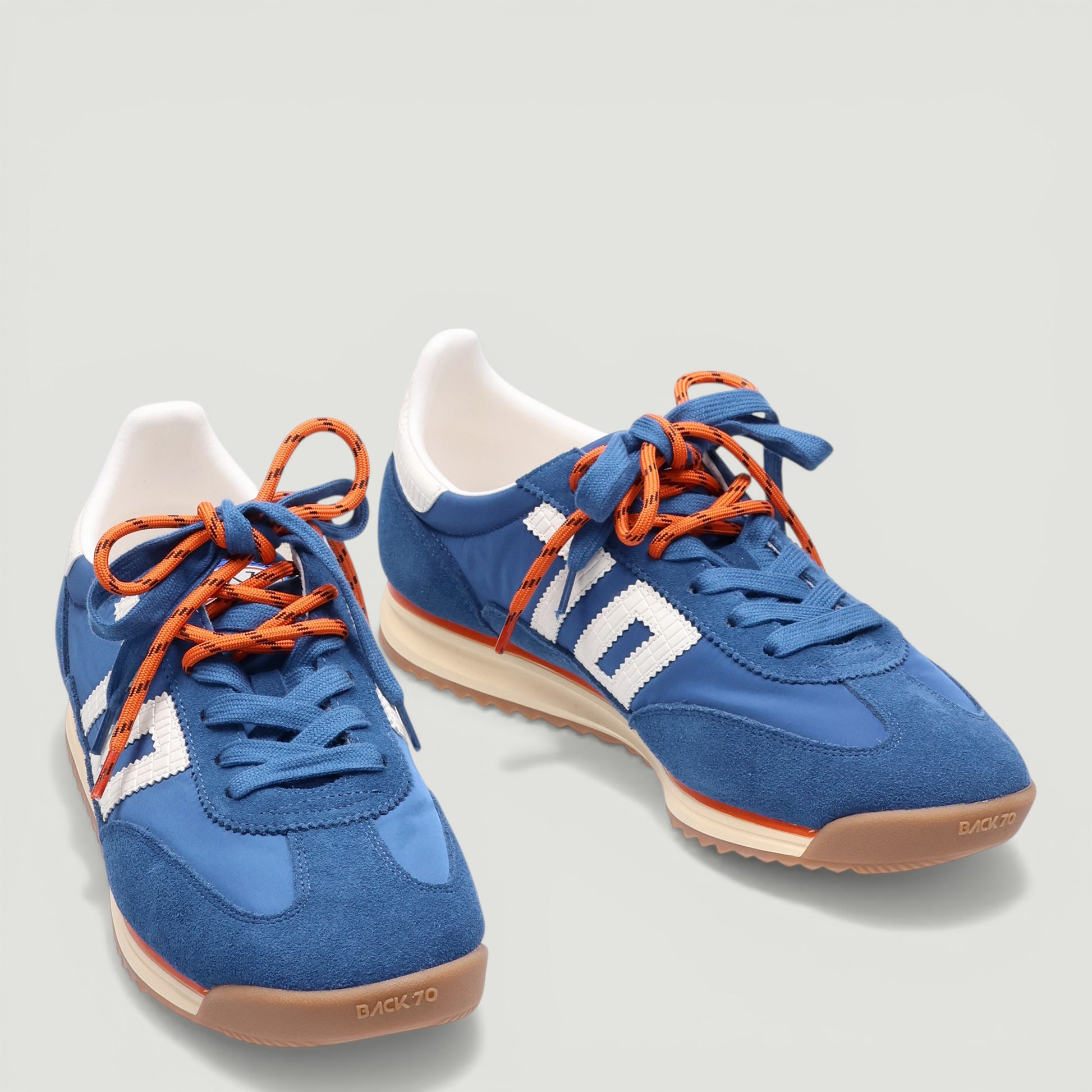Sneakers in nylon blu con riporti in pelle scamosciata in tinta. Logo laterale in pelle stampata cocco bianco. Chiusura tramite laccio di cotone con laccio supplementare arancio. Interno in tessuto con sottopiede estraibile. Suola in gomma. Collezione Back 70 uomo primavera/estate.
