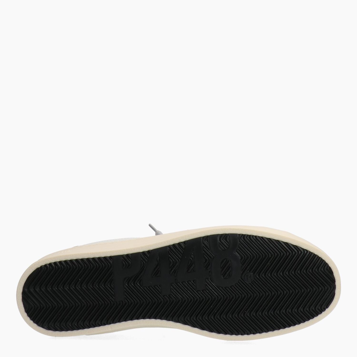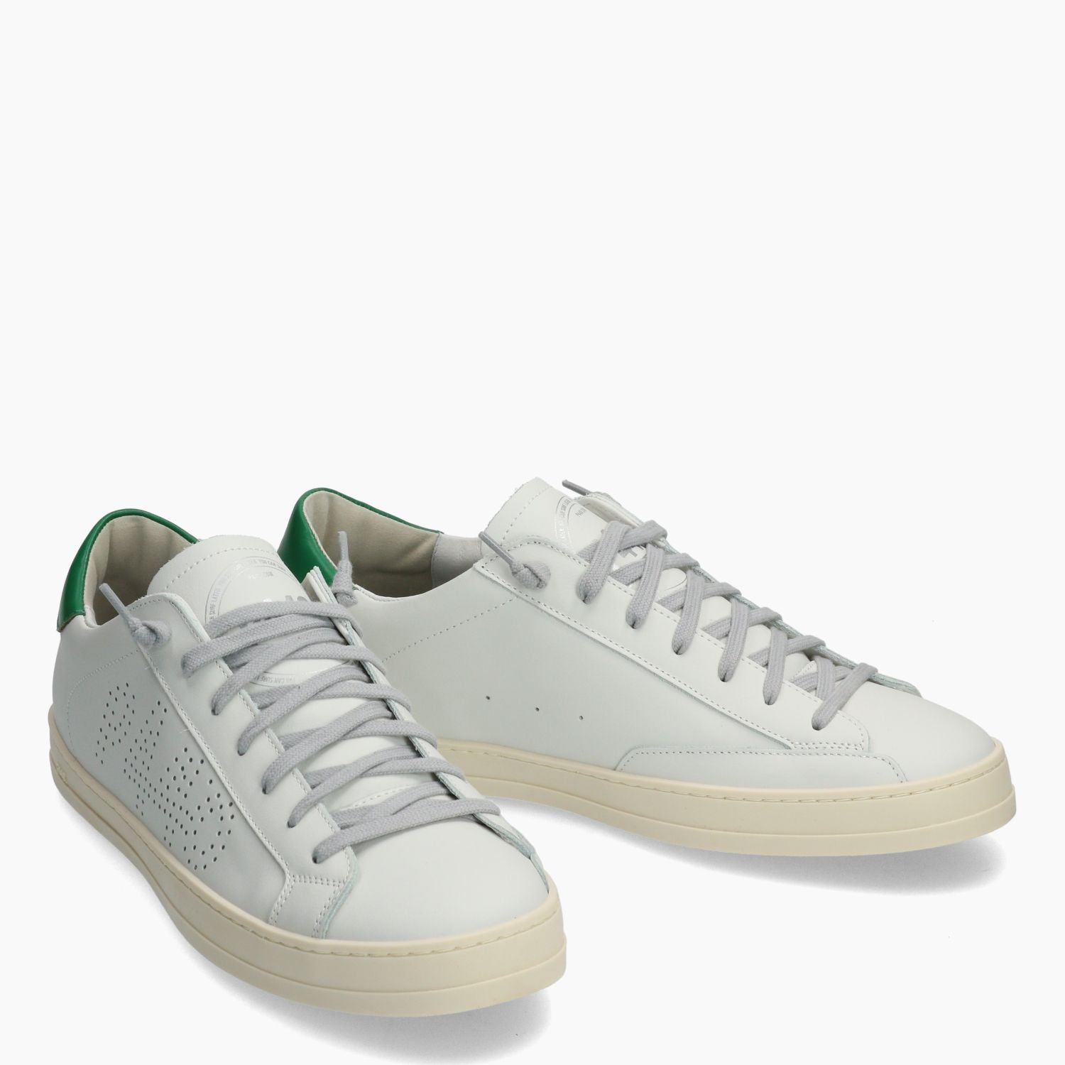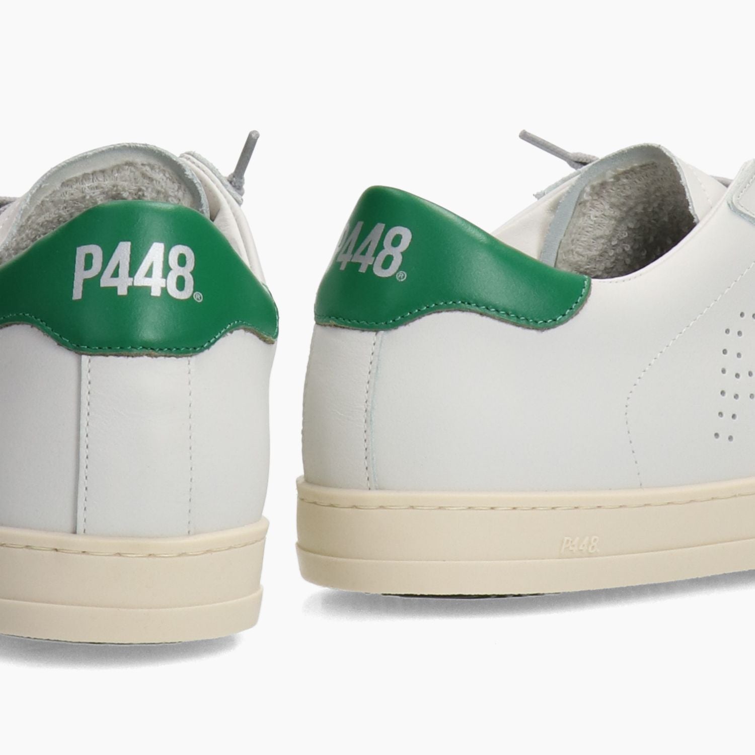 Sneakers P448 in pelle colore bianco con logo traforato a lato. Chiusura tramite lacci grigi. Linguetta con logo. Talloncino in pelle verde. Interno in tessuto e pelle con sottopiede estraibile. Suola in gomma. Collezione P448 uomo.