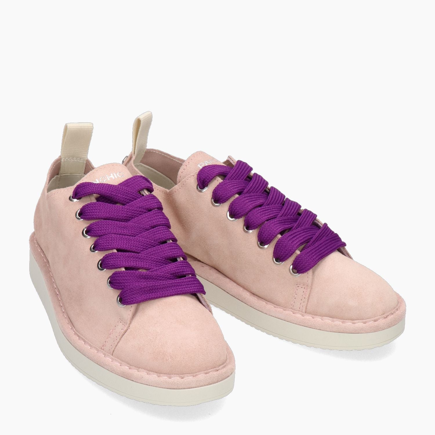 Sneakers in pelle scamosciata colore rosa. Chiusura con lacci in colore viola con laccio aggiuntivo in colore ecru. Interno in pelle. Soletta interna rimovibile. Suola in gomma di 3 cm. Collezione Panchic donna Primavera/Estate.