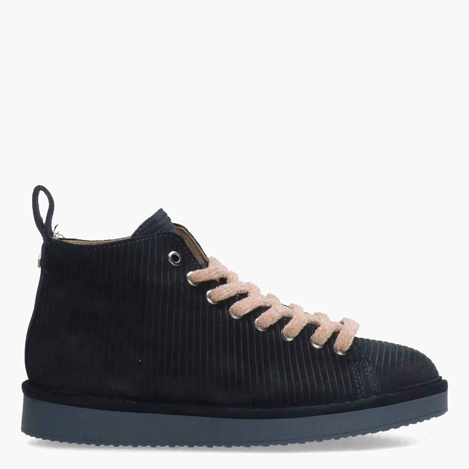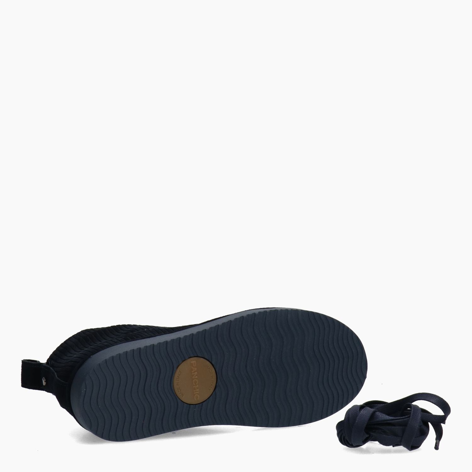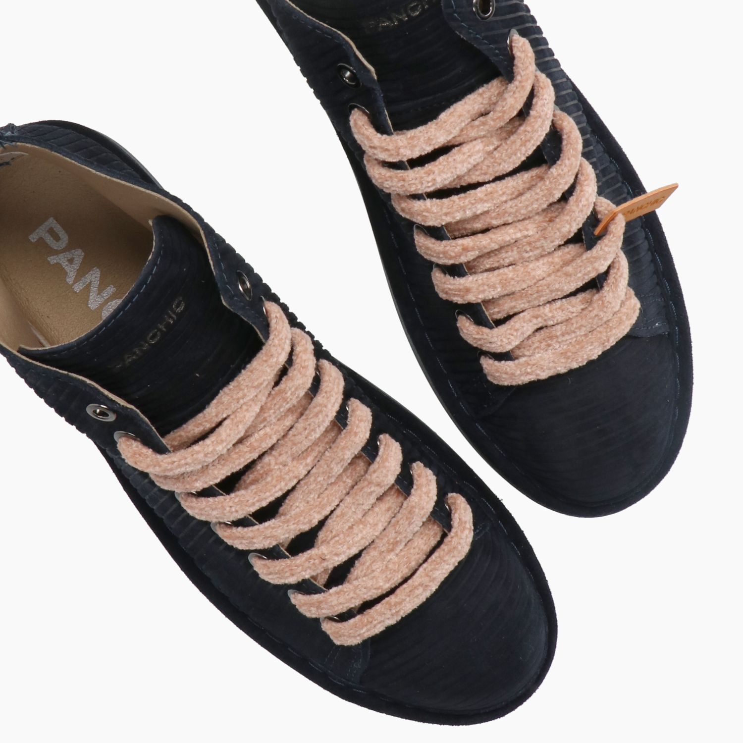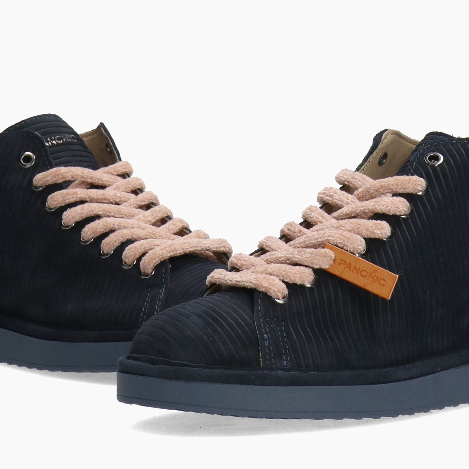 Polacchino in camoscio blu lavorato a coste. Chiusura con lacci in colore rosa melange effetto ciniglia. Lacci di ricambio in colore blu. Interno in ecopelle con sottopiede estraibile. Suola in gomma in colore blu di 3 cm. Collezione Panchic donna Autunno/Inverno.