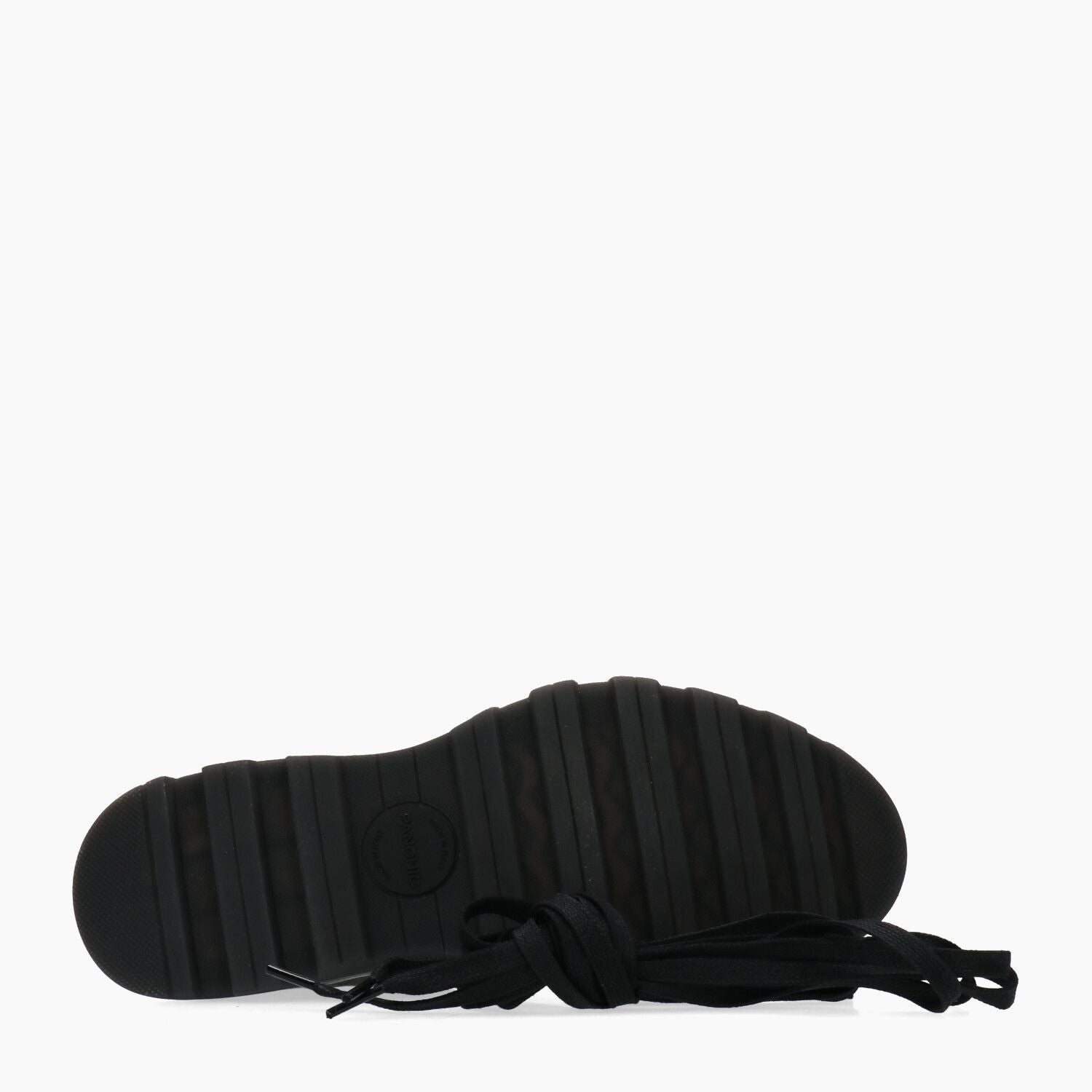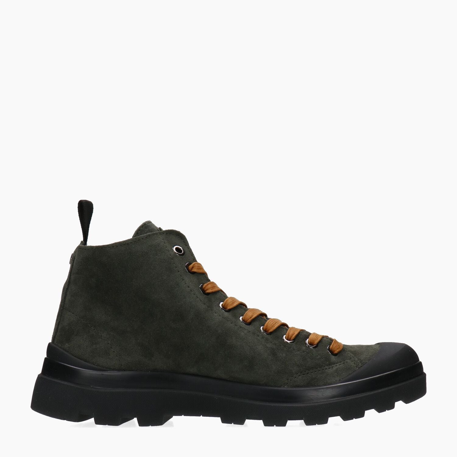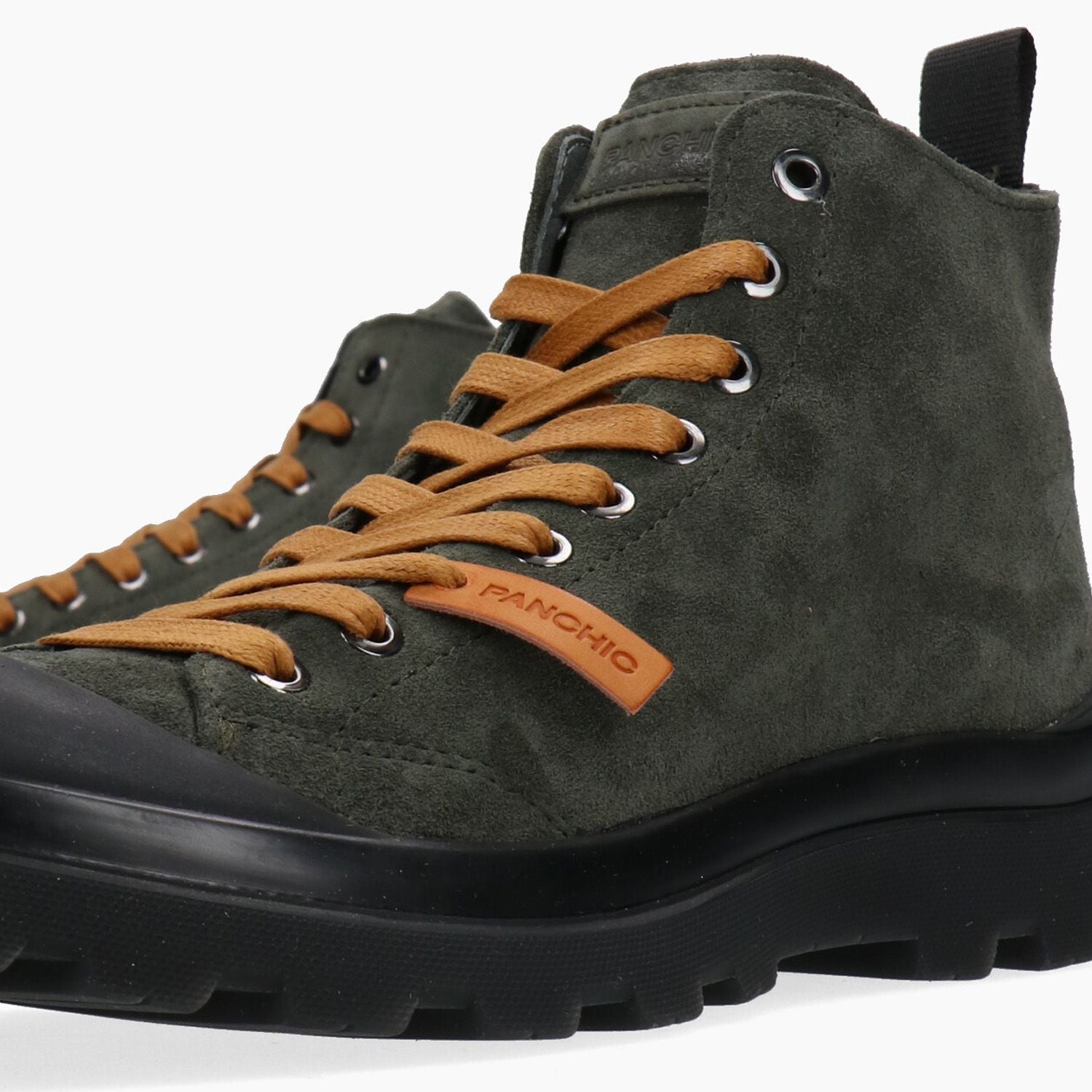 Pedula in camoscio verde militare. Punta tonda ricoperta in gomma colore nero. Chiusura con lacci in colore senape. Lacci di ricambio in tela cerata colore nero. Interno in pelle. Soletta interna rimovibile. Suola in gomma in colore nero di 3 cm. Collezione Panchic uomo Autunno/Inverno.
