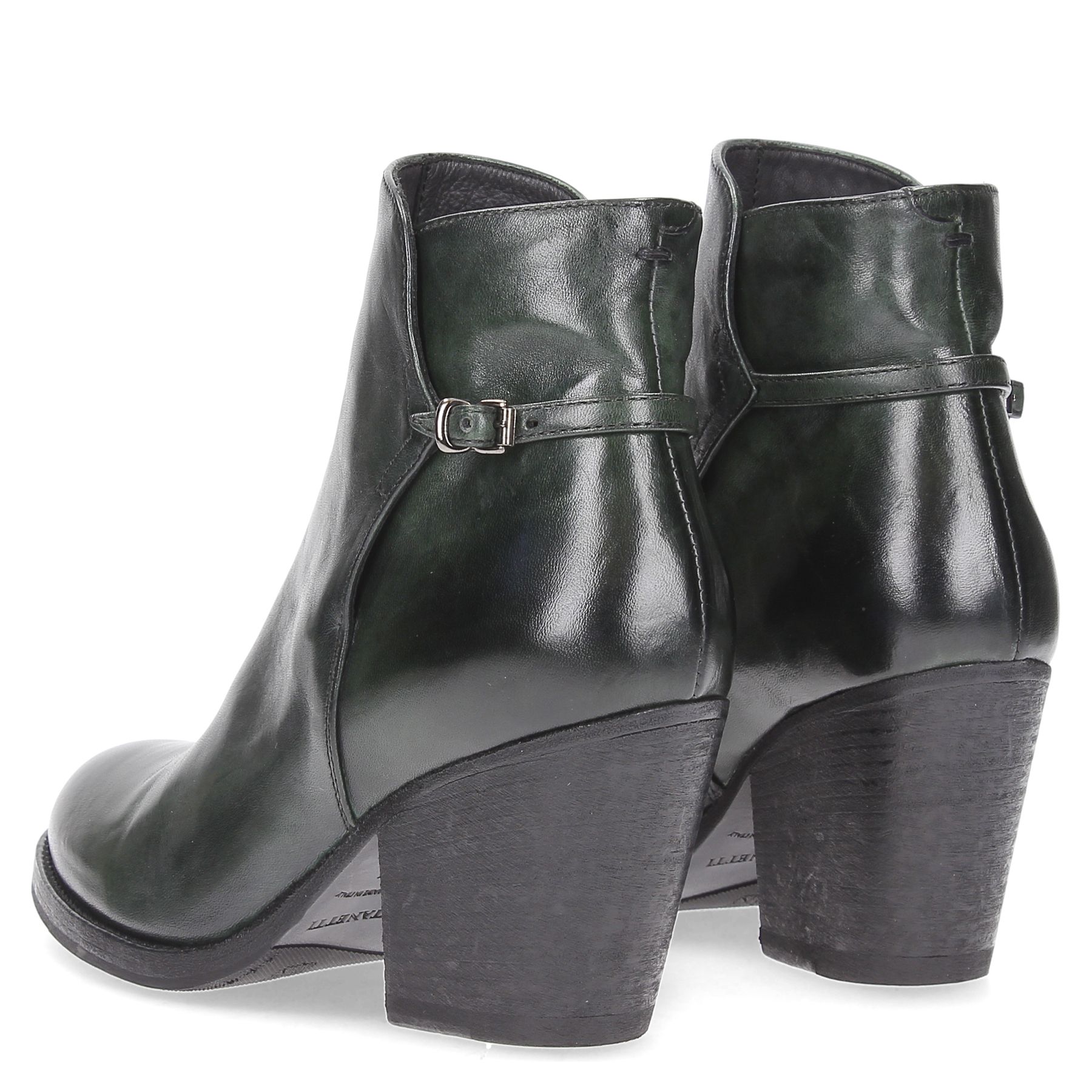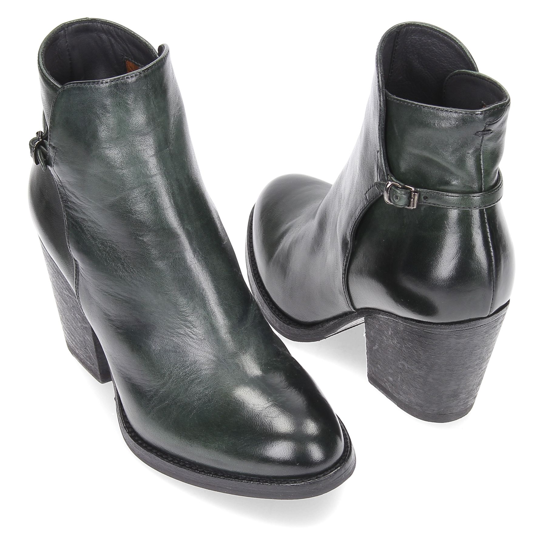 Tronchetti in pelle colore verde scuro, zip interna, tacco 60 fondo gomma.