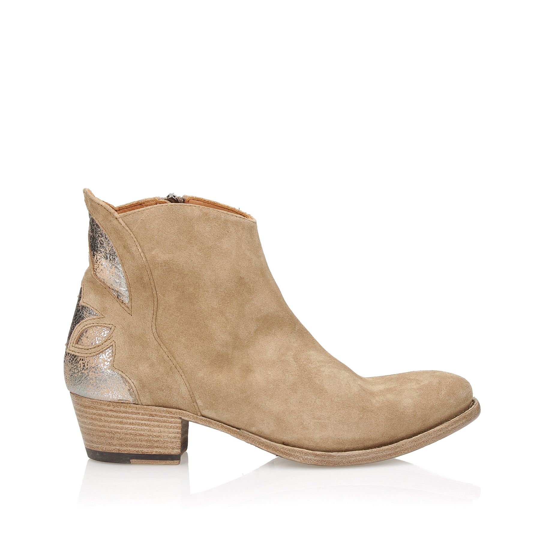Stivaletti texani in camoscio sabbia, zip interna, tacco 40 fondo cuoio cucito.