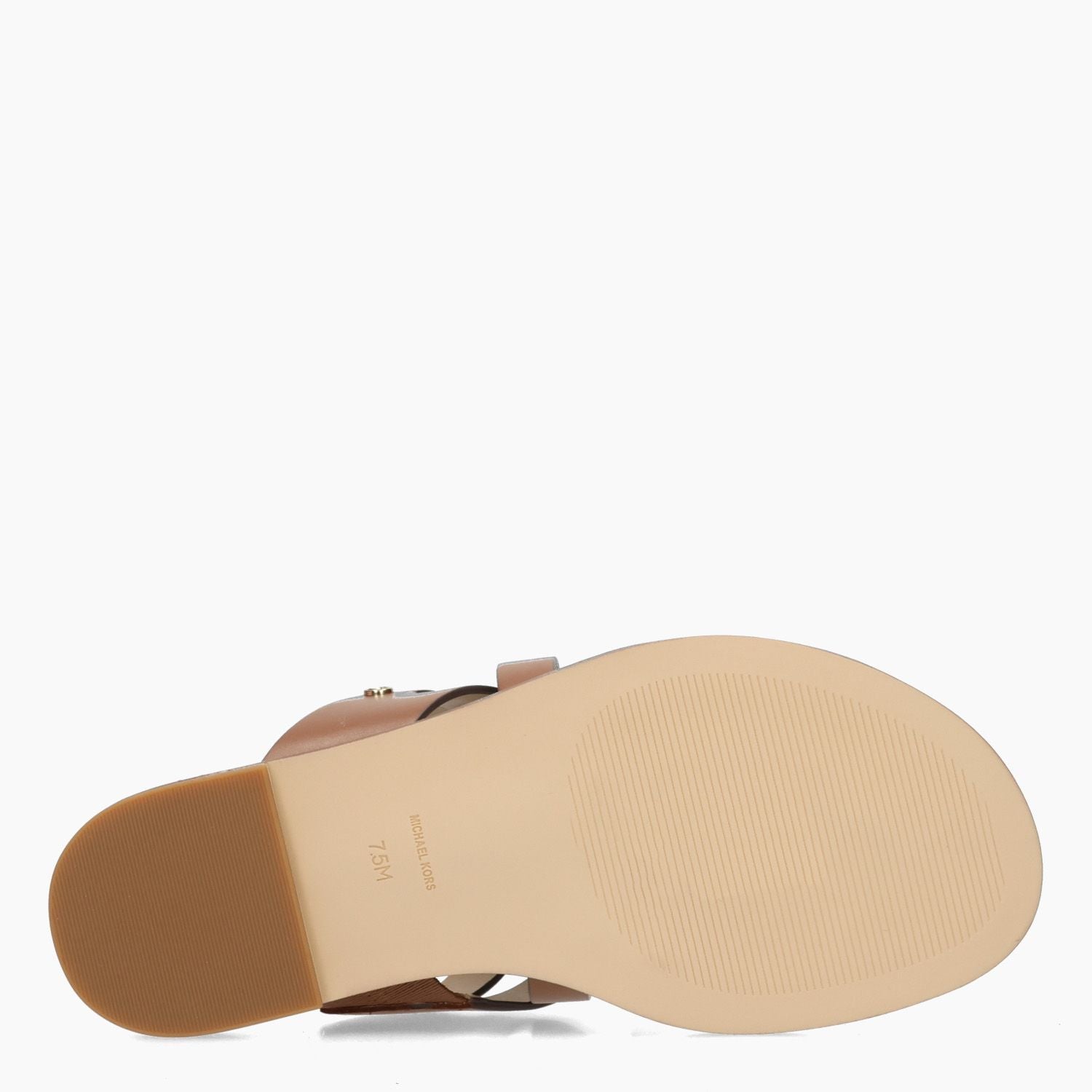 Ciabatta infradito in pelle color cuoio. Piccolo logo laterale in metallo dorato. Interno in pelle. Suola in gomma con tacco di 1,5 cm. Collezione Michael Kors donna Primavera/Estate.